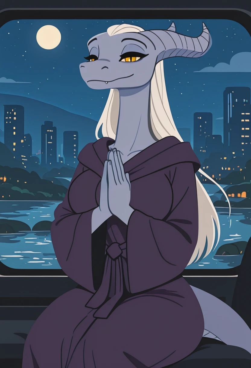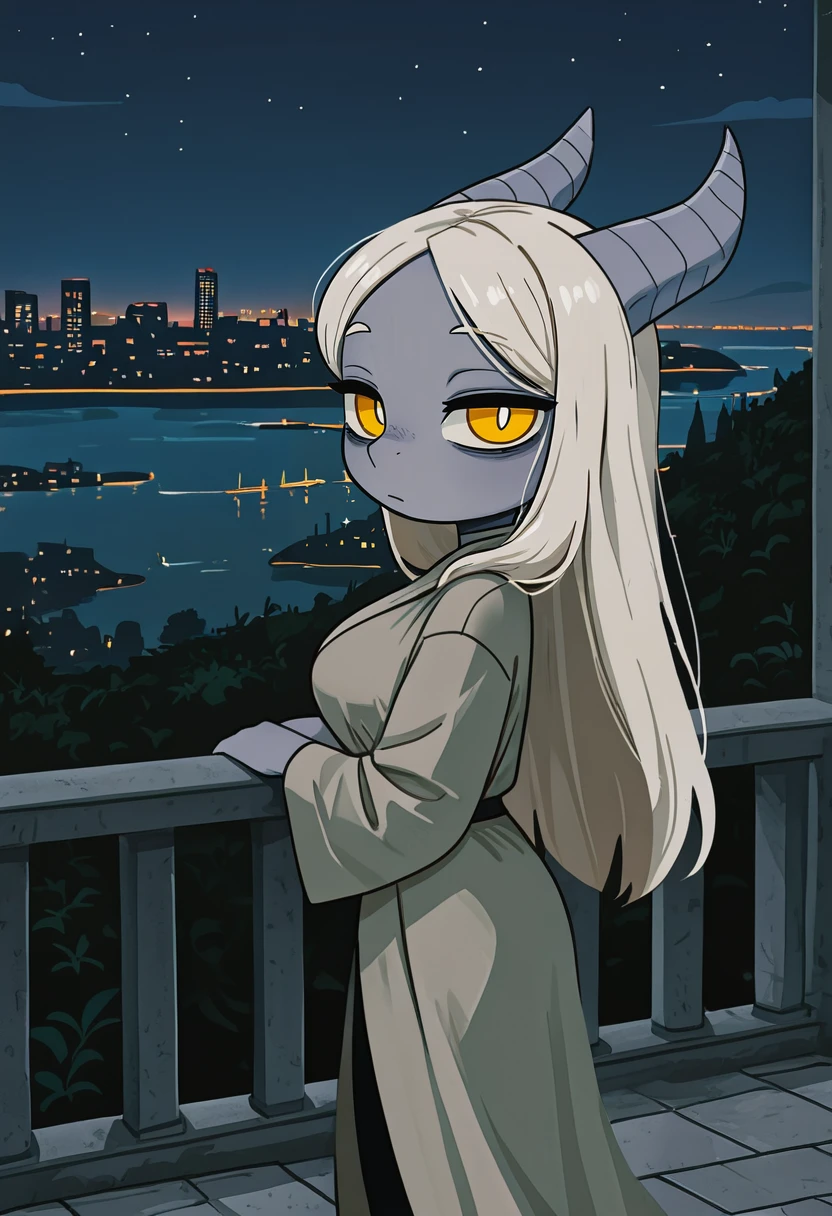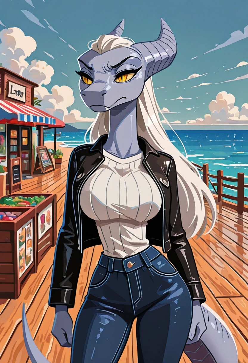 mis'alia_draako, grey skin, white hair, yellow eyes, black pupils, large breasts,