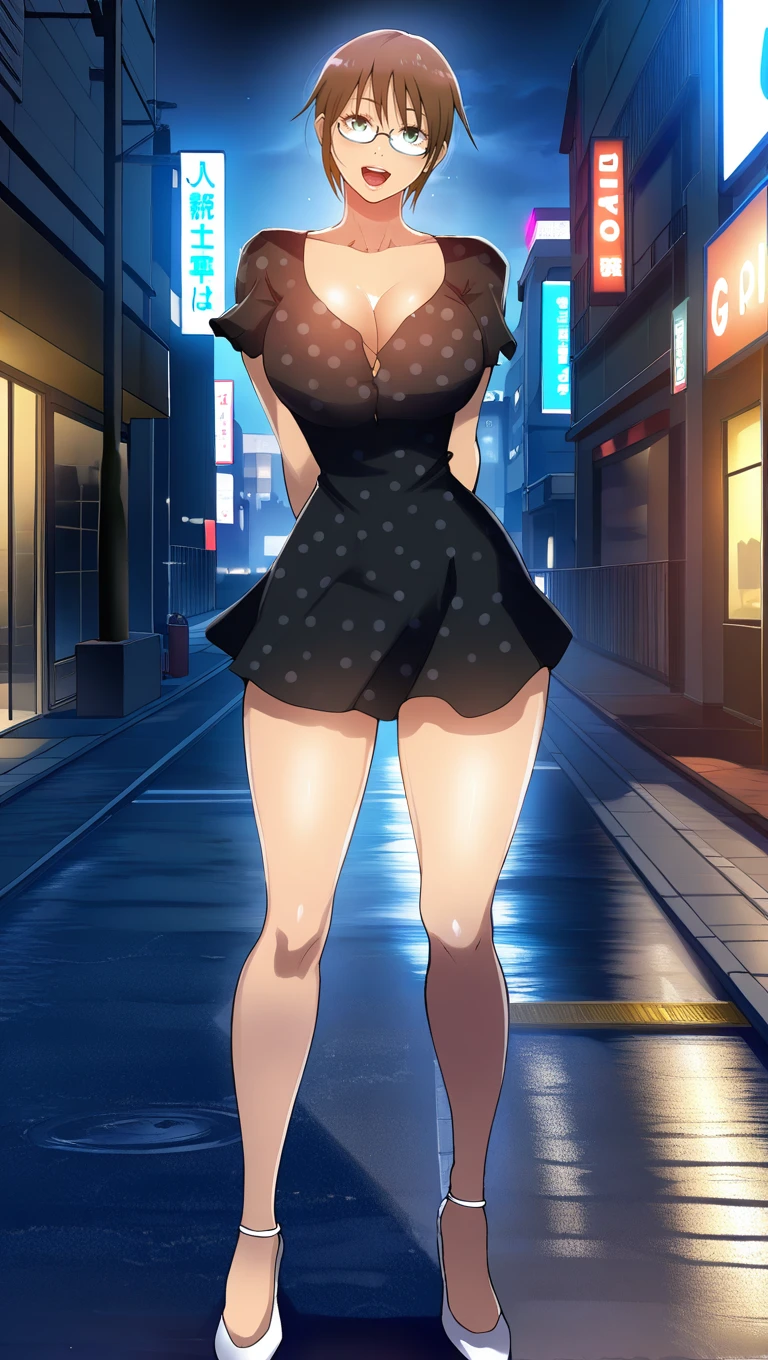 date outfit, black dress, spotted dress, polka dot, high heels, white heels, breasts, large breasts, cleavage, short dress,