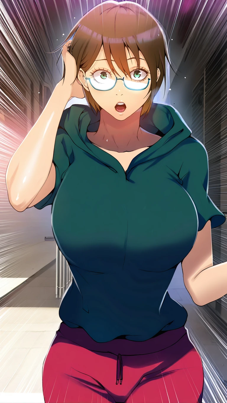 casual outfit, green sweatshirt, short sleeves, red pants, breasts, large breasts, hoodie,