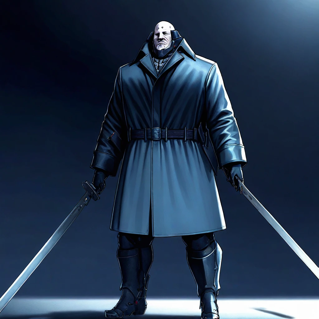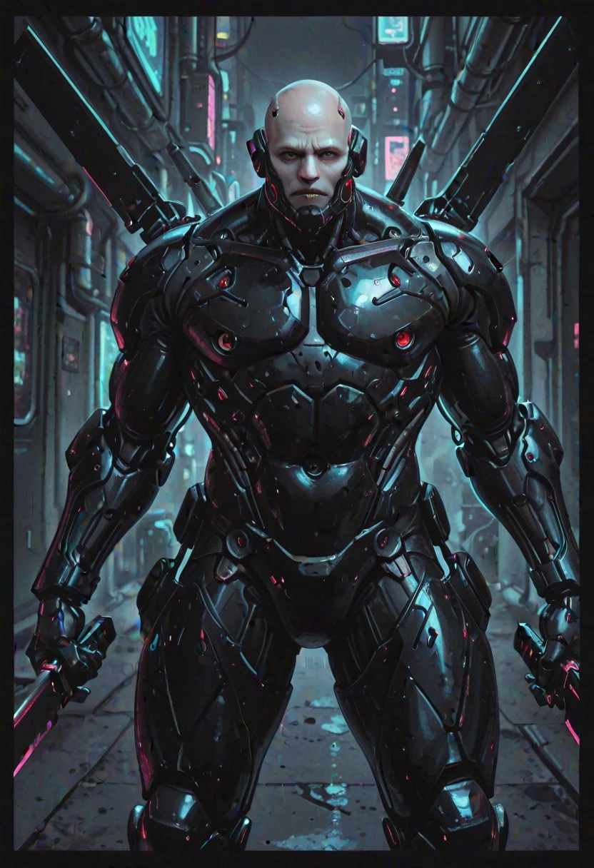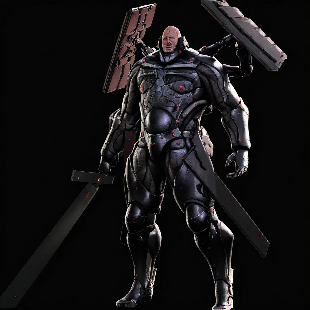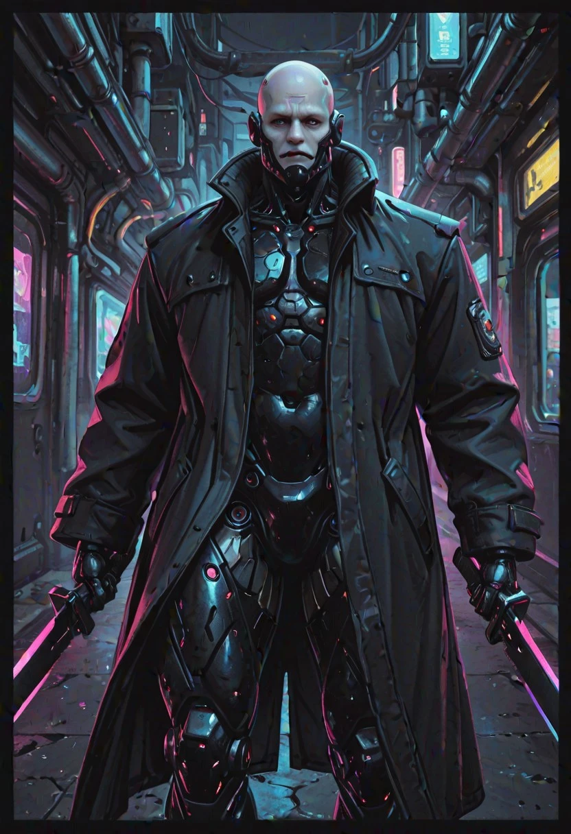 ,bald, power armor, long jacket,