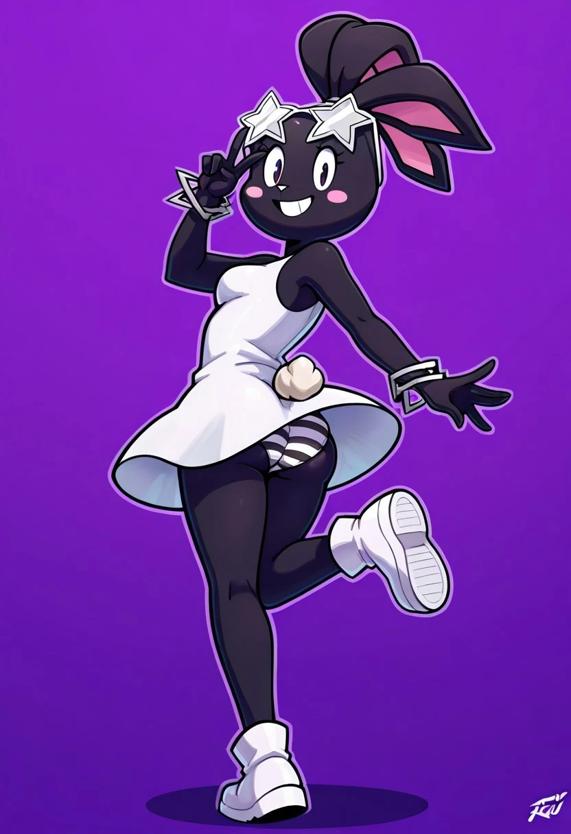 star-shaped eyewear, bracelets, white dress, sleeveless dress, striped panties, white shoes