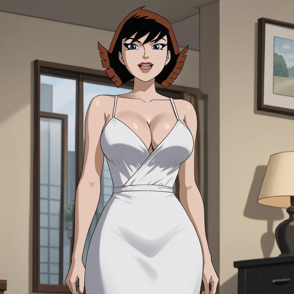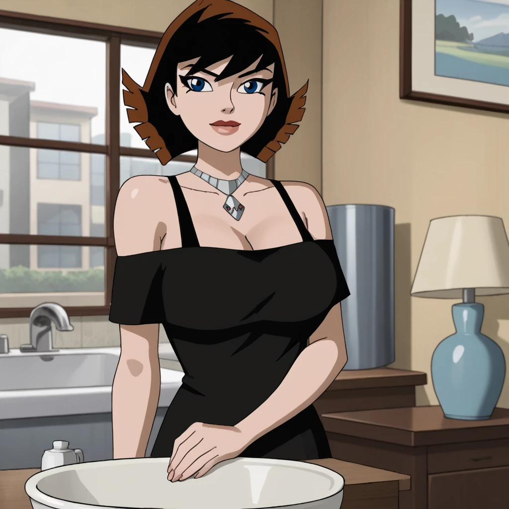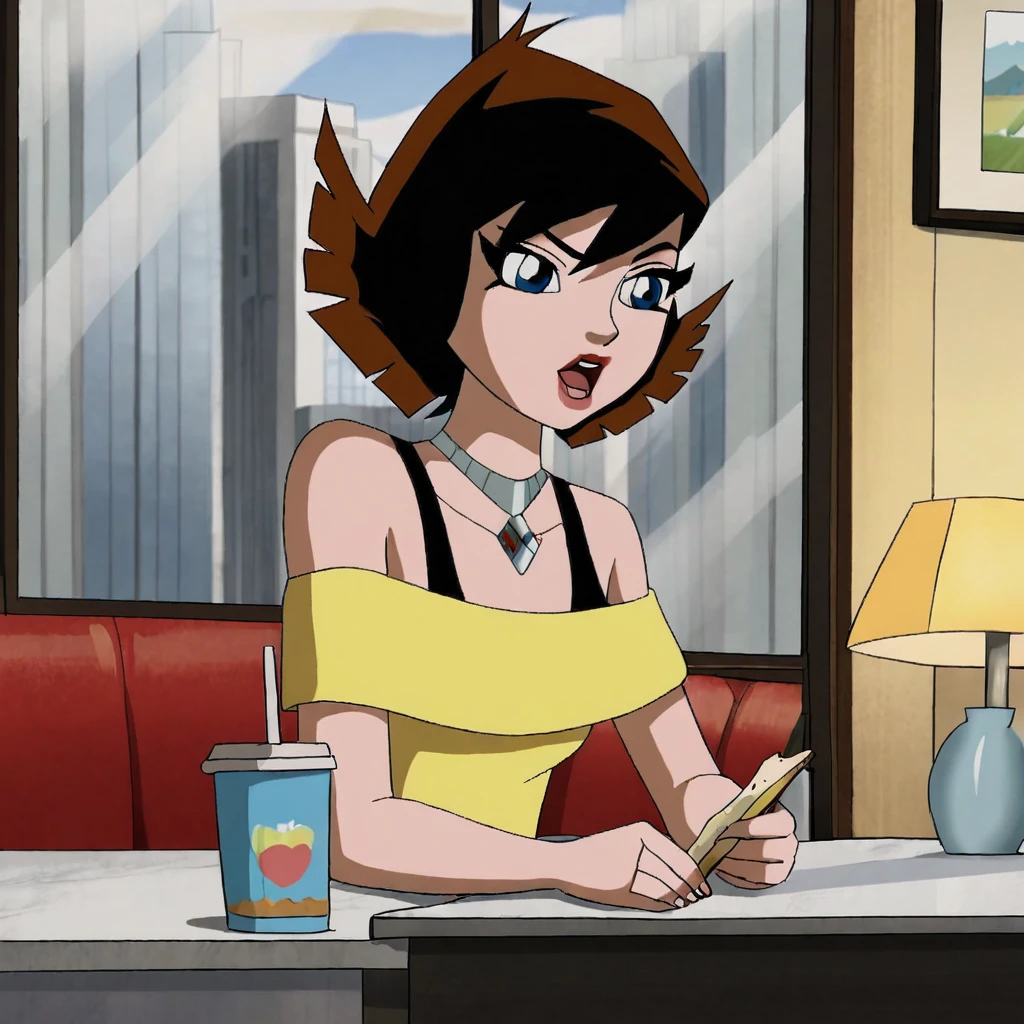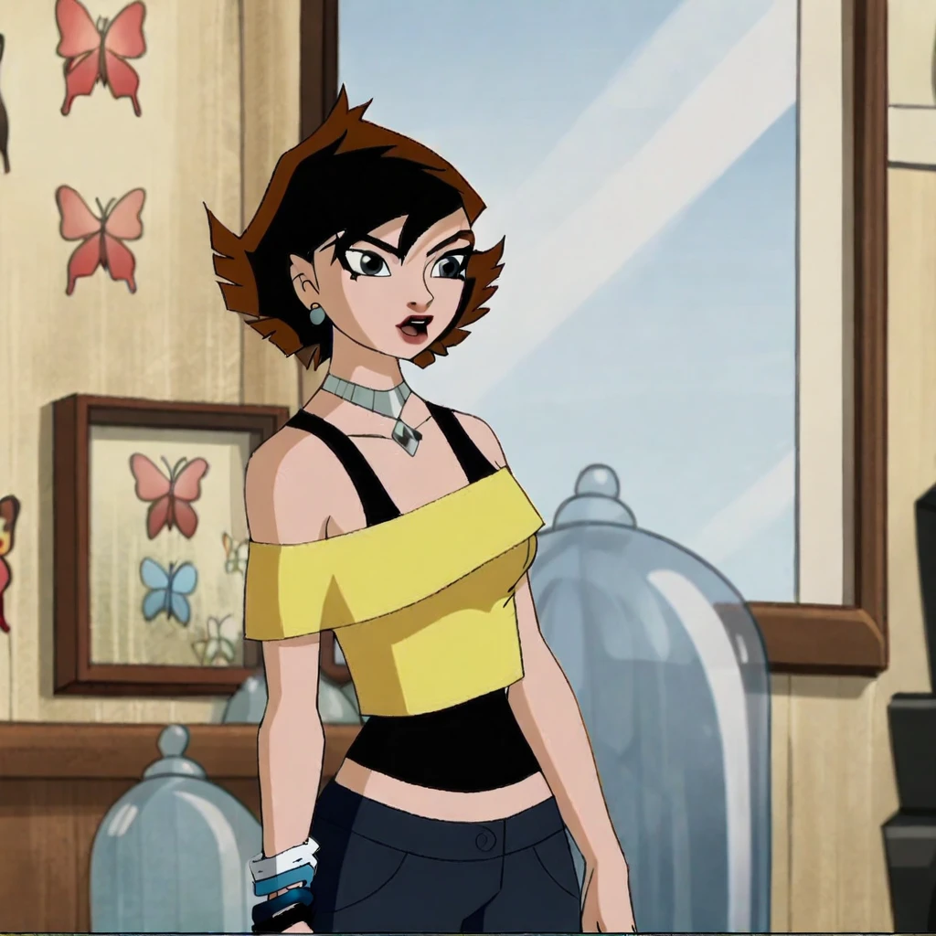 Trigger : janetemh, 1girl, blue eyes, short hair, choker, bare shoulders, black hair, off shoulder, jewelry, necklace, multicolored hair, brown hair, retro artstyle