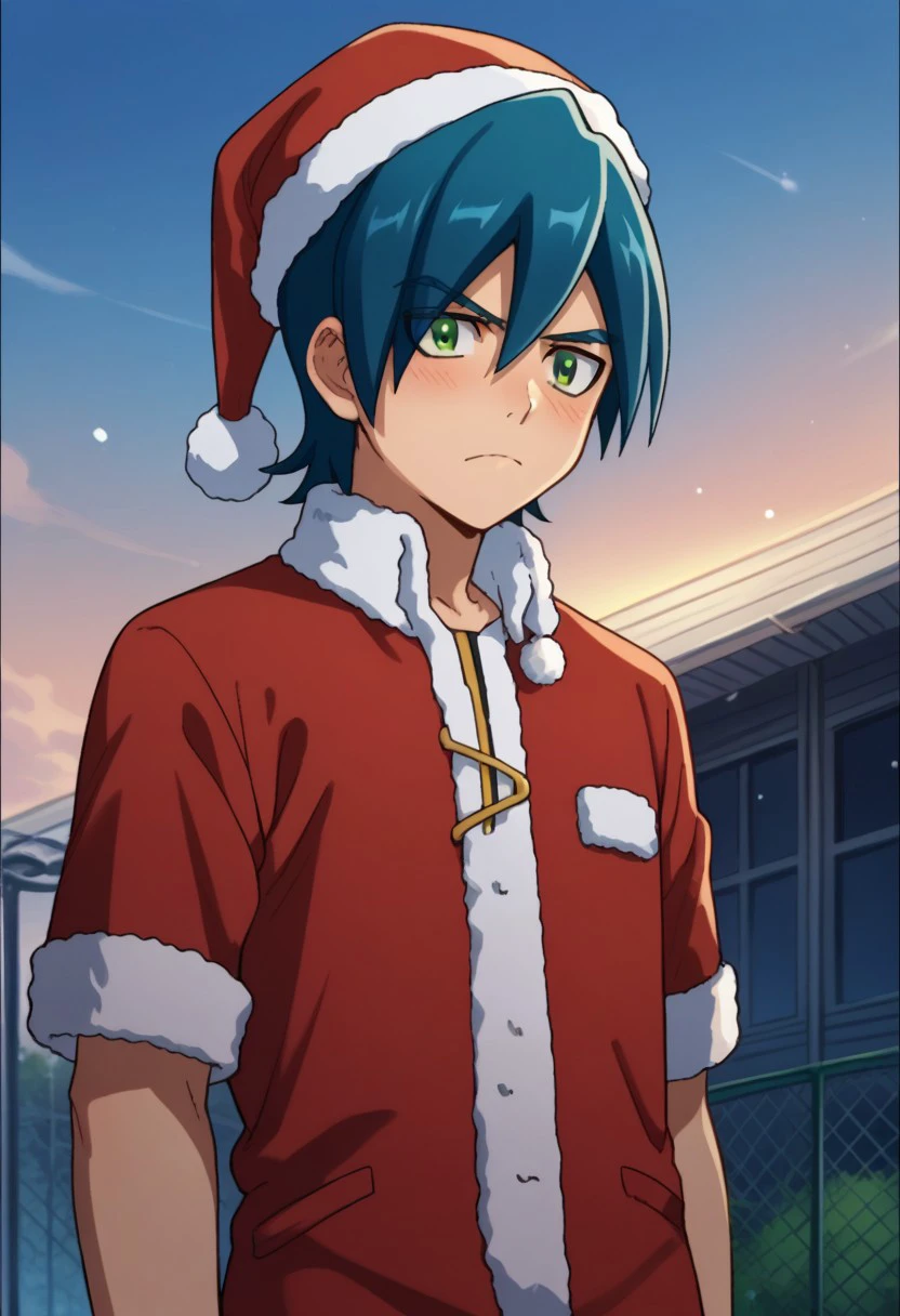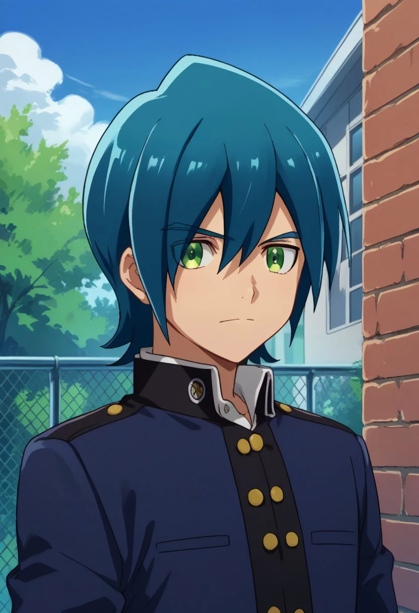 hayato, solo, 1boy, male focus, green eyes, blue hair, school uniform, gakuran,