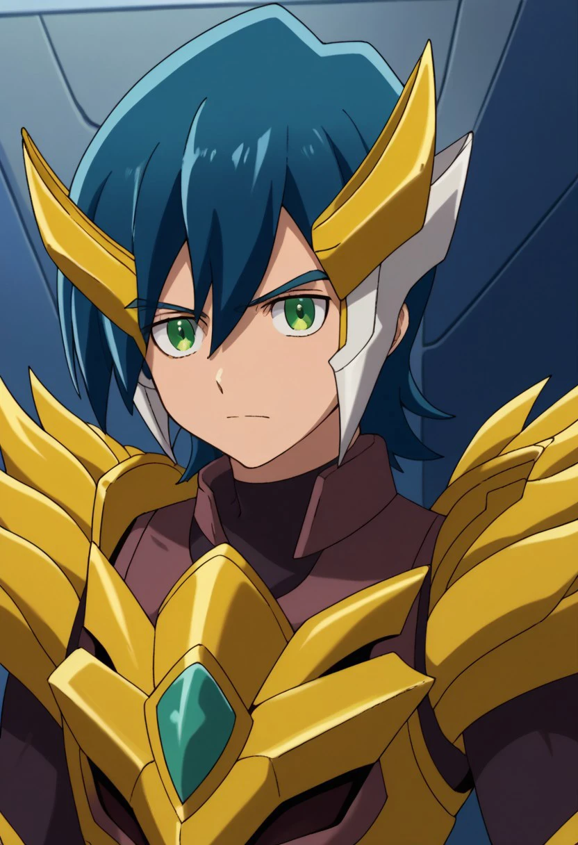 hayato, solo, 1boy, male focus, green eyes, blue hair, gaist yellow armor,