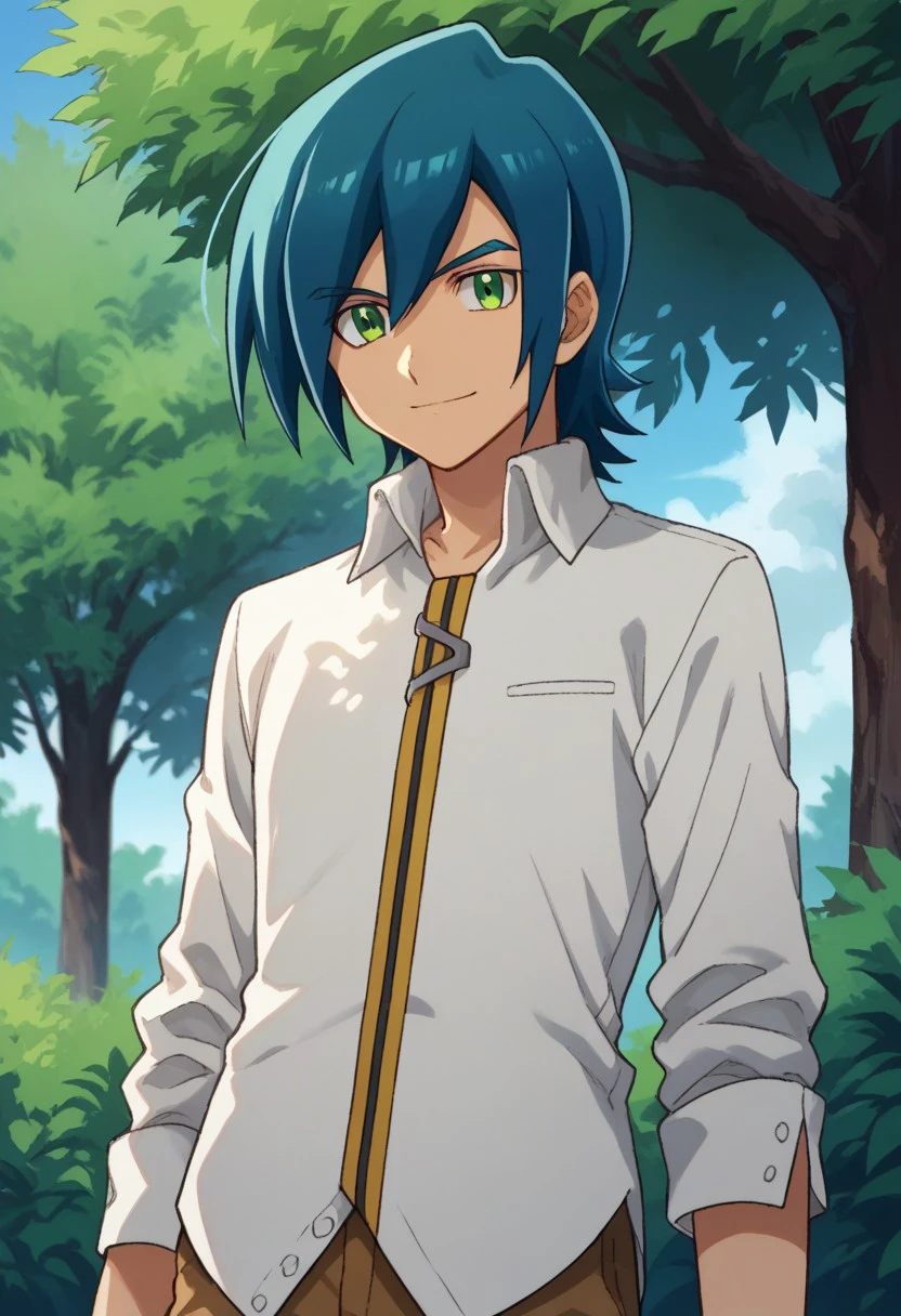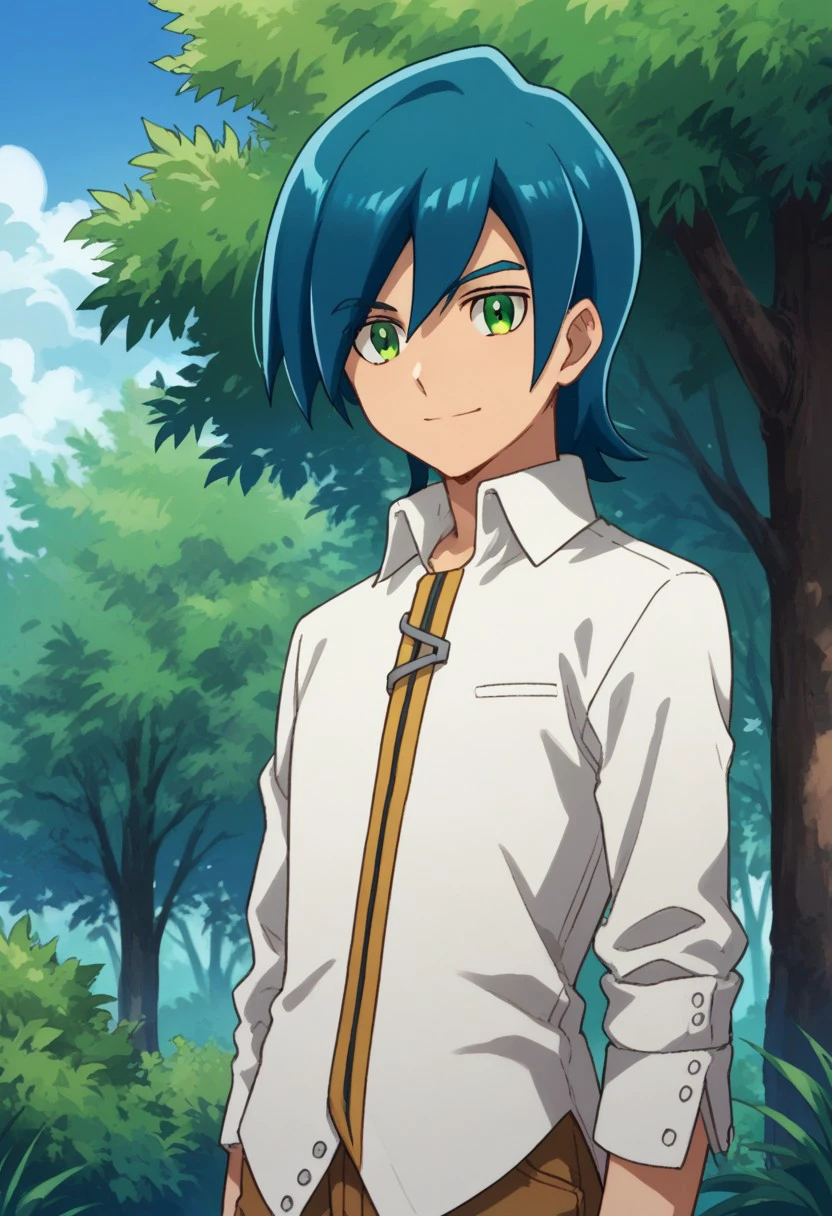 hayato, solo, 1boy, male focus, green eyes, blue hair, shirt, pants, brown pants, shoes, white shirt, brown footwear,