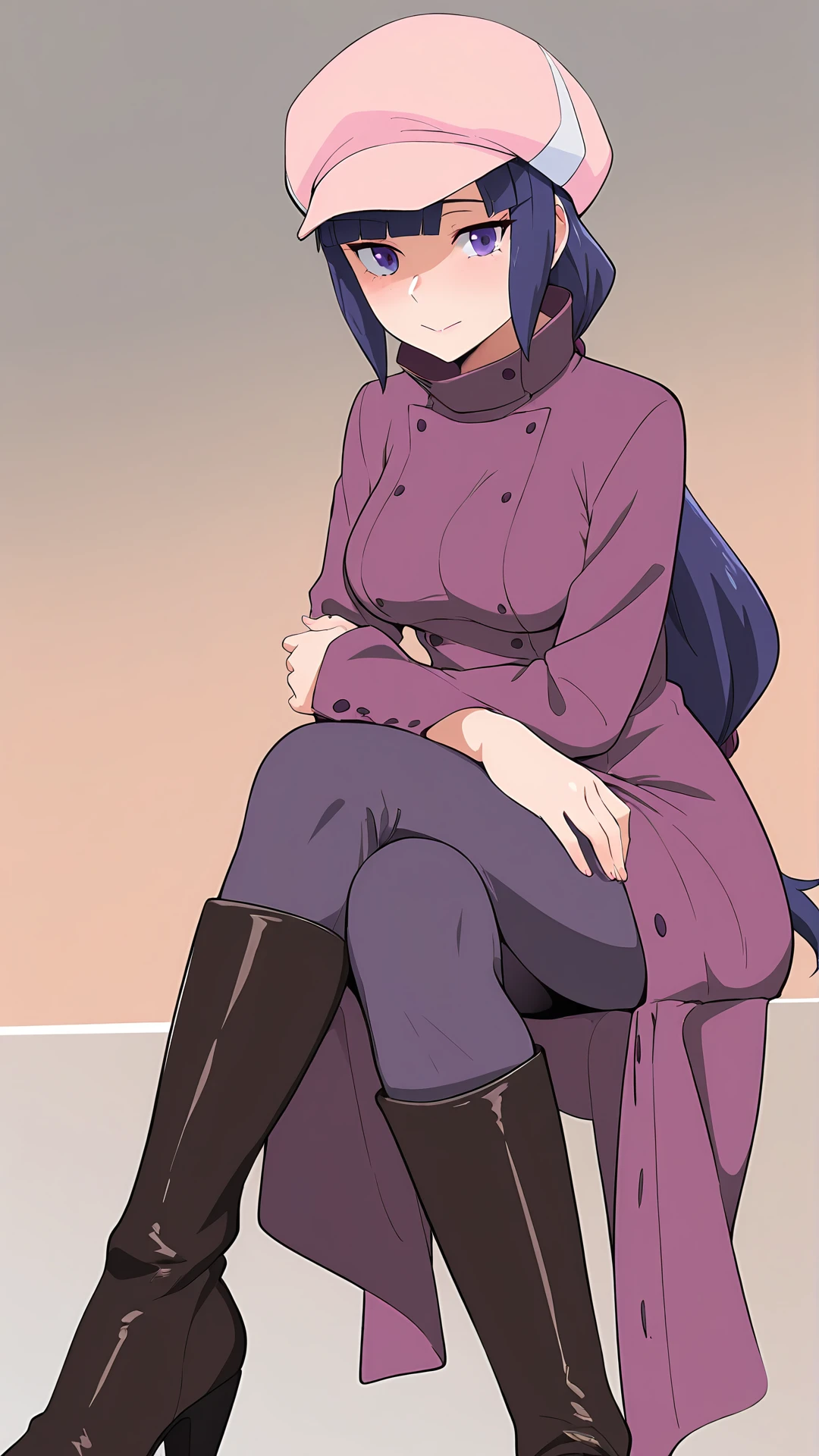 ,gbfmihoshi,1girl,blue hair,long hair,ponytail,purple eyes,mature female,medium breasts,hat,coat,boots,