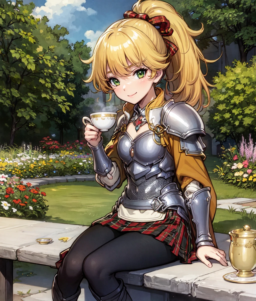 Notable tags: ponytail, blonde hair, green eyes, armor, scotish skirt, black pantythose,