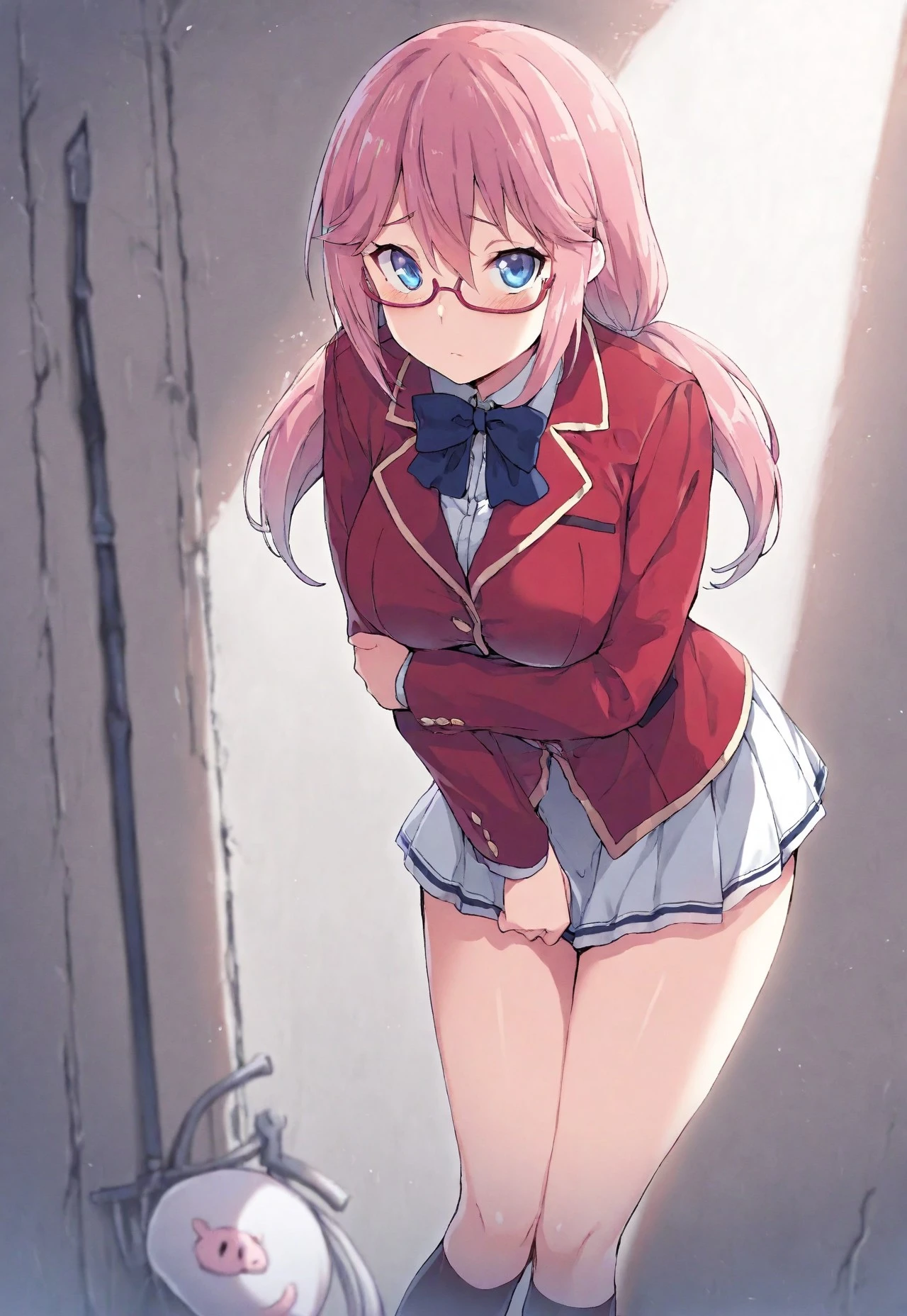 Trigger: 1girl,solo, blue eyes, pink hair, large breasts, looking at viewer, glasses, pig tails,