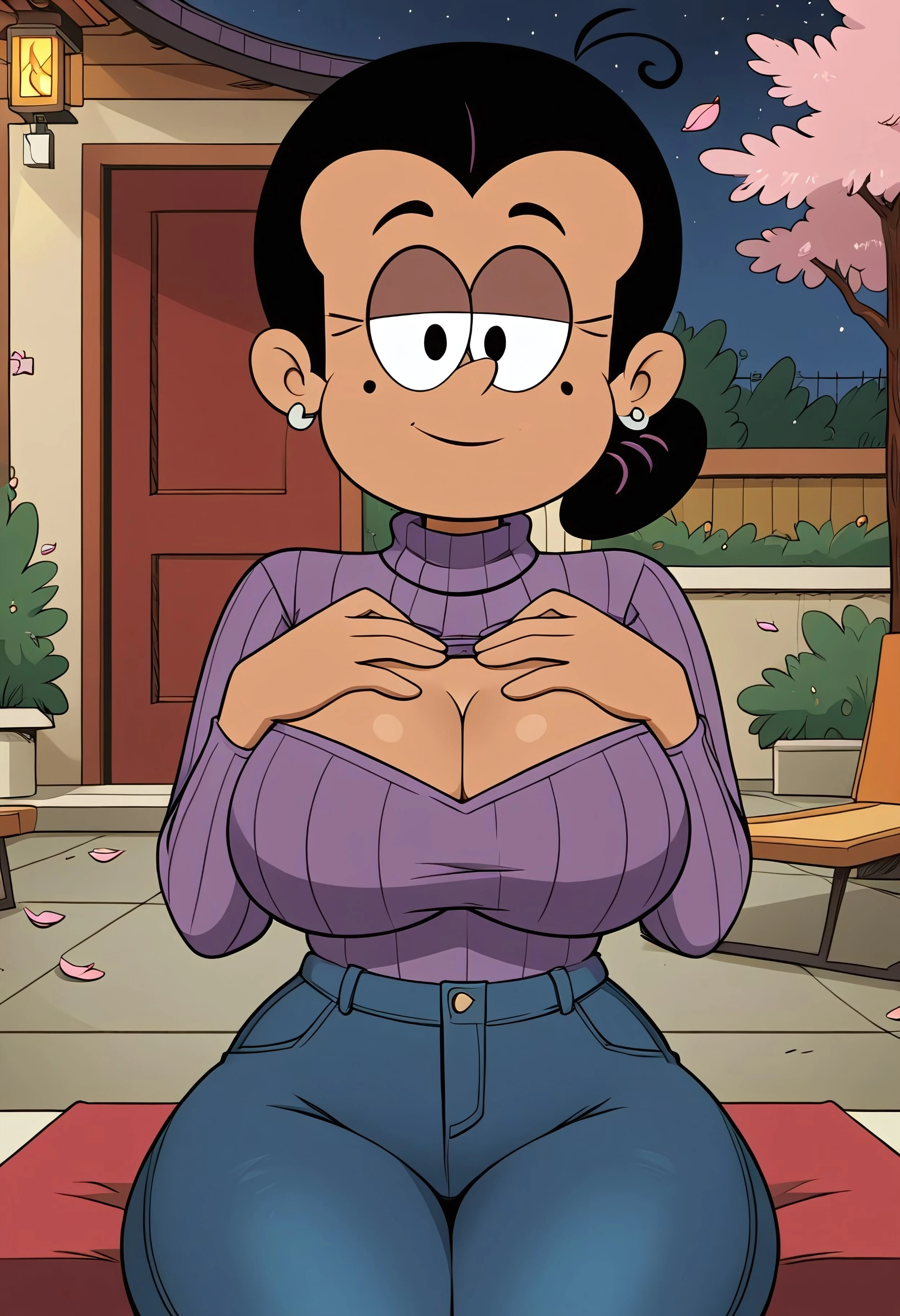earing light pink ribbed turtleneck sweater, tight fitted sweater showing cleavage, dark purple jeans