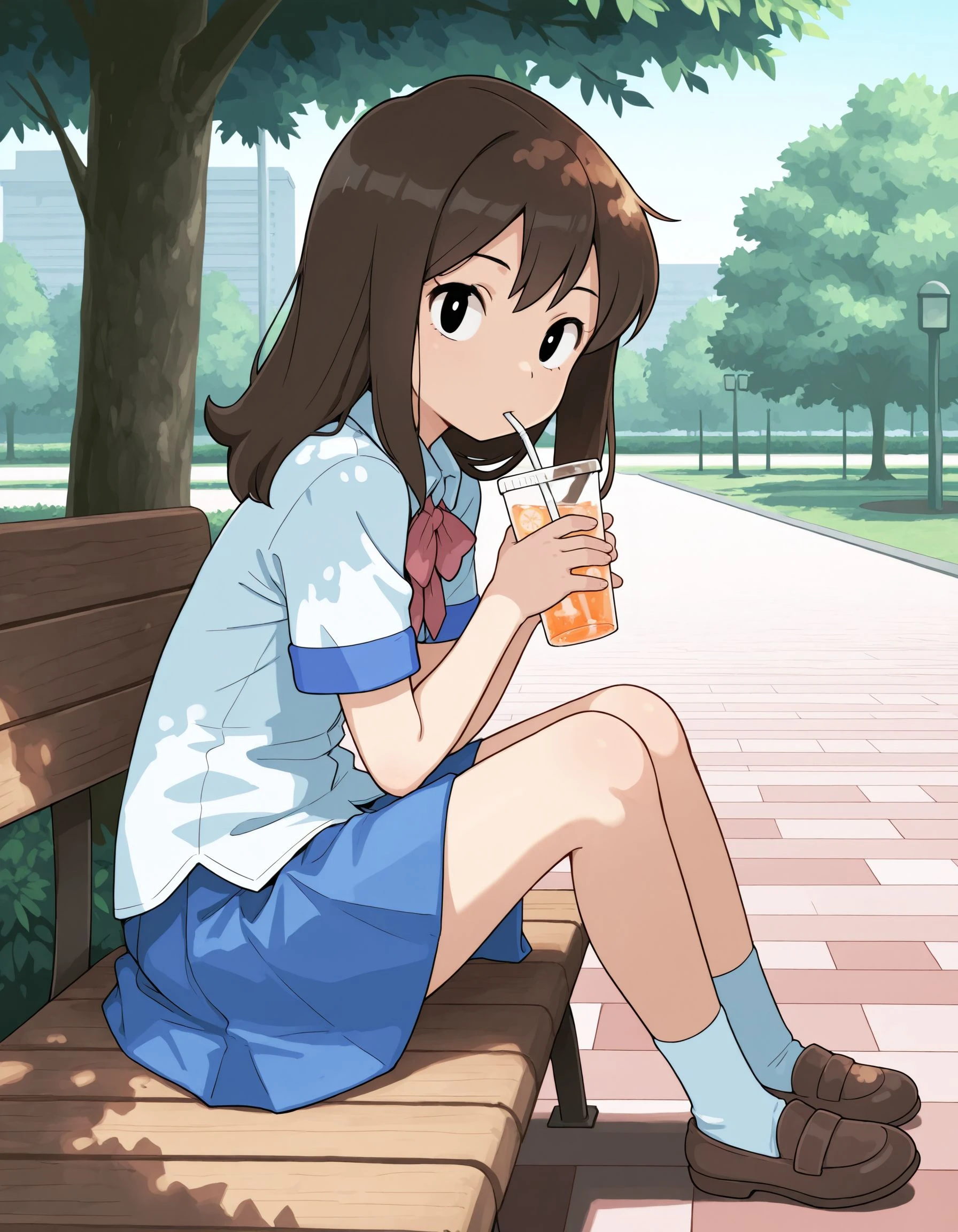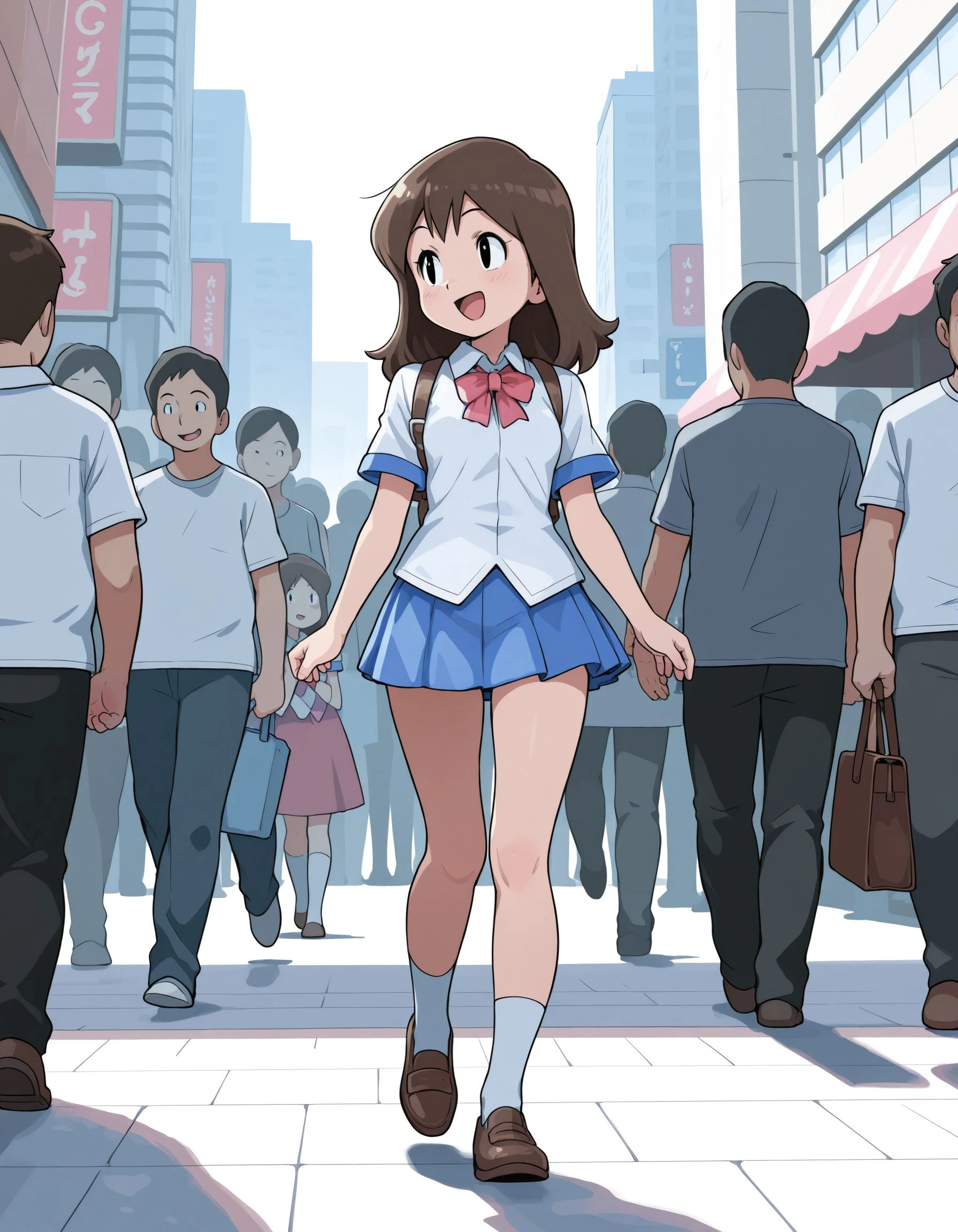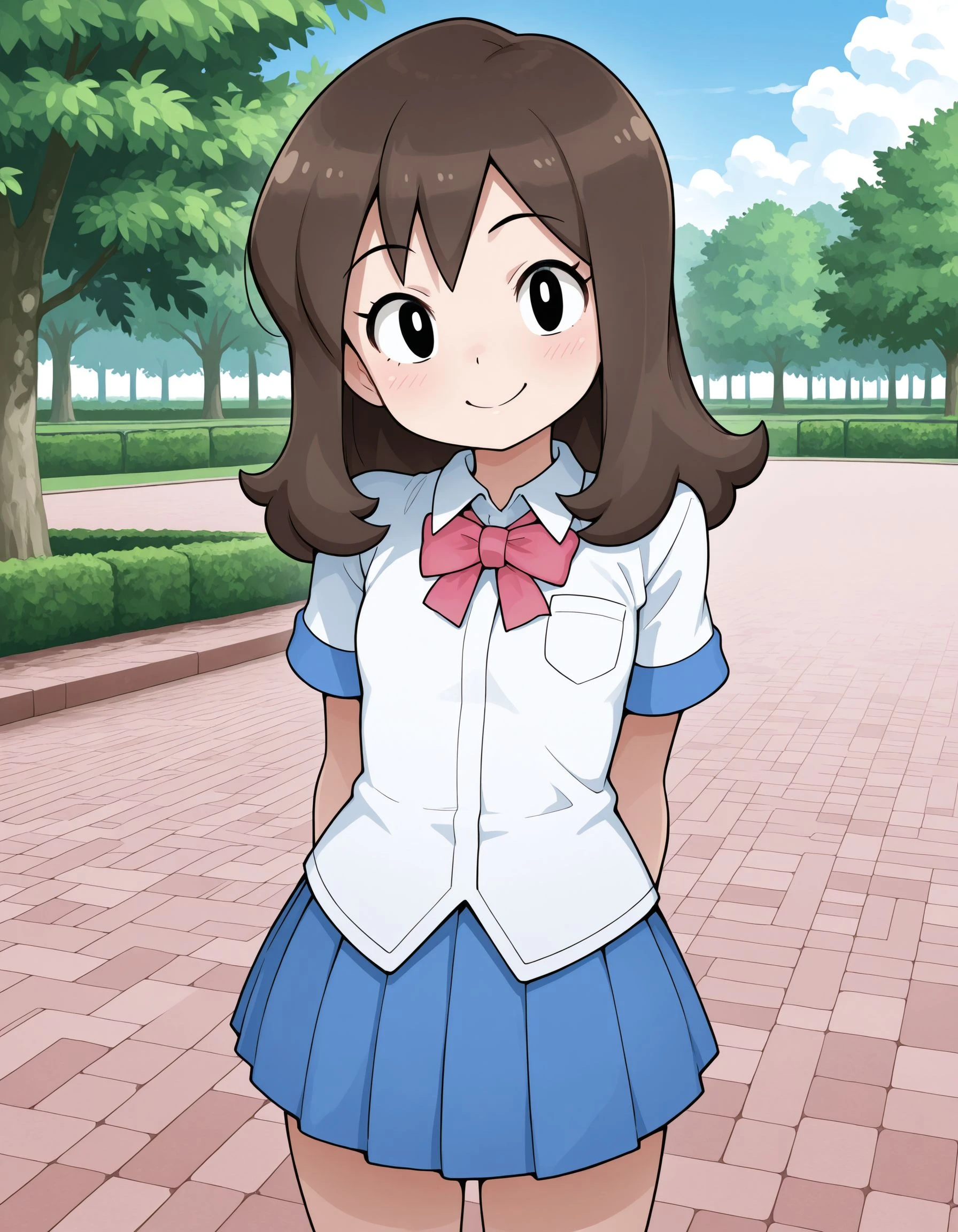 Add "brown hair,black eyes,bowtie,white shirt,blue skirt,socks,brown shoes" for her typical look.