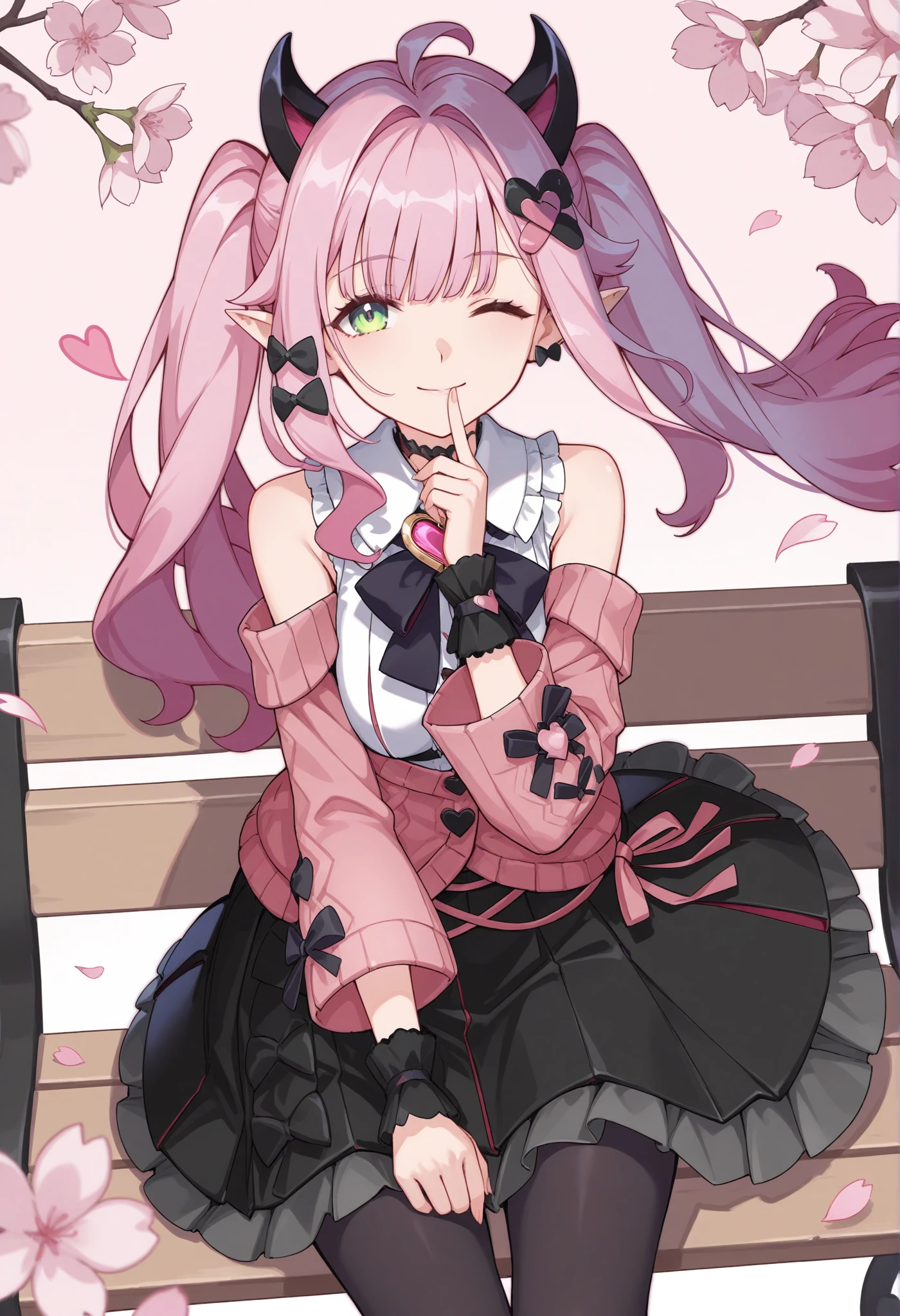 Parayaya,green eyes,demon horns,pointy ears,long hair,twintails,pink hair,ahoge,hair ornament,hair bow,black bow,服装 (outfit)