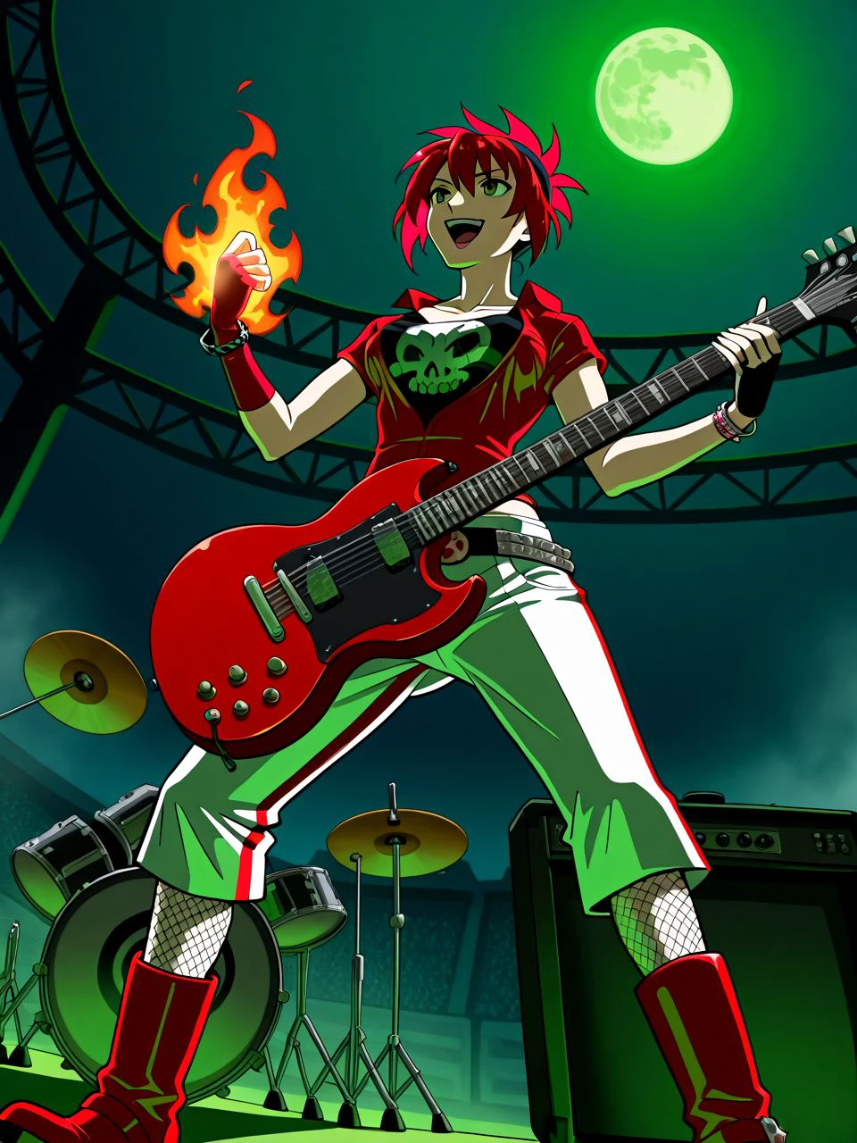outfit: (red leather) shirt, (black) skull print shirt, (white leather) capri pants (w/red trim), fishnet leggings, (red leather) boots