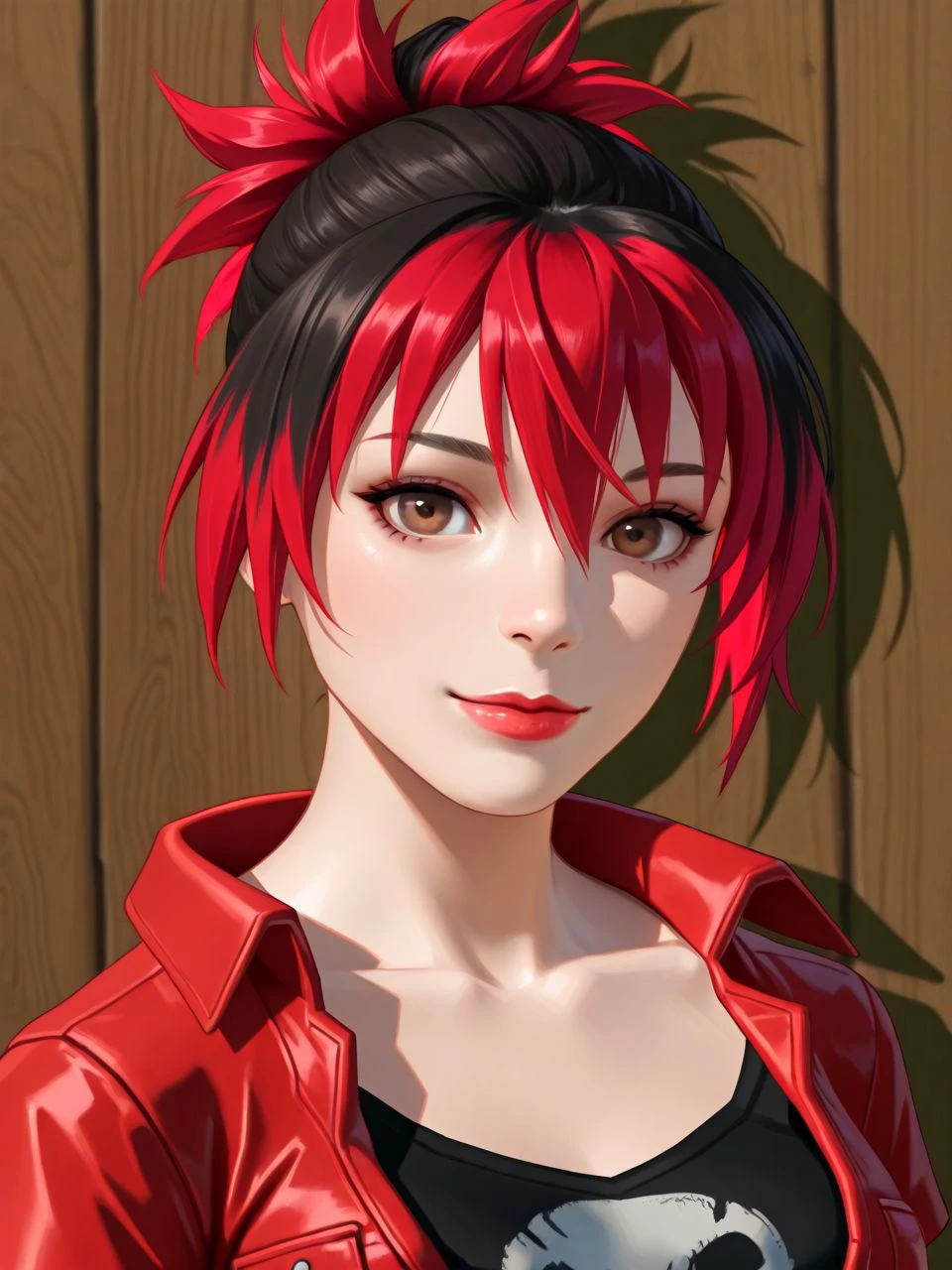 helper tags: (red/black) two-tone hair, tied hair, (red) bangs, brown eyes, (red) lipstick