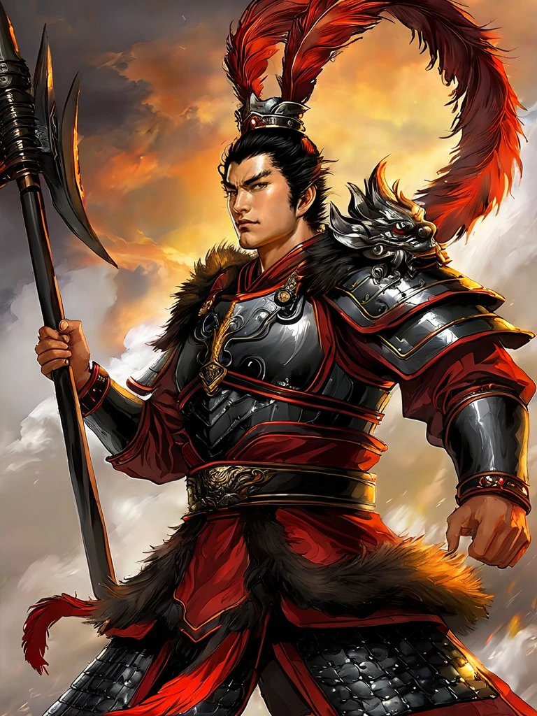 Triger word: lvbu man, pheasant_tail_feathers_crown, beast-face armor, beast-face belt, holding sky-piercing halberd. (吕布, 雉鸡翎头饰, 兽首胸甲, 兽首腰甲, ""拿着""方天画戟).