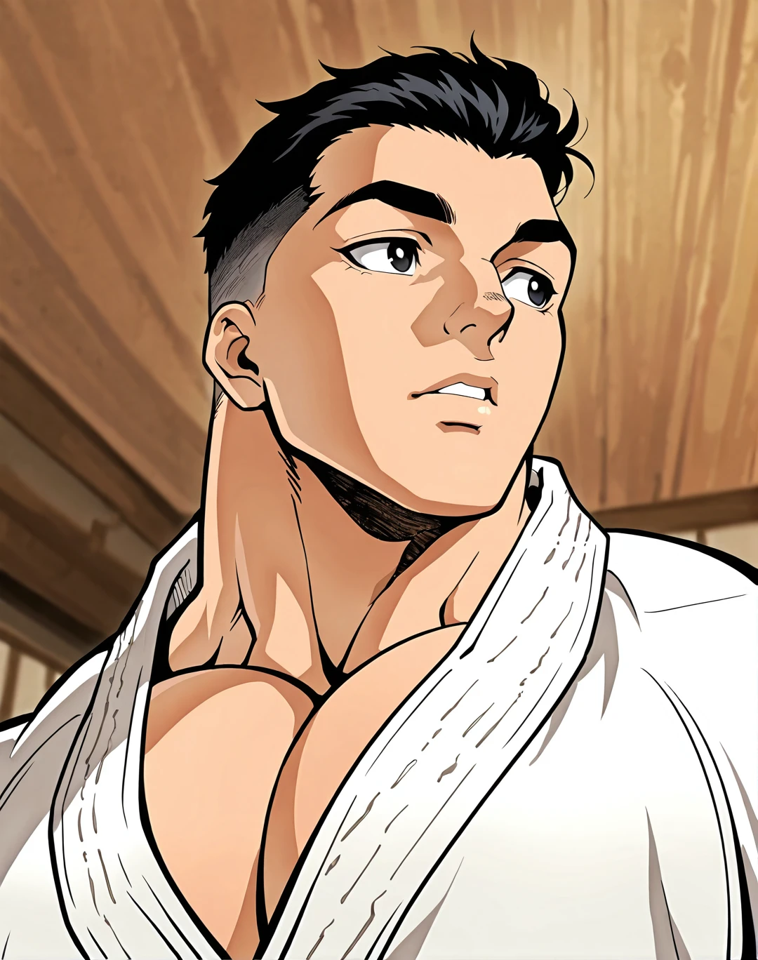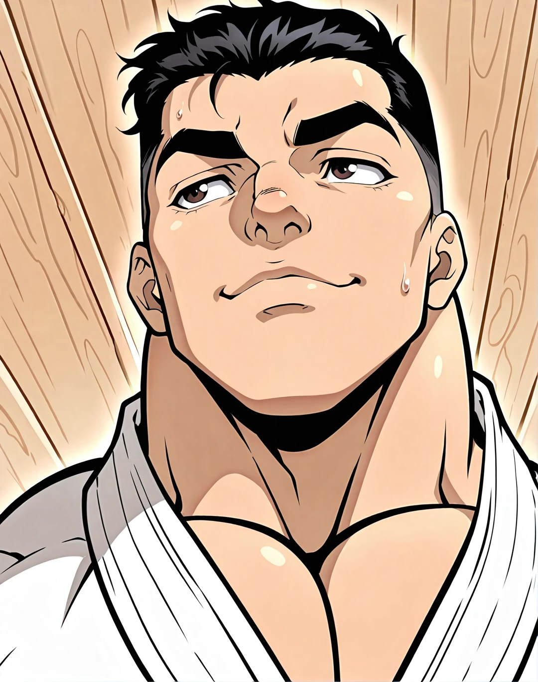 katsumi_orochi, solo, smile, short hair, shirt, black hair, 1boy, closed mouth, brown eyes, white shirt, male focus, sweat, sweatdrop, black eyes, muscular, frown, thick eyebrows, looking down, muscular male, portrait, bara, close-up, meme, mature male, sideburns, looking ahead, undercut, dougi, huge eyebrows, cheekbones, indoorsDescription