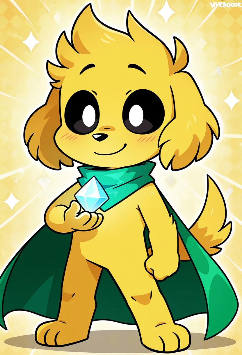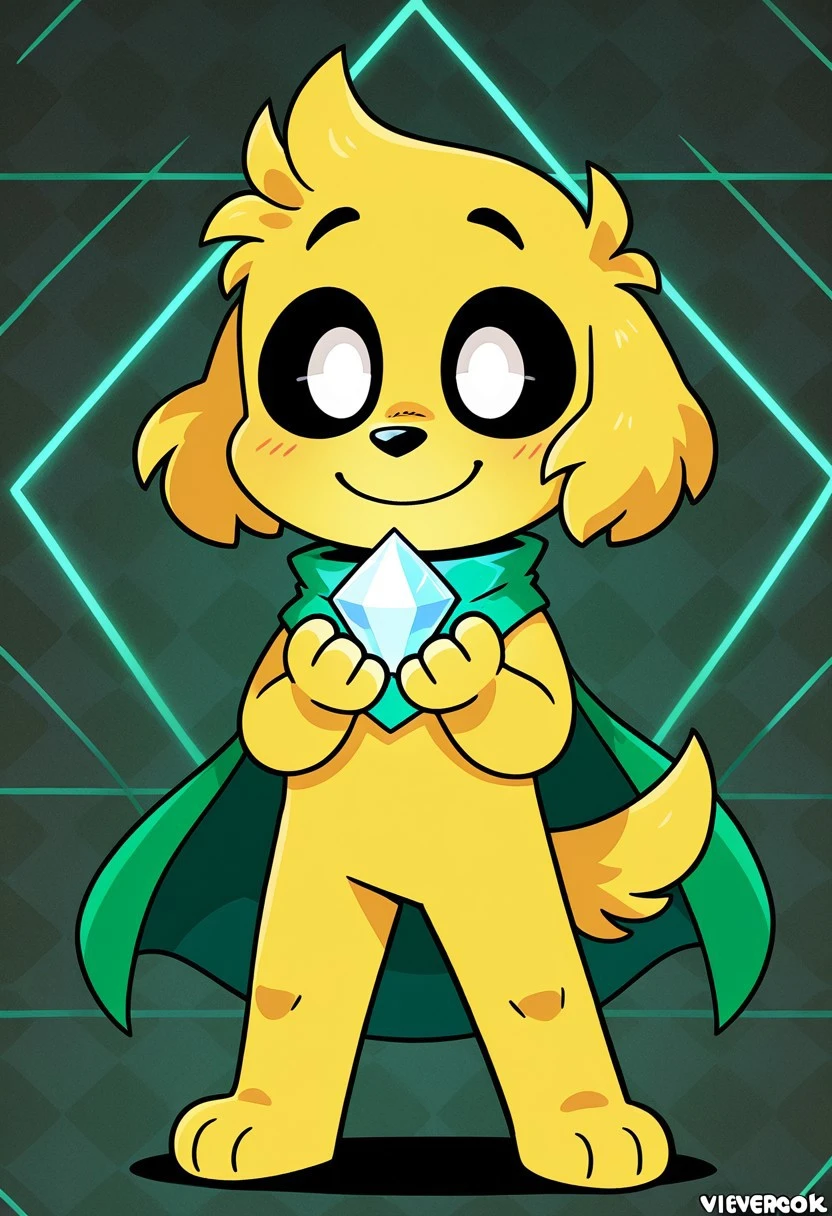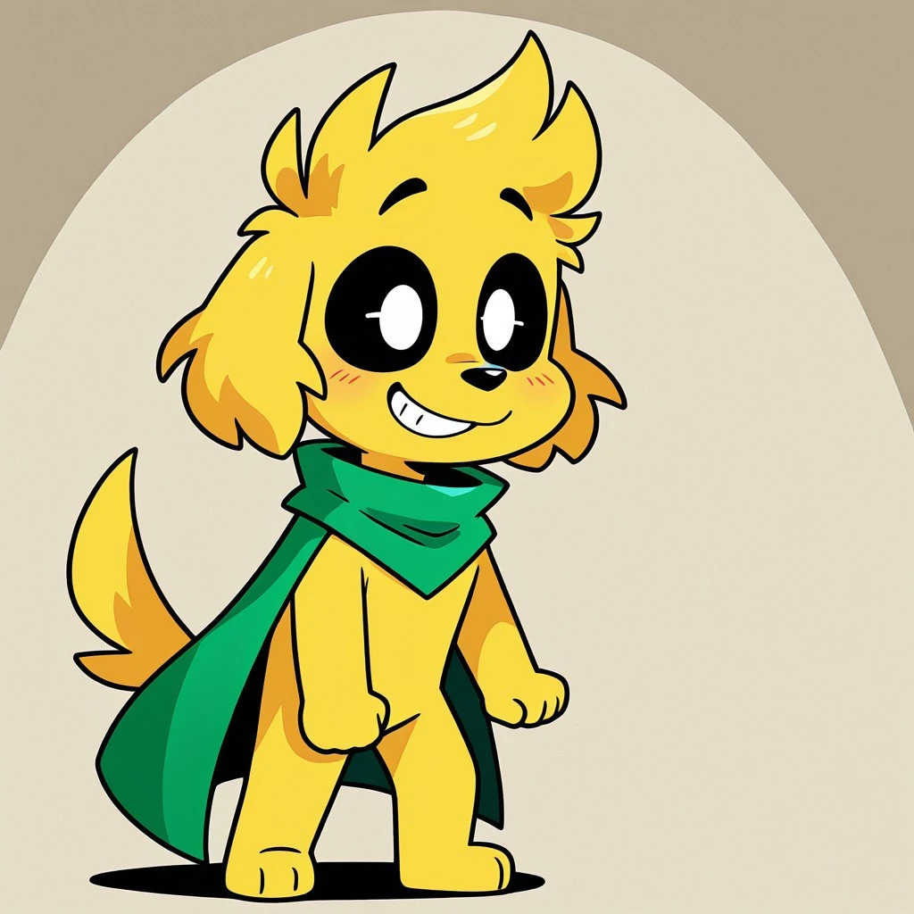 Mikecrack, yellow fur,black sclera,white pupils,Green cape,dog tail,male,Long drooping ears,black nose,smile