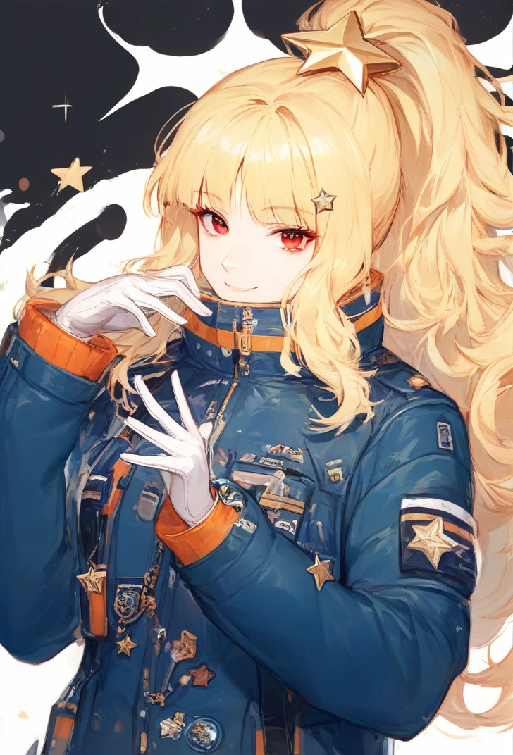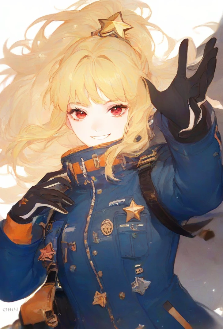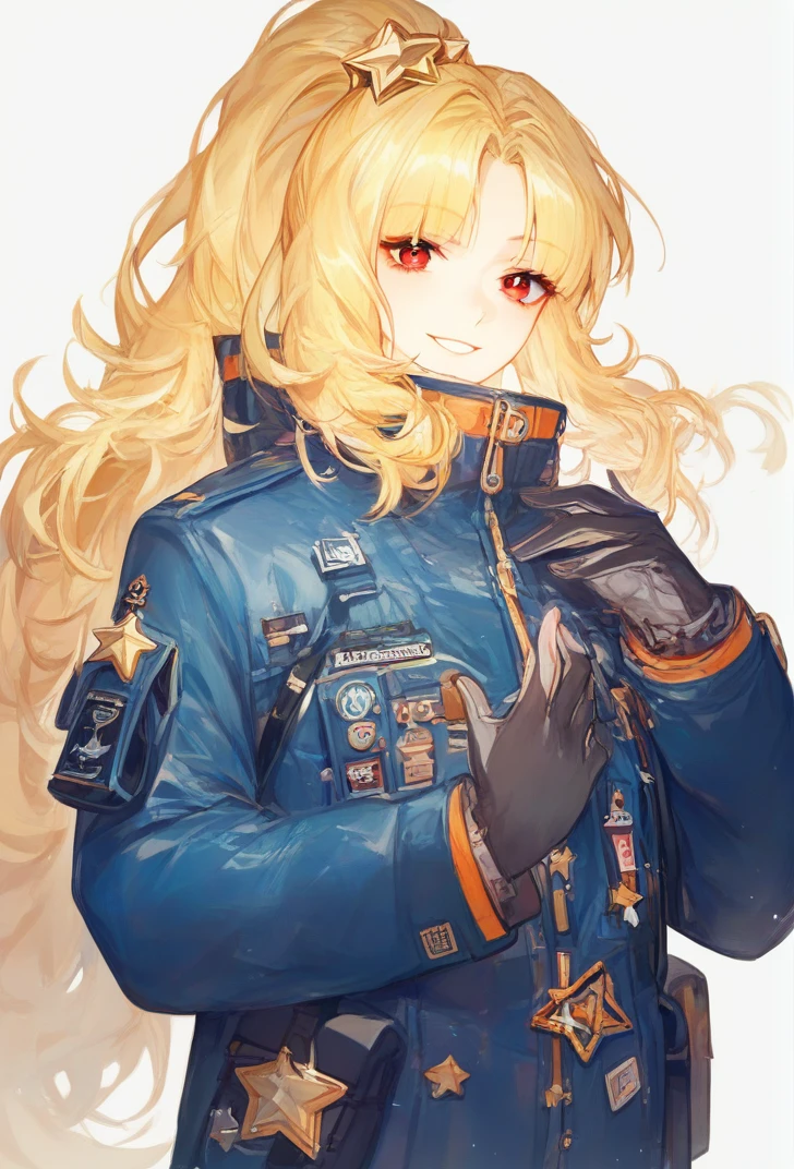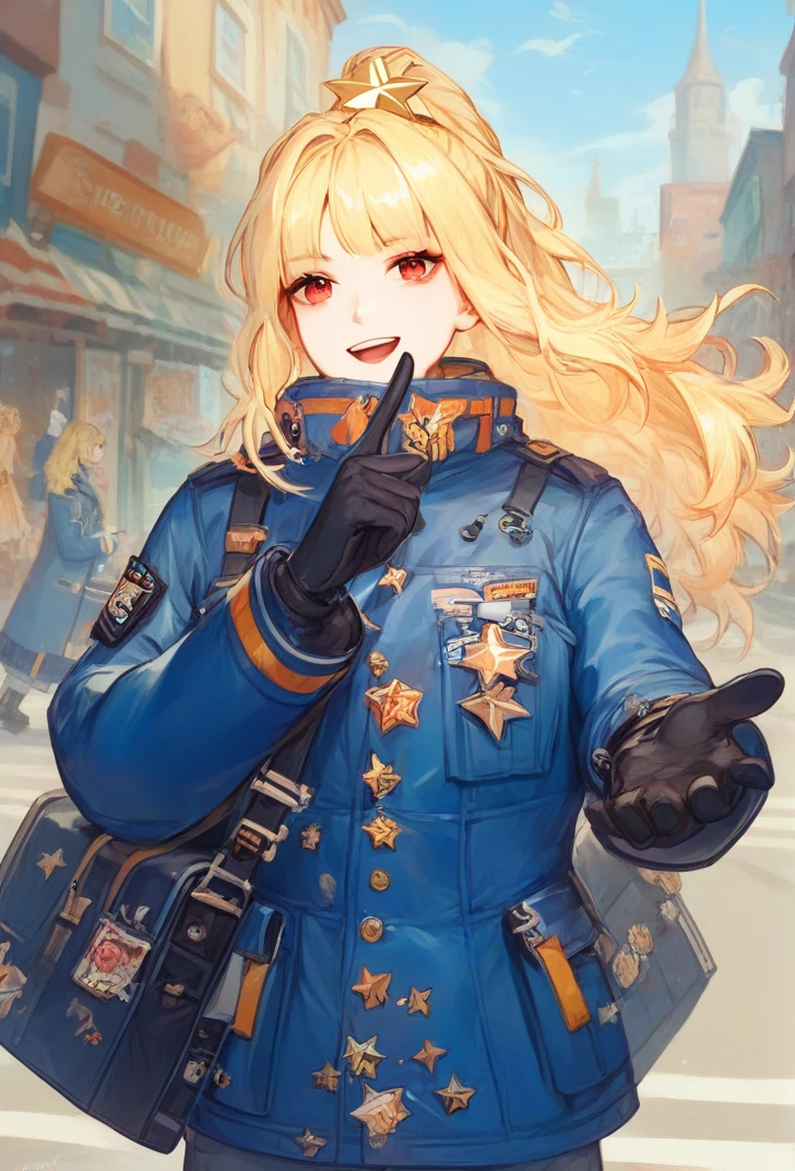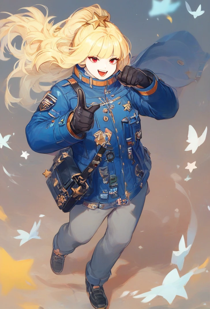 blue jacket, grey pants, blue footwear, multicolored gloves, black gloves, white gloves, bag