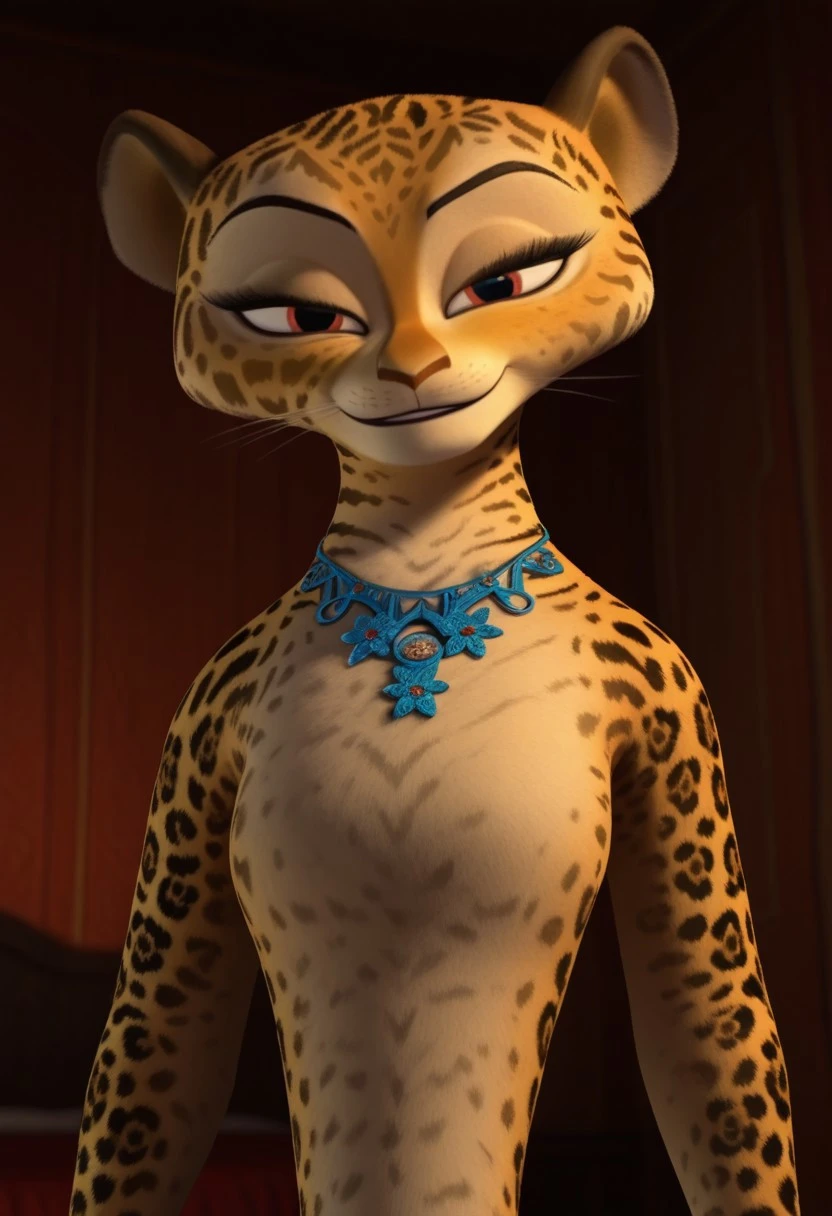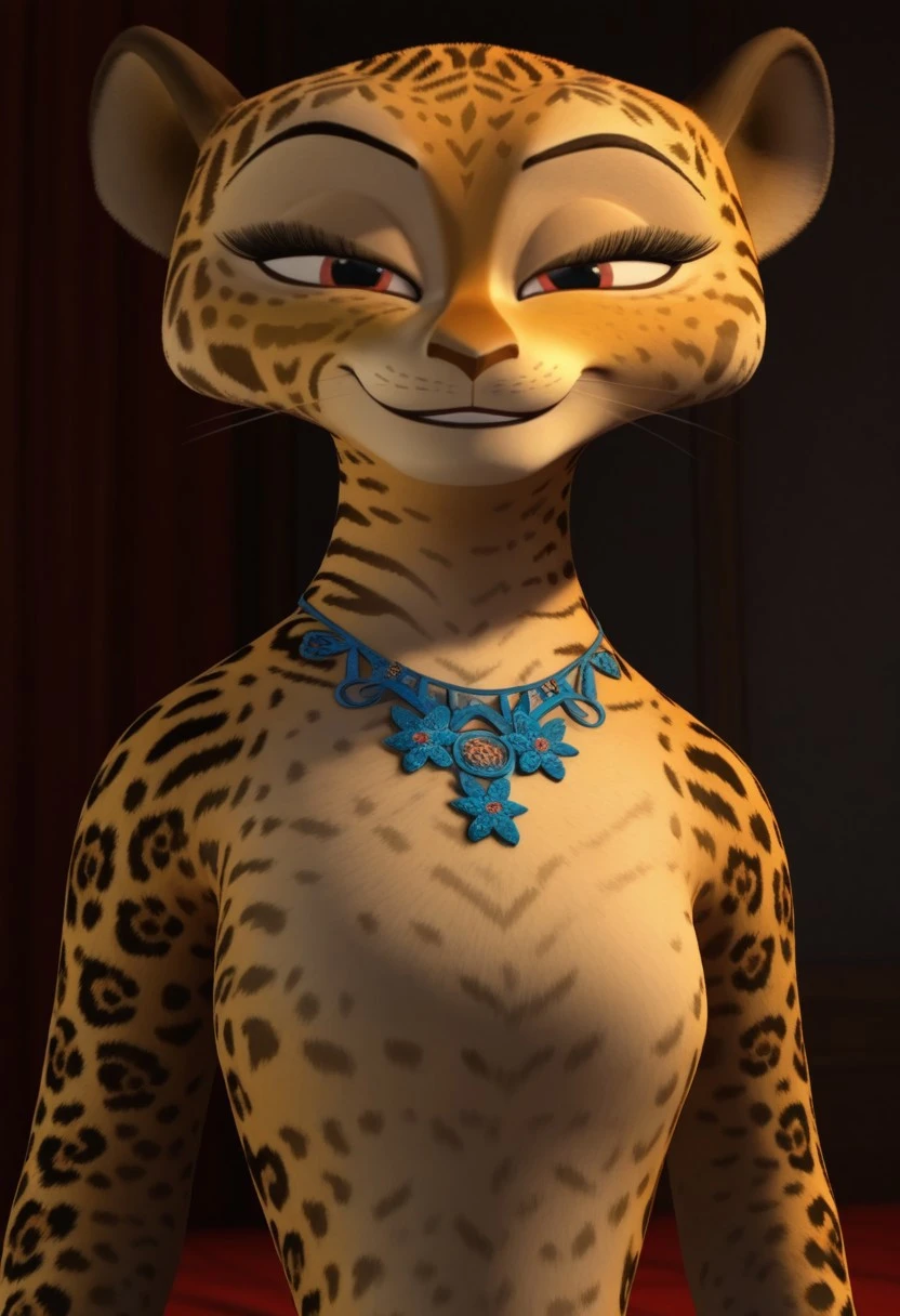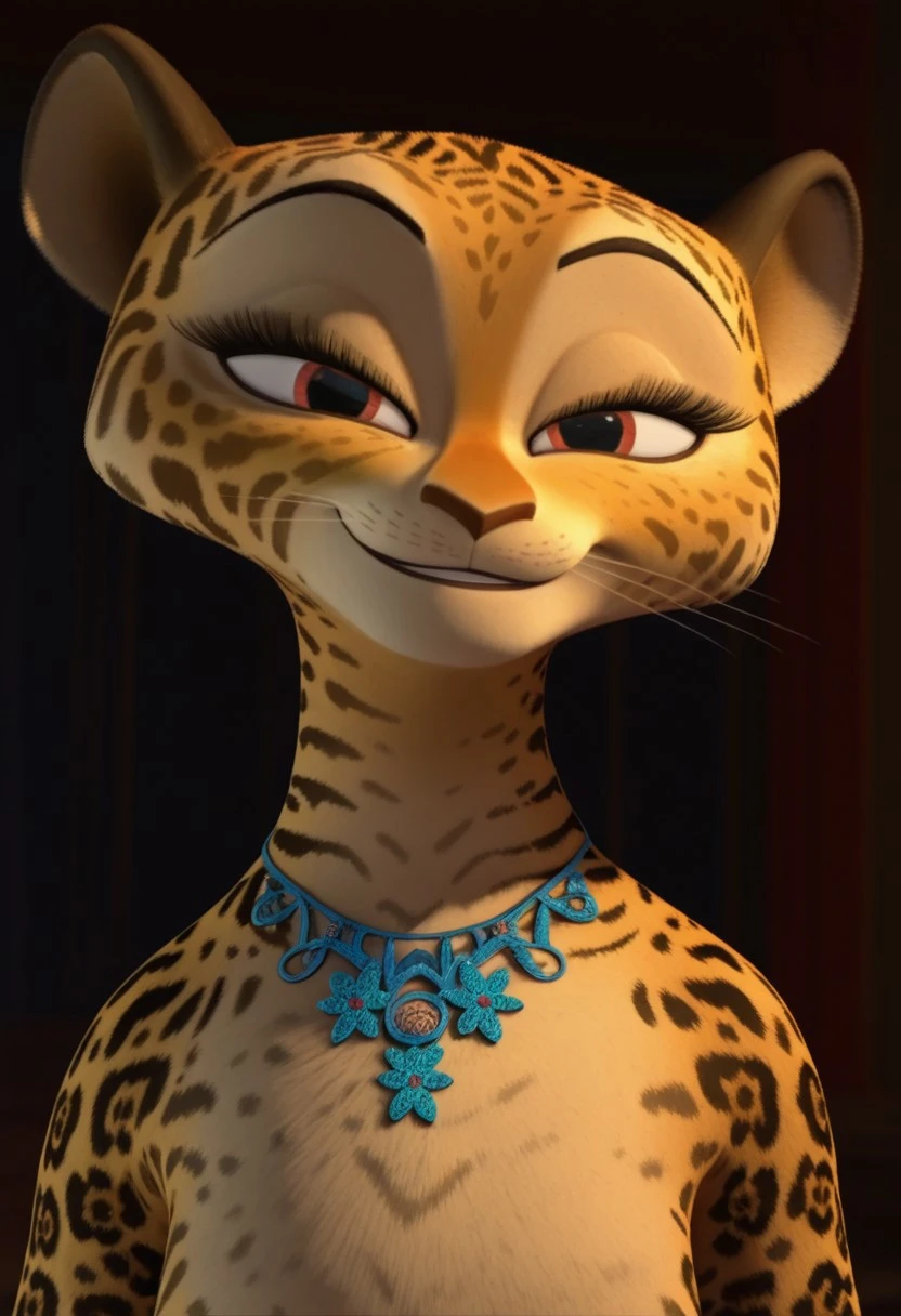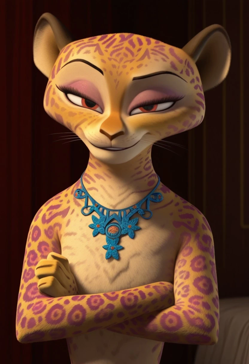 giam, jaguar, cheetah print, gold fur, cream fur, red eyes, black spots, pink spots, pink eyeshadow, skinny, furry, anthro, 3D, cgi, cat nose, whiskers, black eyebrows, furry girl, female, furry female, blue necklace, 1girl,