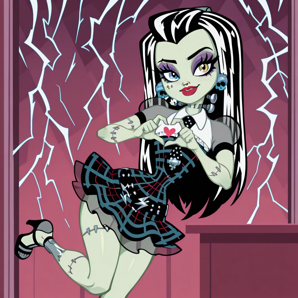 frankenstein female, solo, curvy, light green skin, heterochromia, one blue eye, one light yellow eye, long black hair with white streaks, dark purple eyeshadow, red lips, blue skull earrings, one stitch scar under eye, gray arm stitches, gray leg stitches, black plaid dress with white collar, black belt, lightning bolt buckle, black plaid ruffled skirt, gray puffy see_through shoulders, black high heels with white stripes, black tie with white polkadots, neck screws,