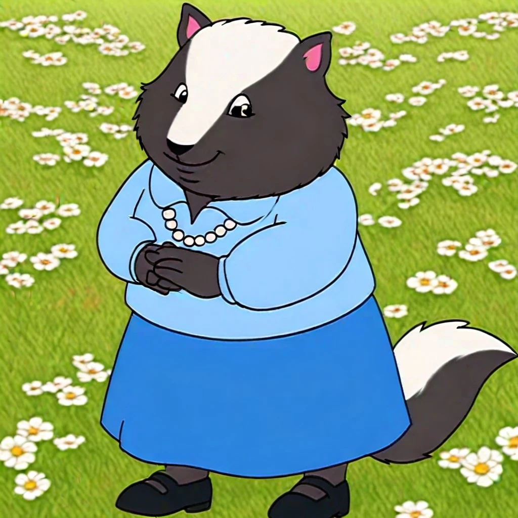 skunk, skunk girl, black and white fur, black eyes, black nose, skunk ears, skunk tail, plump, light blue blouse, pearl necklace, blue skirt, black mary janes,