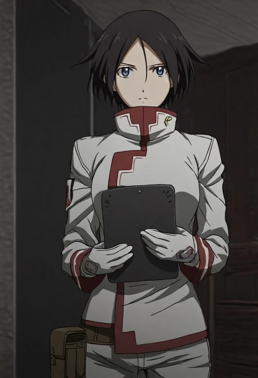 1girl, solo, LetoBB, black hair, blue eyes, parted bangs, short hair, white military uniform, white pants, black boots, white gloves