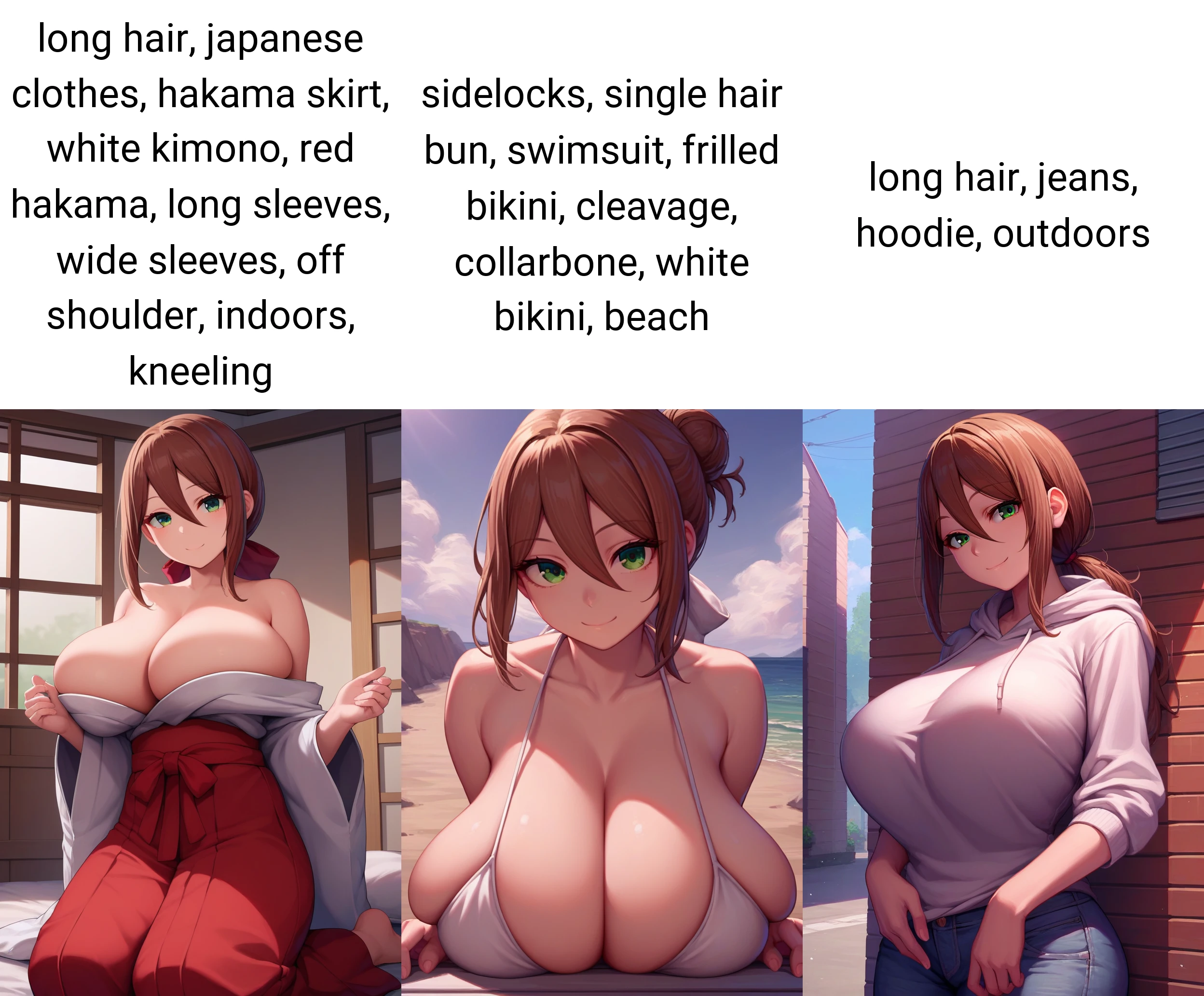Miko-san, hair between eyes, huge breasts, green eyes, brown hair