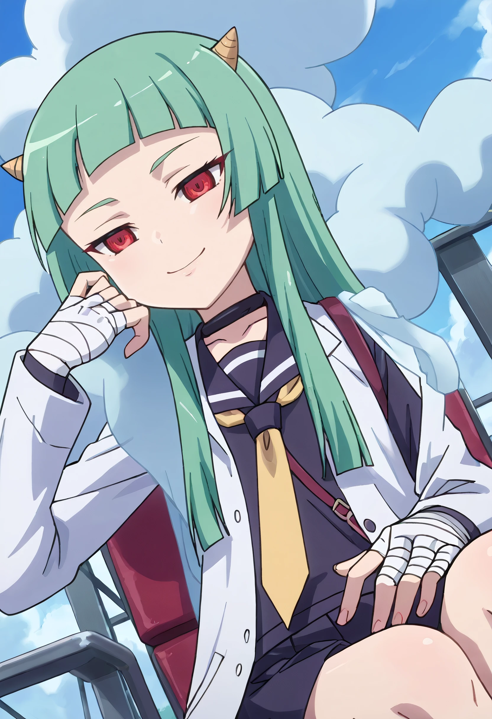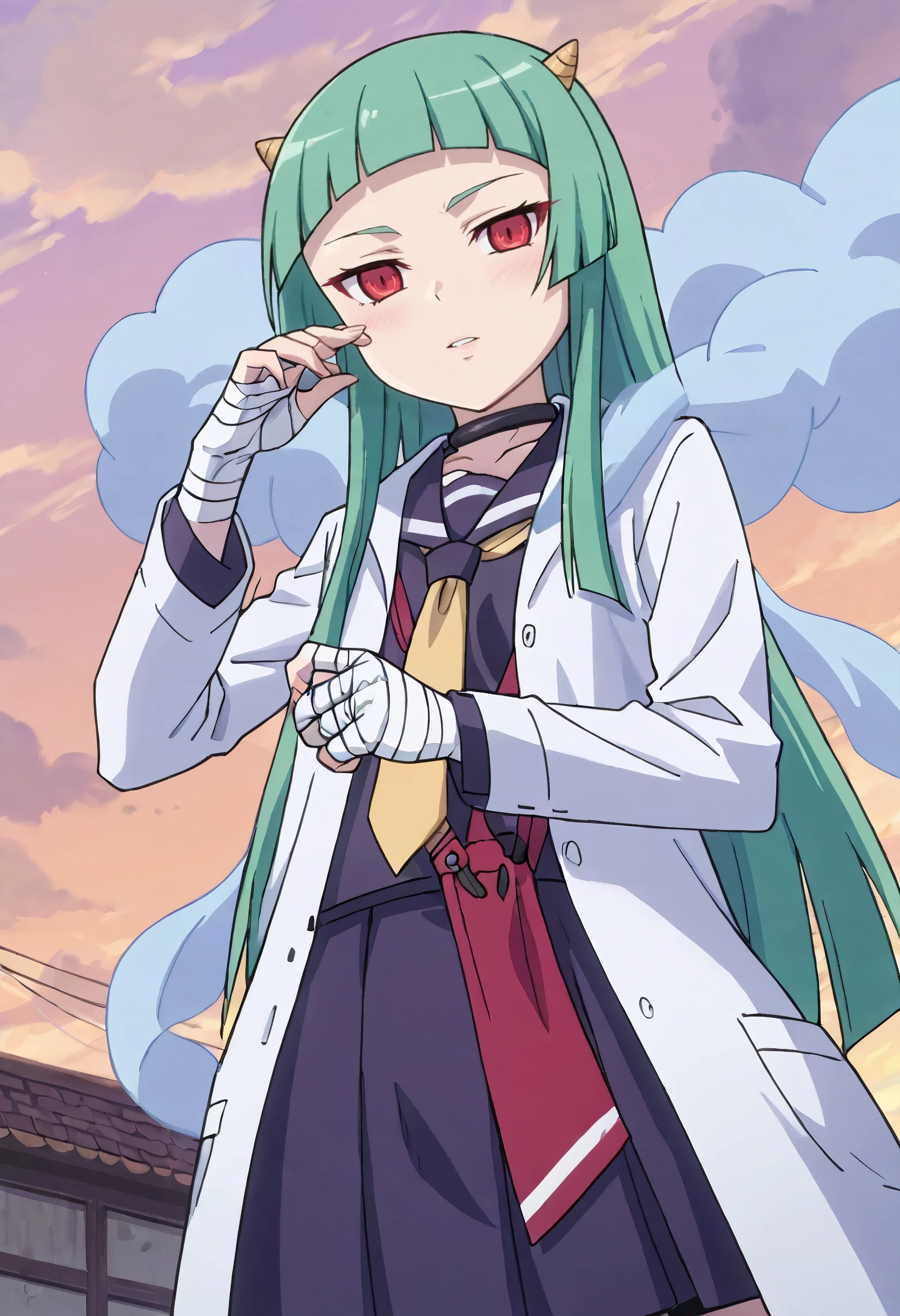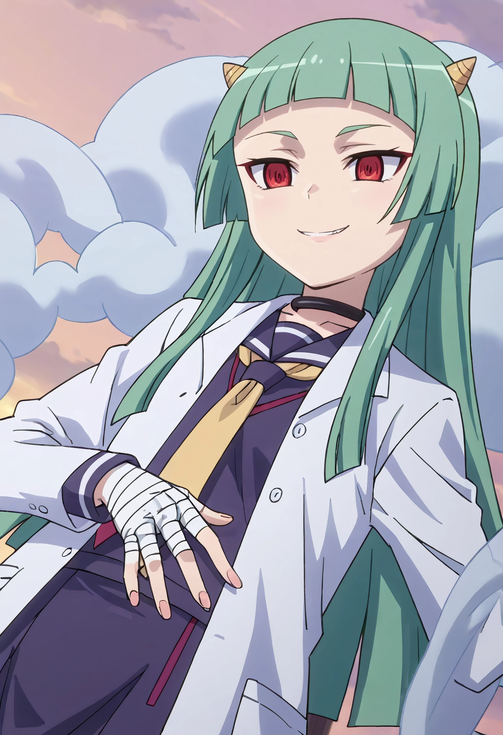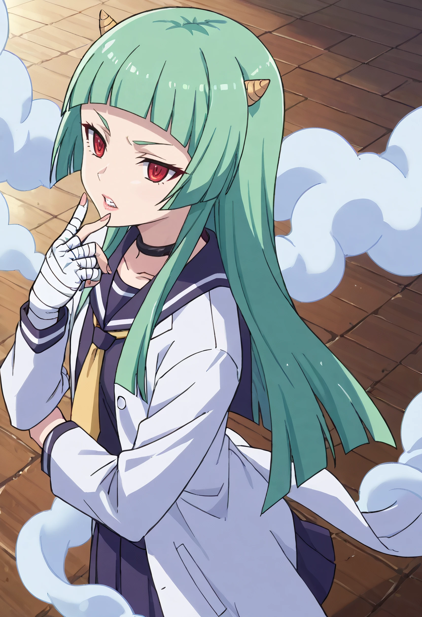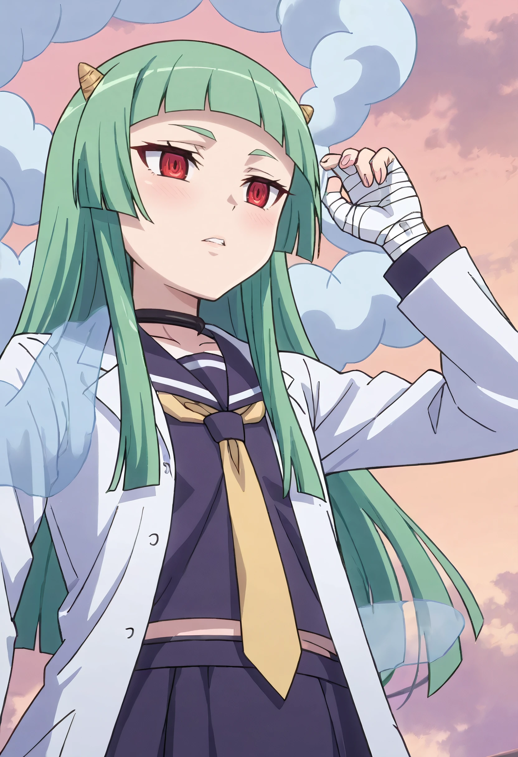 LuneStandard, school uniform, choker, serafuku, lab coat, sailor collar, bandages, bandaged hand, neckerchief, long sleeves, coat, black serafuku, necktie, shawl, skirt, white coat, open clothes, shirt, yellow necktie, bandaged fingers, black shirt, black skirt, smoke, cloud,