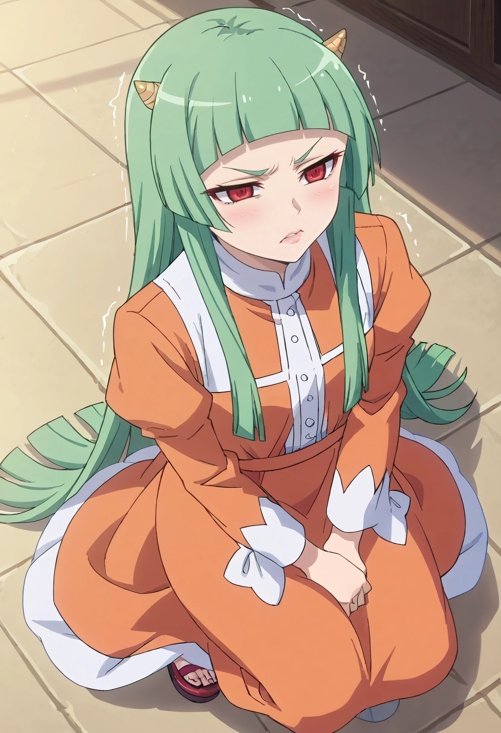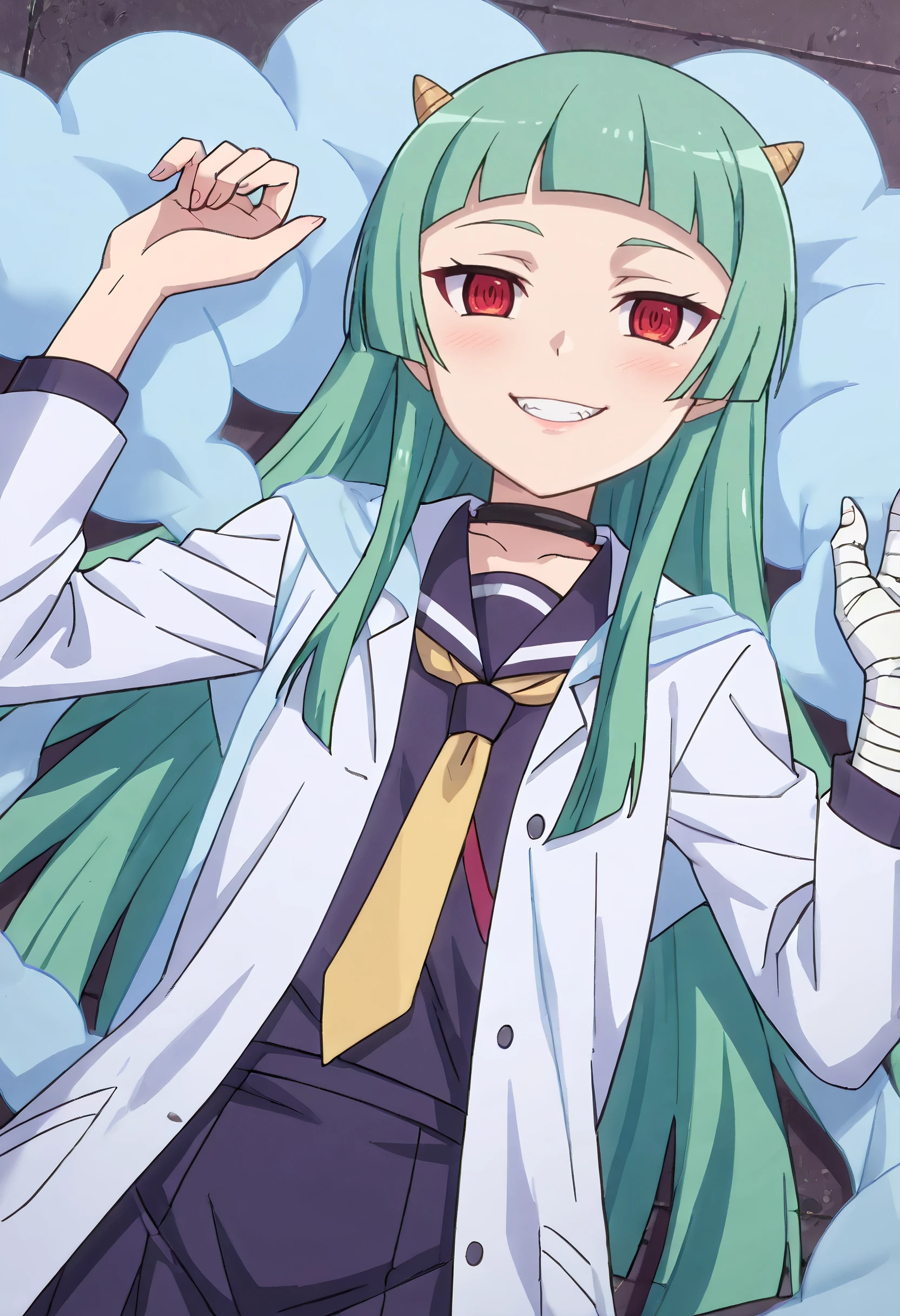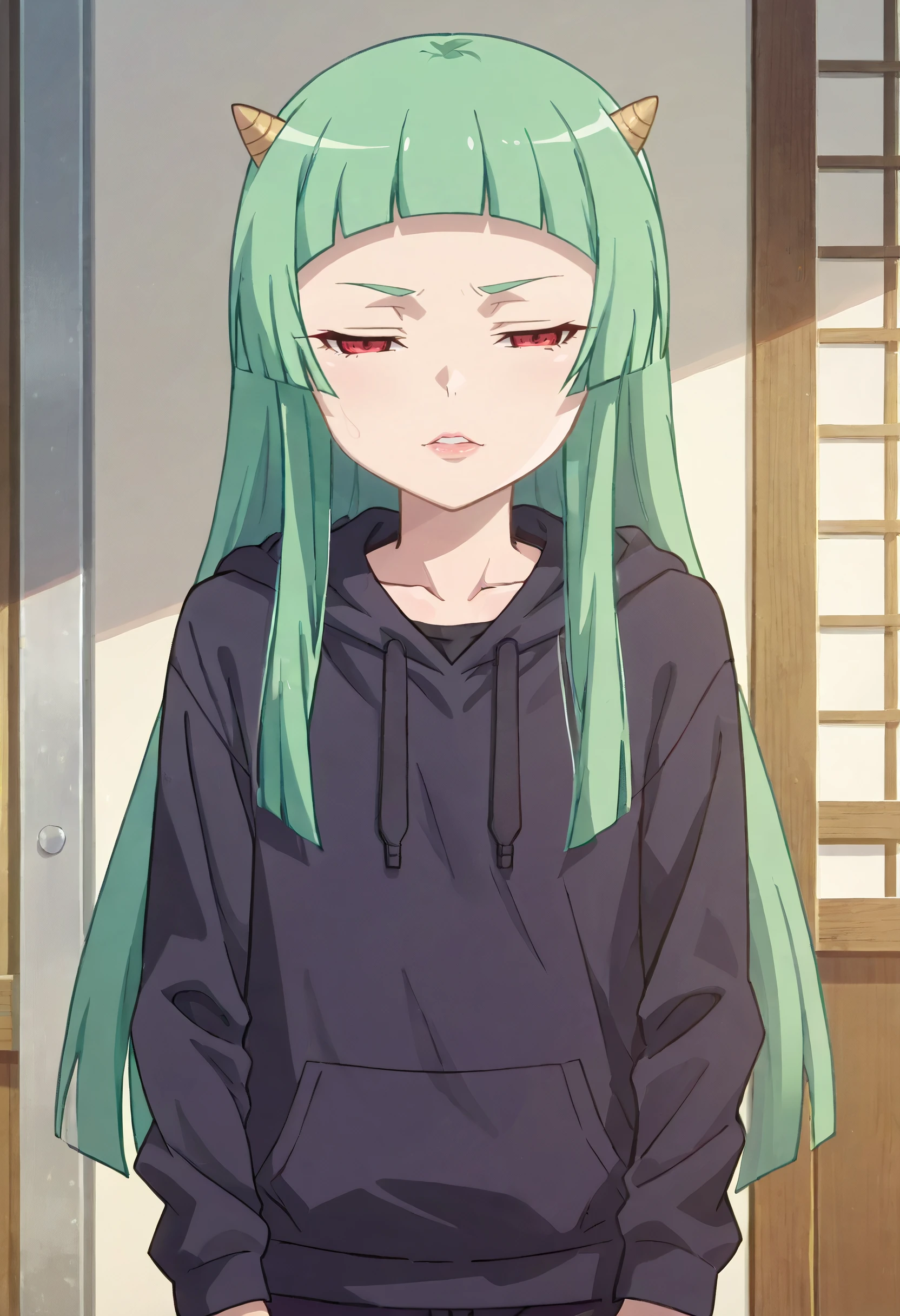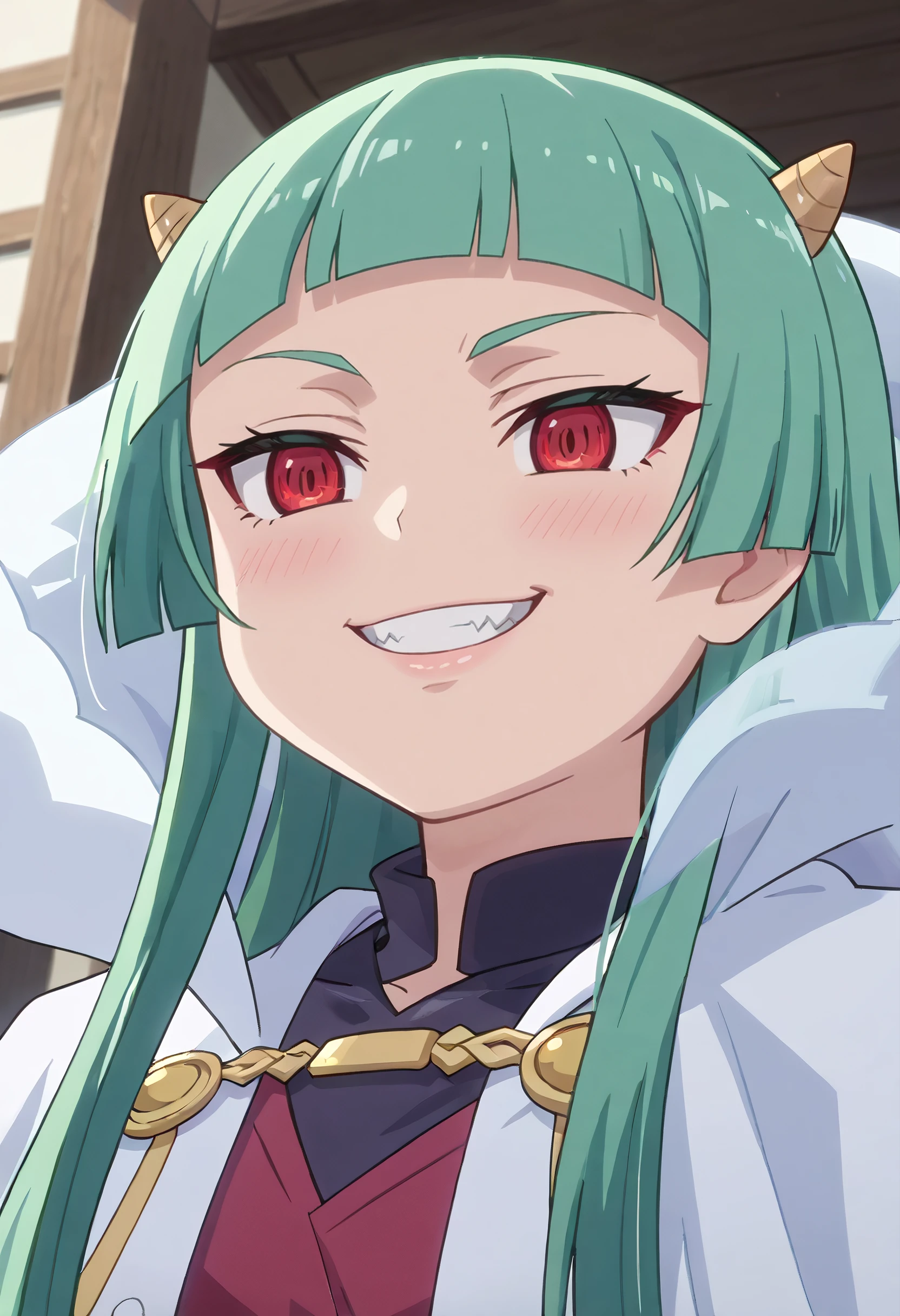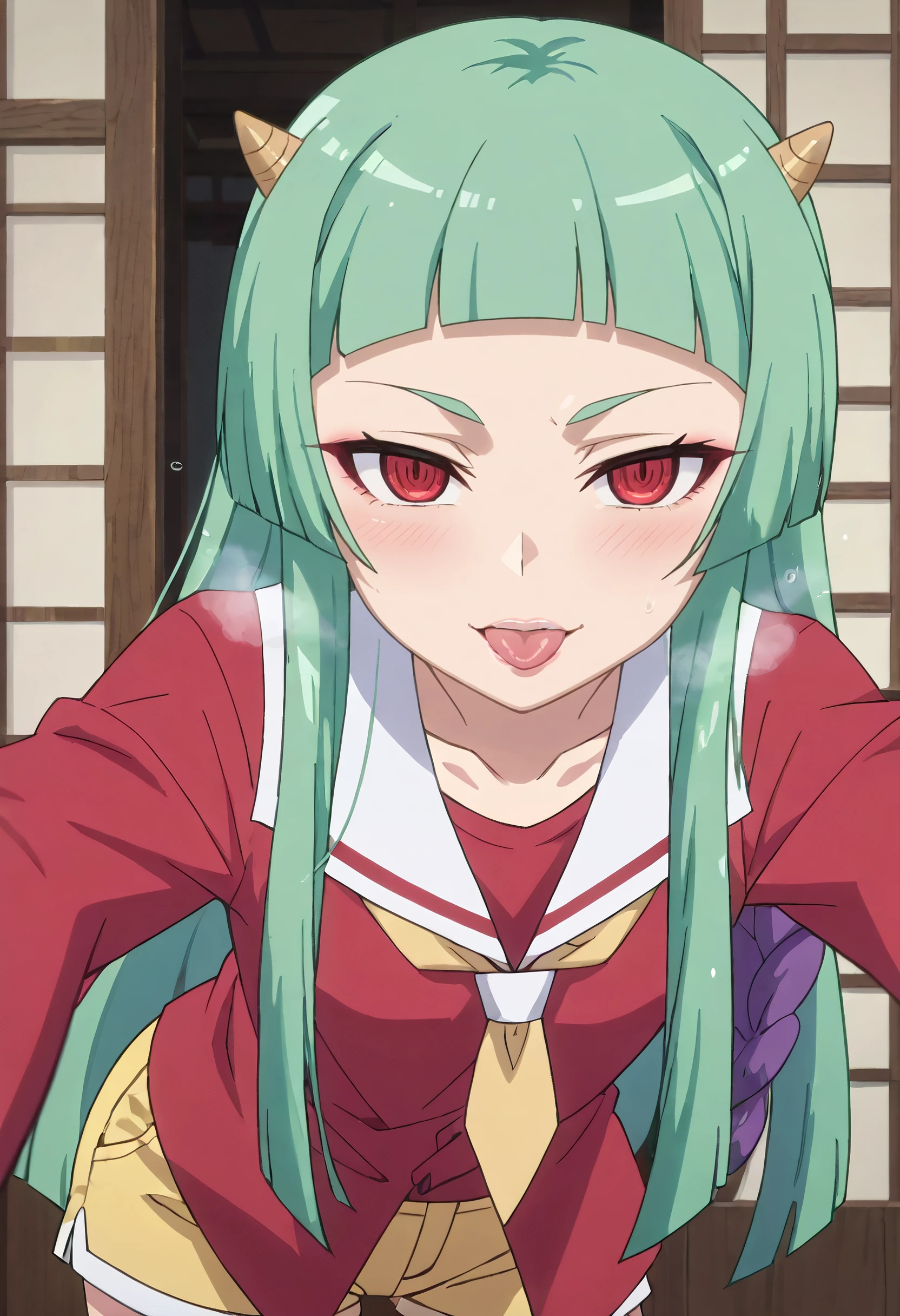 KNZLune, long hair, red eyes, green hair, blunt bangs, hime cut, horns, oni, oni horns,