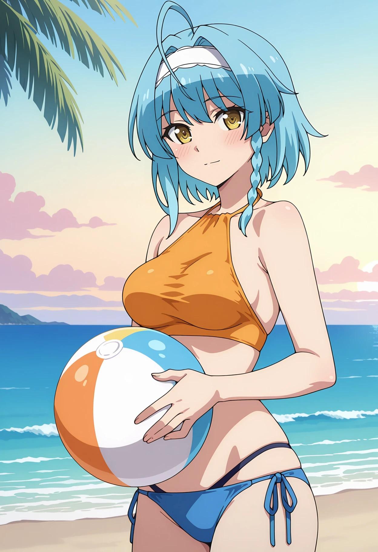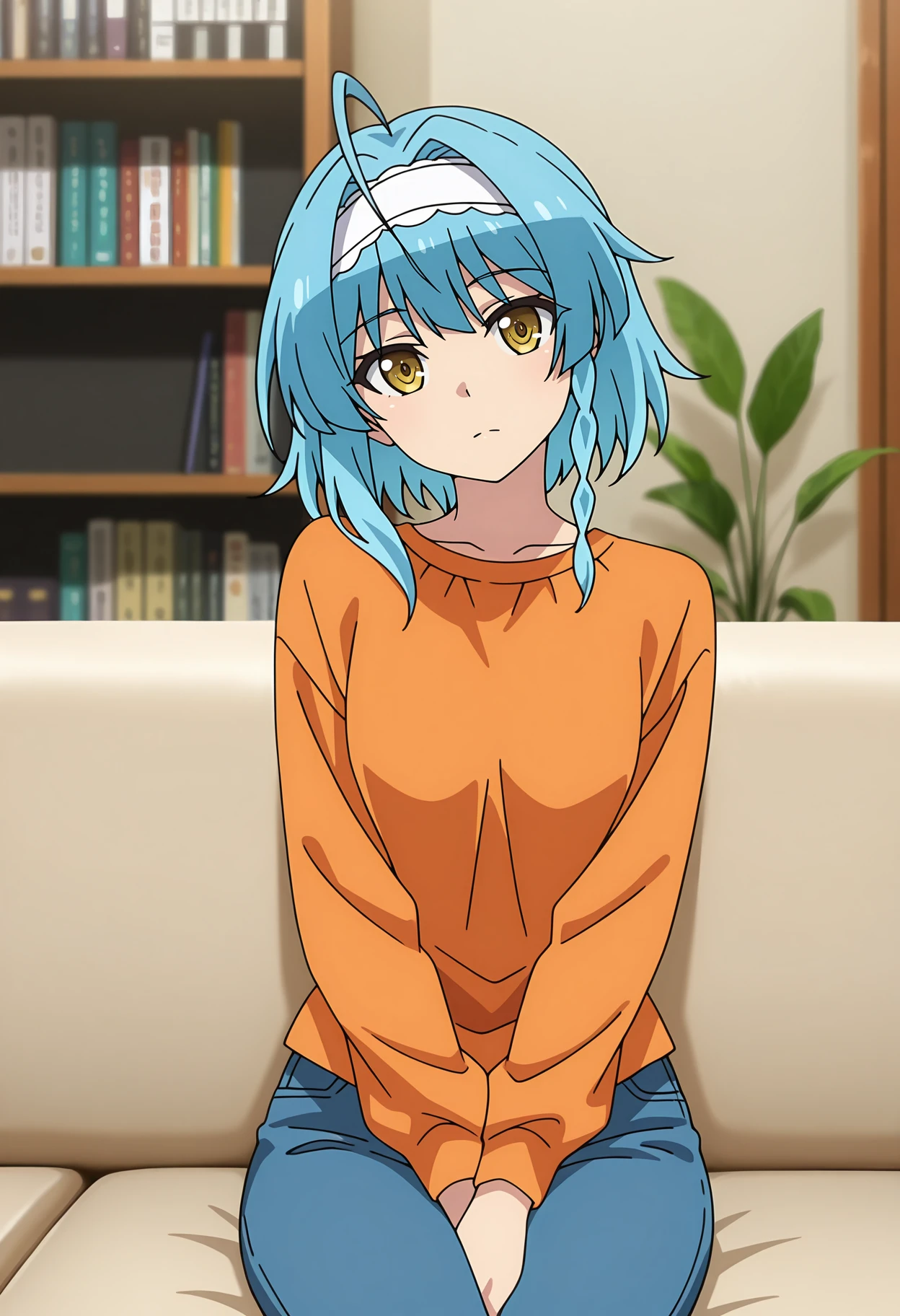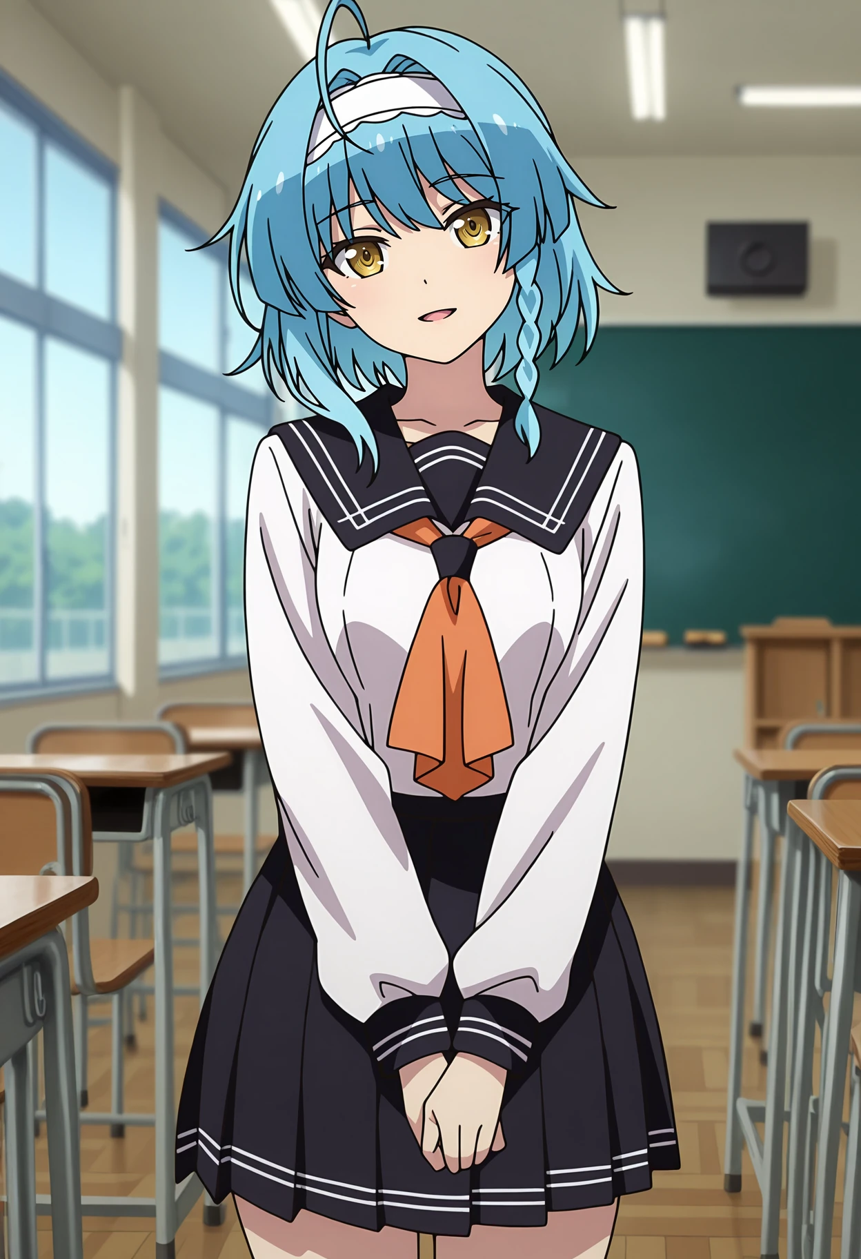 side braid, ahoge, medium hair, blue hair, yellow eyes, medium hair, white hairband