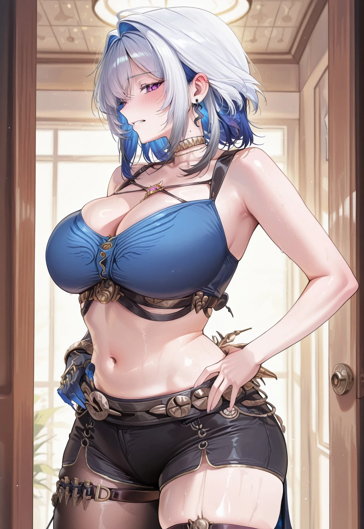 blue crop top, cropped jacket, chain between breasts, long sleeves, colored extremities, asymmetrical gloves, snake-shaped armlet, black gloves, choker, feathers, waist cape, breast straps, asymmetrical legwear, single leg pantyhose, single thighhigh, thigh strap, shorts, short shorts, belt,