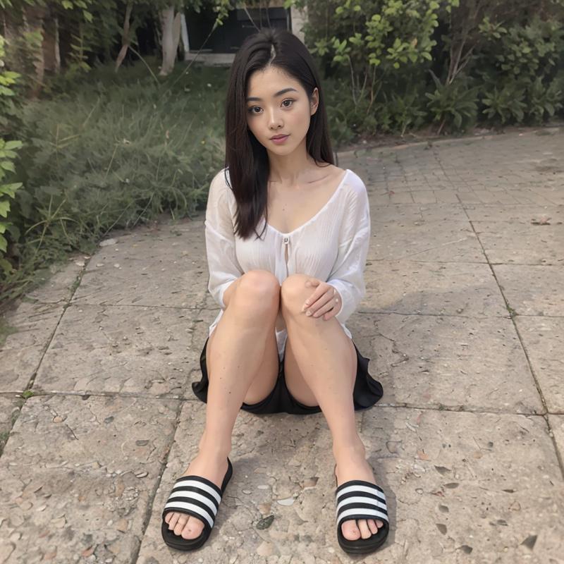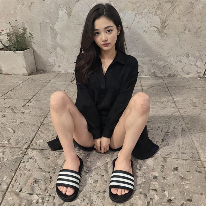 This LORA was trained on close-up feet images wearing the famous 3-stripe slippers, so it may not look well on full body or images other than close-up feet or leg focused images.