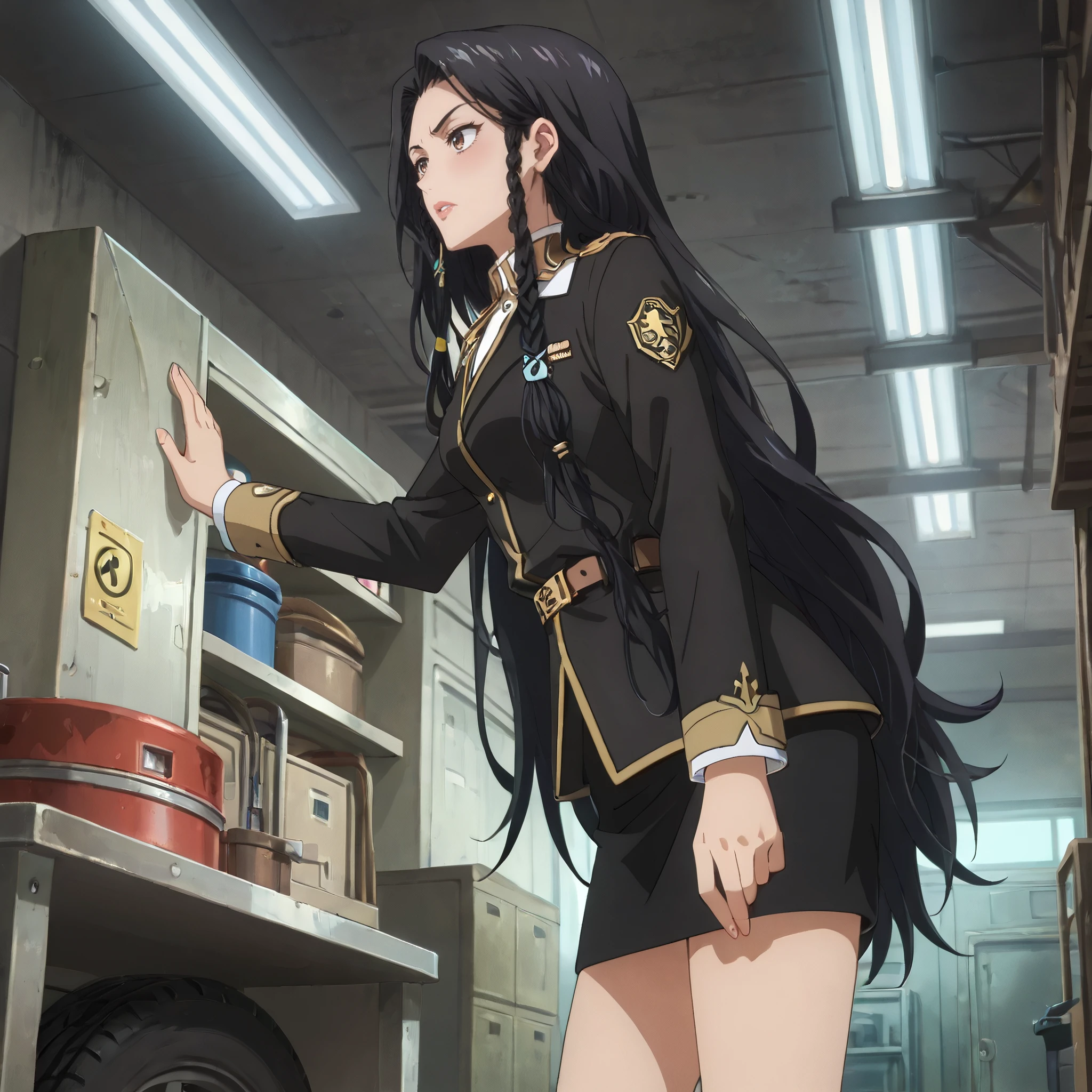 black skirt, military uniform, long sleeves, belt, jacket,
