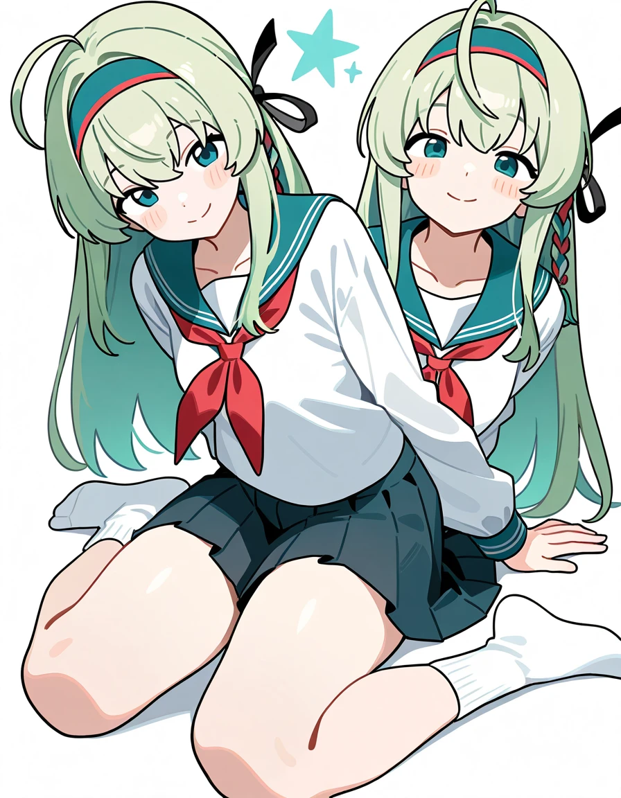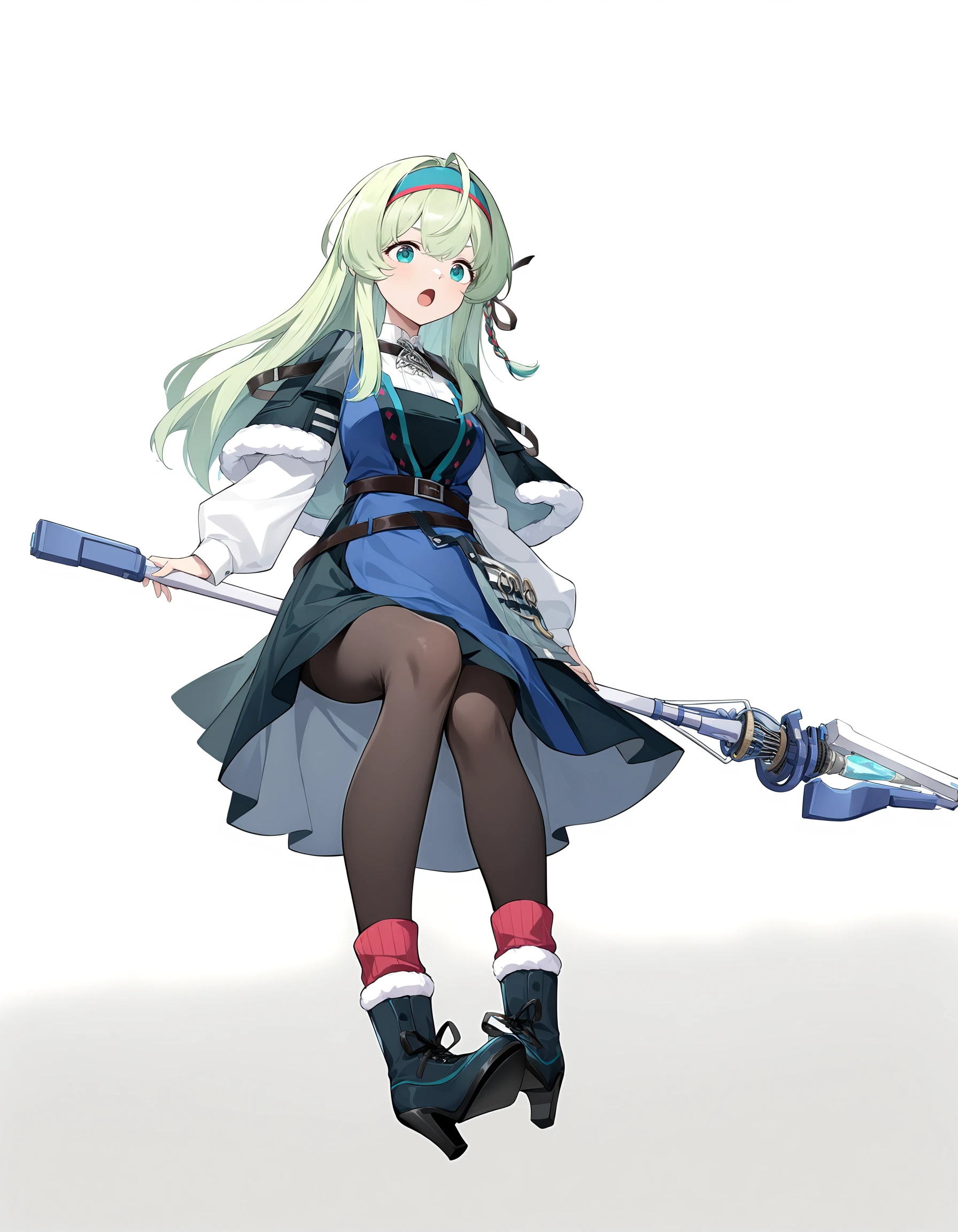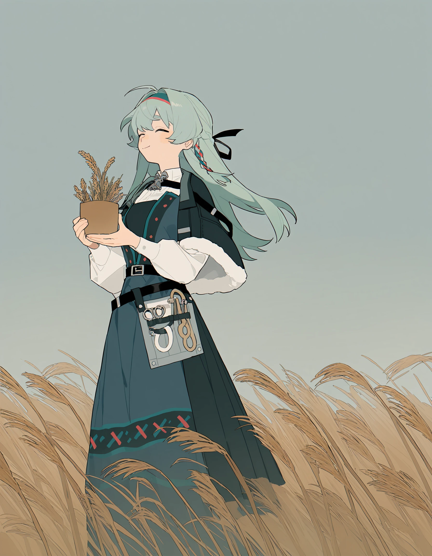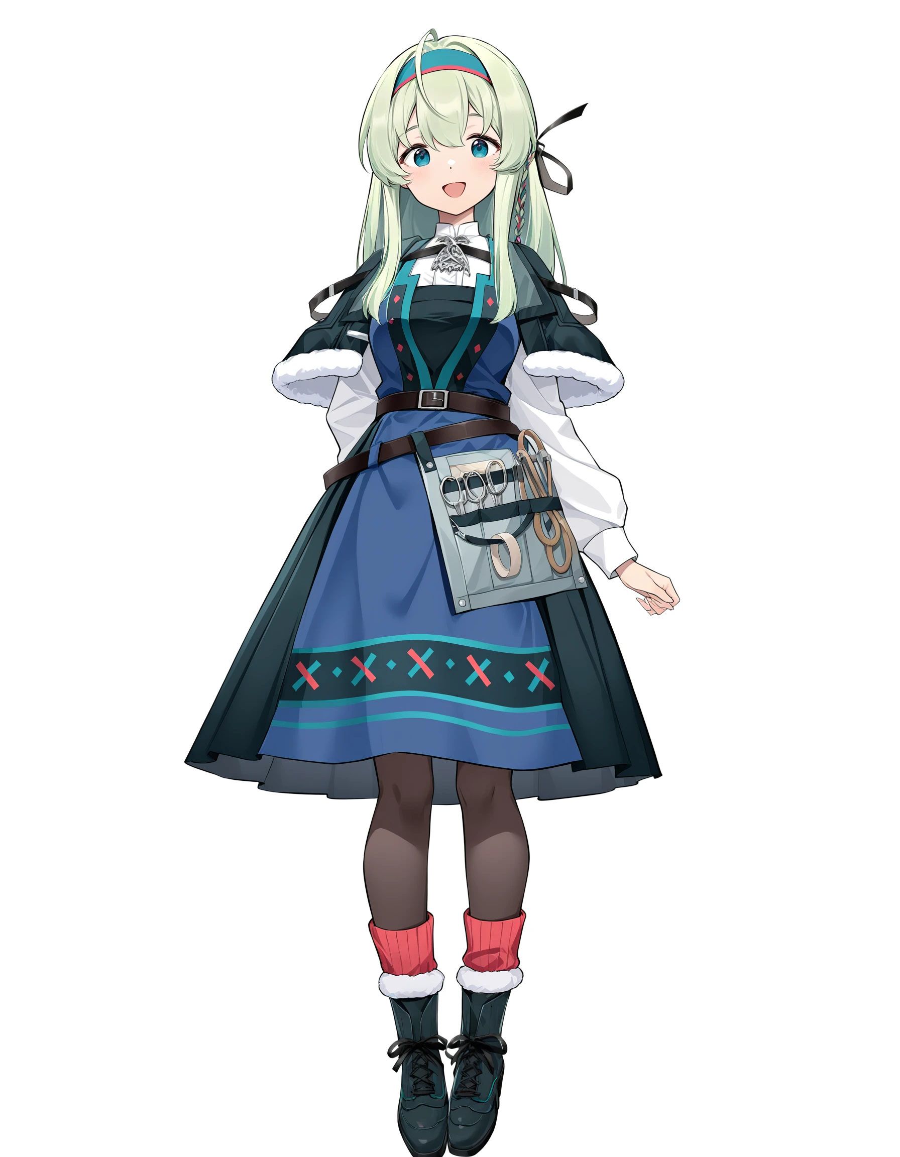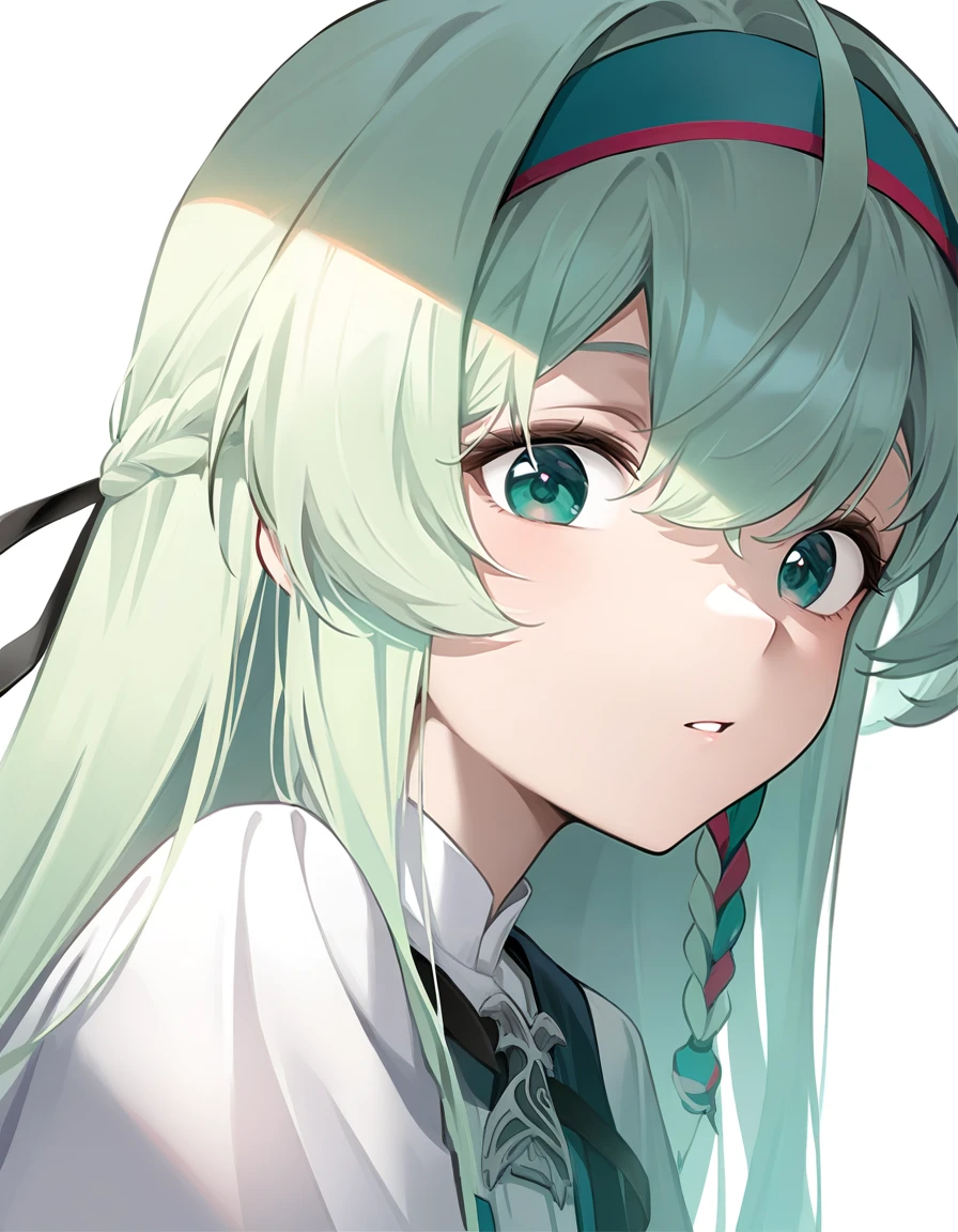 thrud-lei,1girl,solo,long hair,green hairband,green eyes,long sleeves,belt,green hair,white shirt,shirt,braid,capelet,dress,ribbon,hair ribbon,bangs,ahoge,