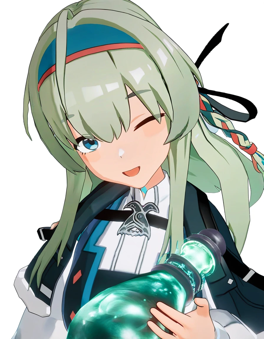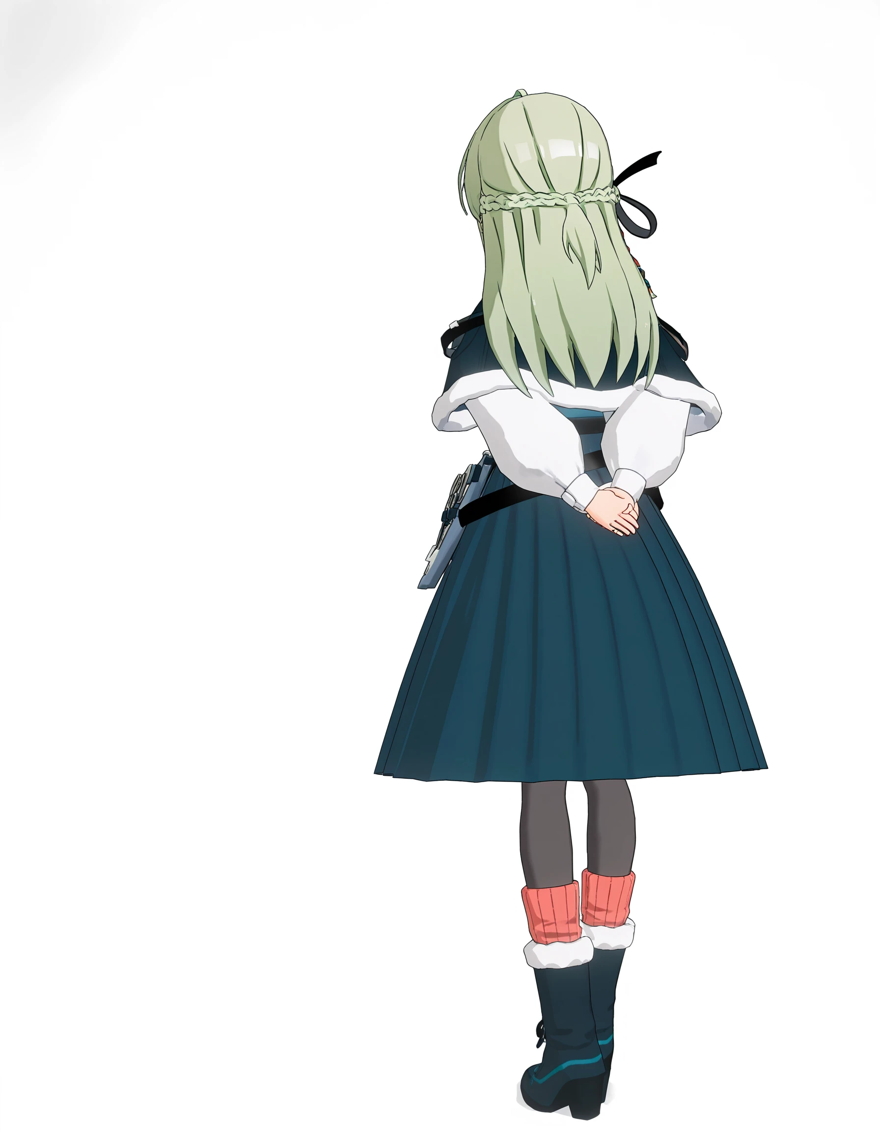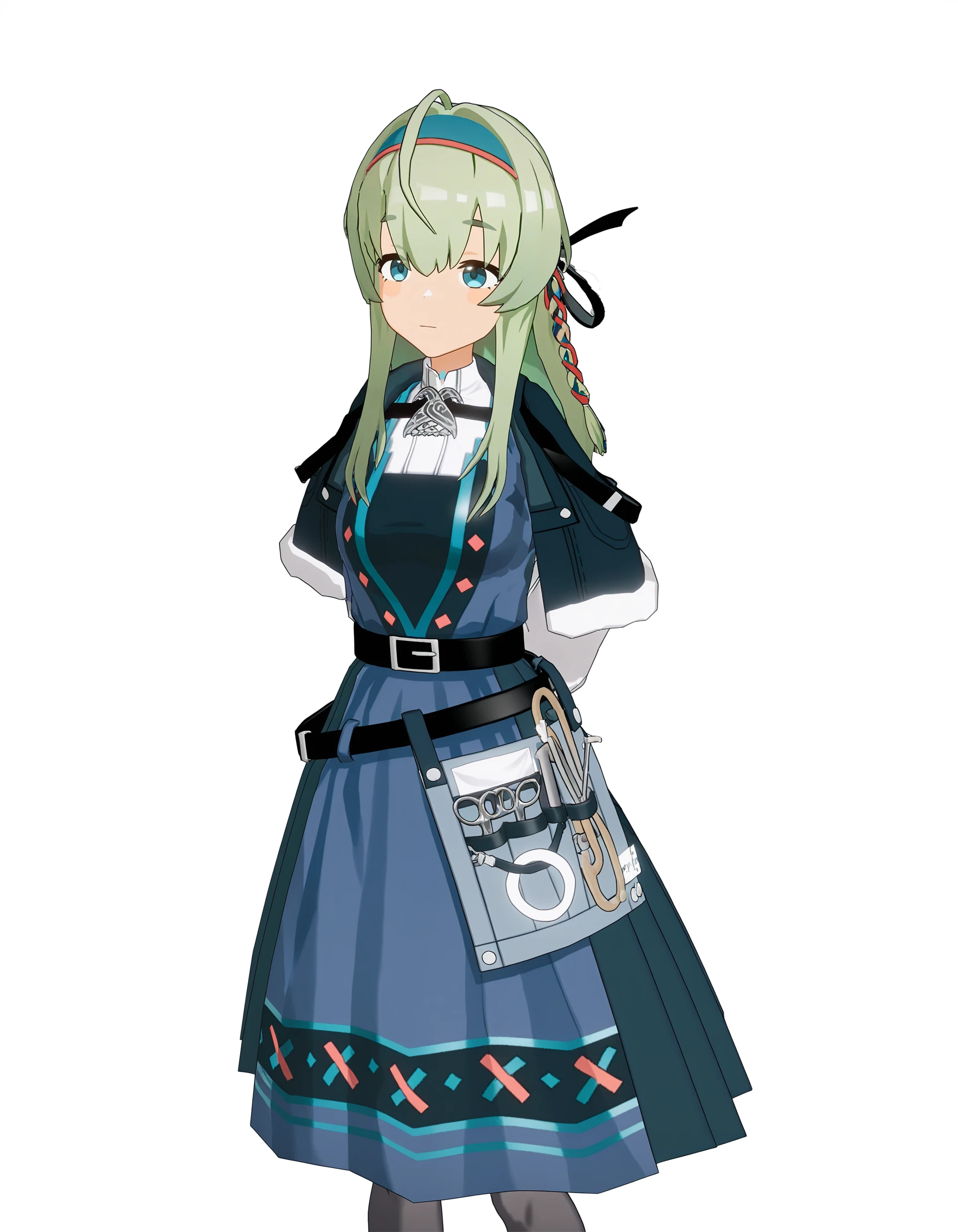 thrud-lei,1girl,solo,long hair,hairband,long sleeves,belt,green hair,white shirt,shirt,braid,capelet,dress,ribbon,hair ribbon,bangs,ahoge,可选风格 强调建模画风: