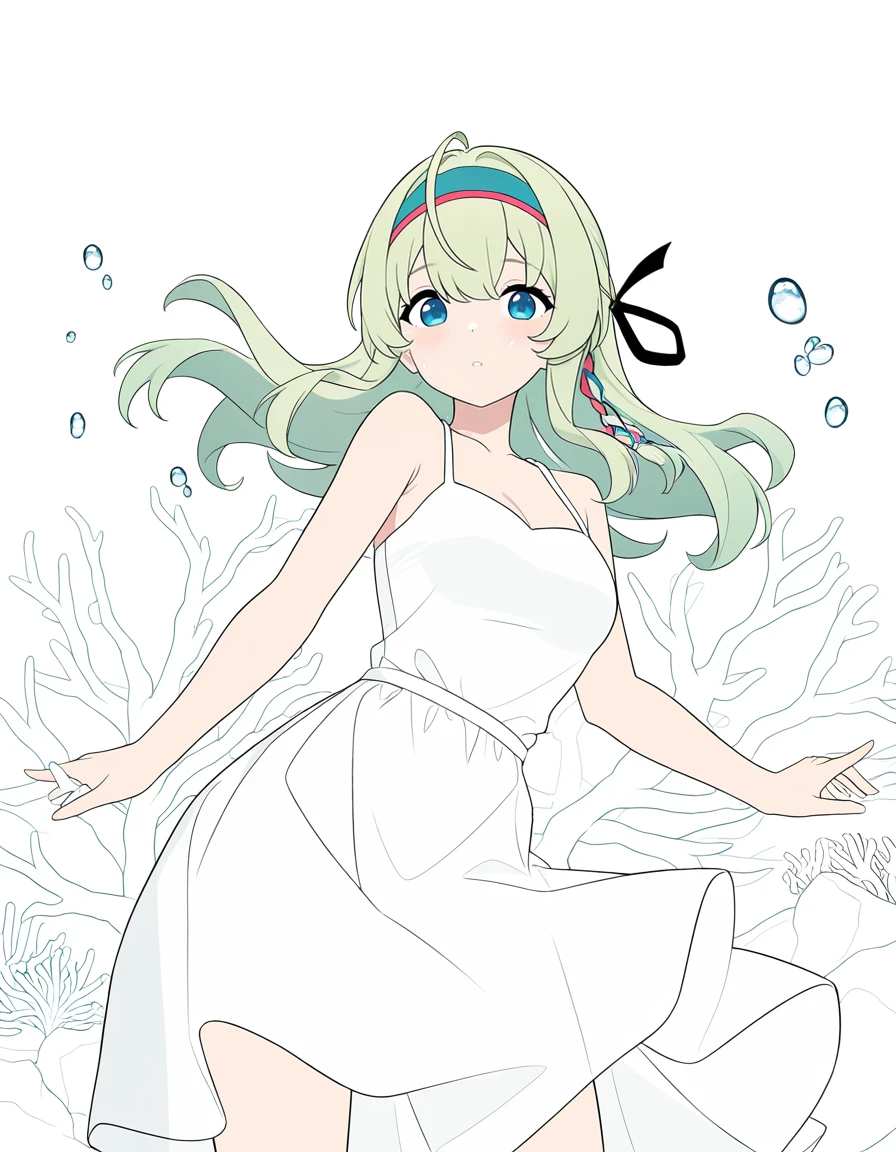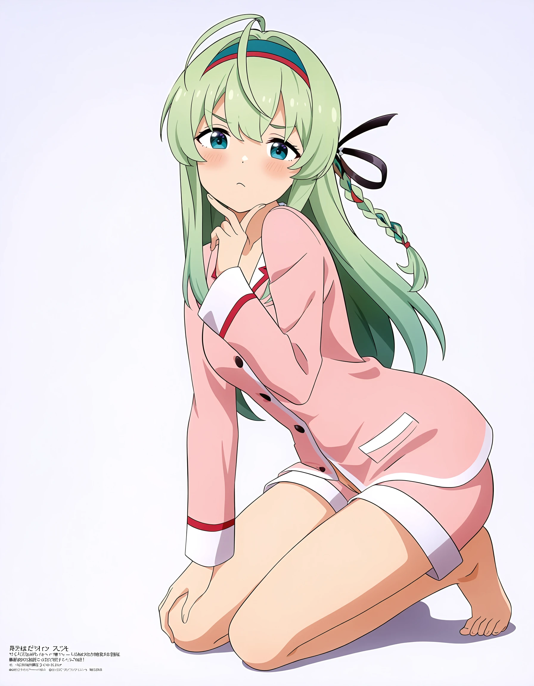 thrud-lei,1girl,solo,long hair,hairband,long sleeves,belt,green hair,white shirt,shirt,braid,capelet,dress,ribbon,hair ribbon,bangs,ahoge,Optional styles Emphasis on modeling style: