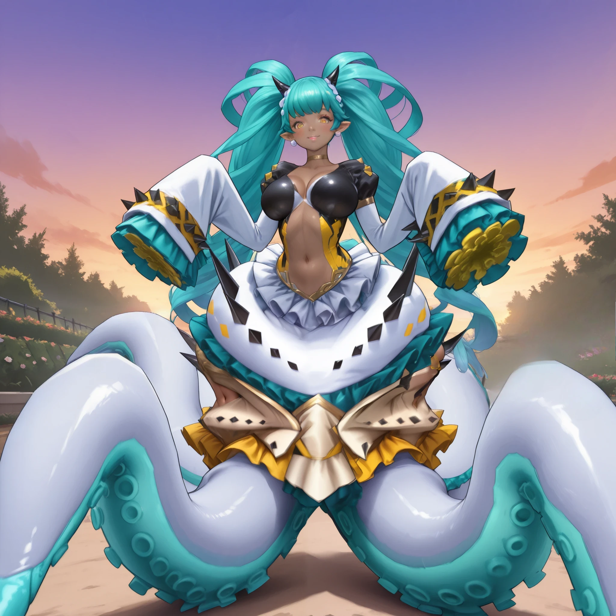Trigger words: Scylla, monster girl, octopus girl, horns, hair ornaments, bangs, long hair, absurdly long hair, twintais, drill hair, frills, yellow eyes, lipstick, makeup, pointy ears, pearl earings, choker, cleavage, long sleeves, sleeves past wrists, navel, spikes, tentacles,