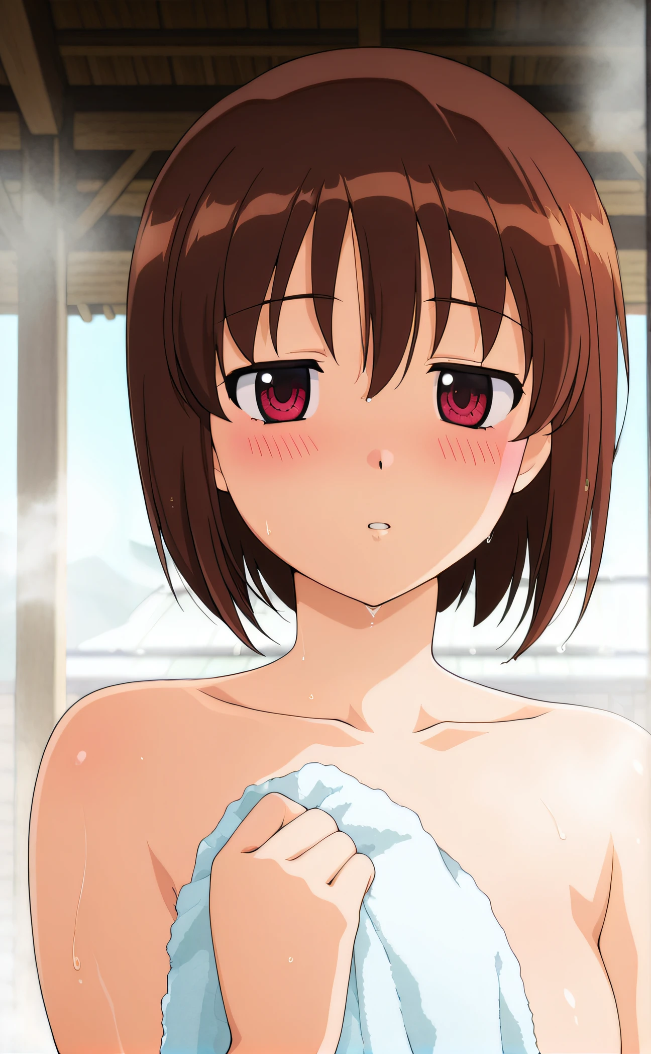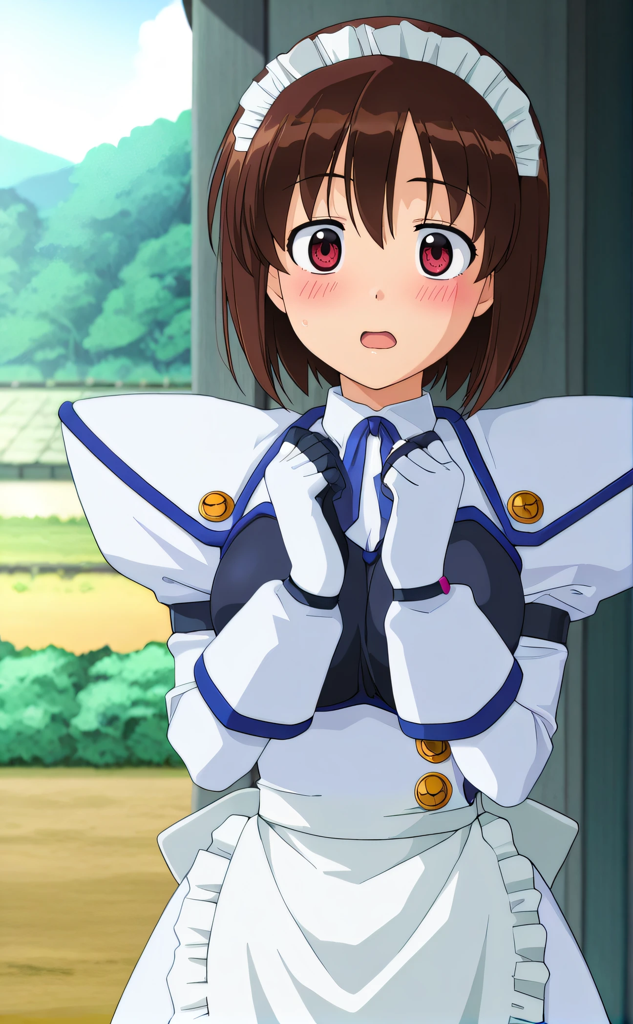 saki, brown hair, red eyes, madi headdress, juliet sleeves, dress, white apron, white gloves, black fingers