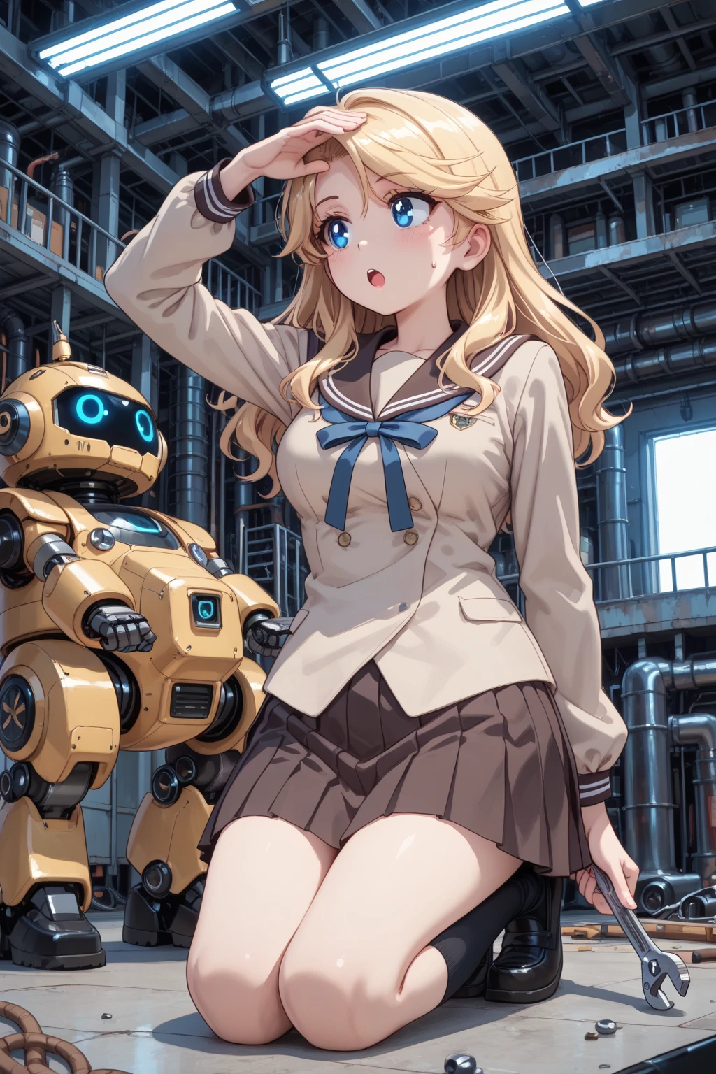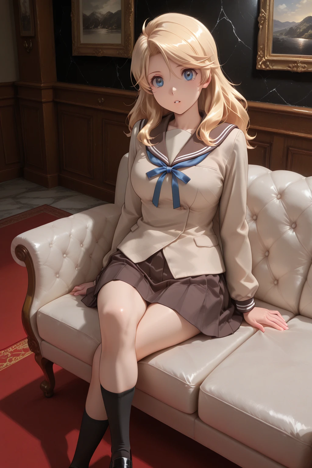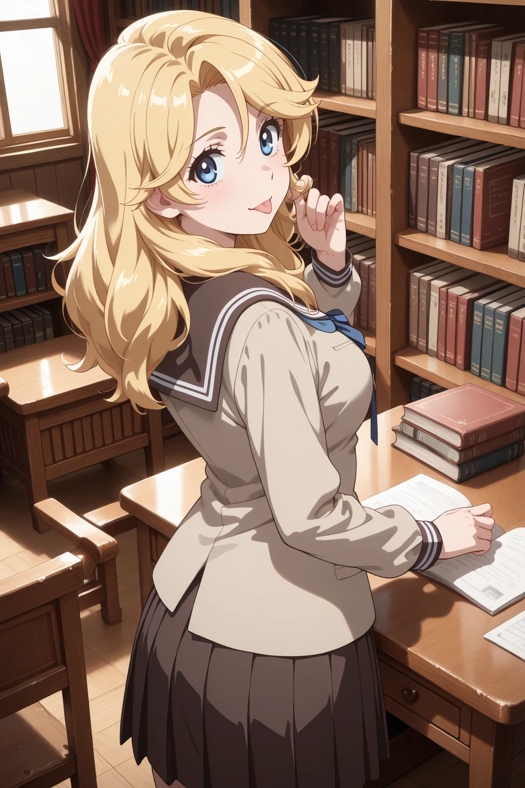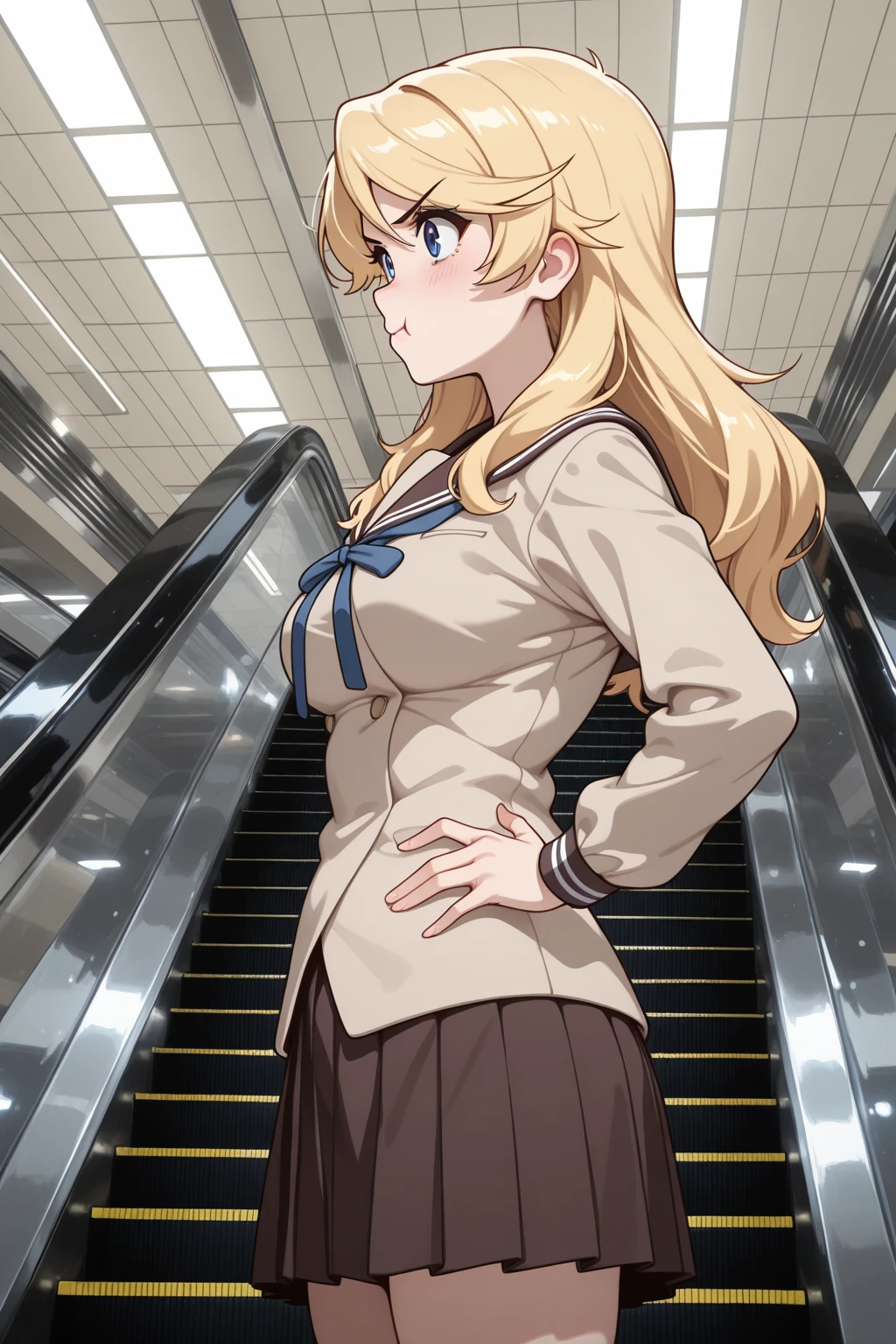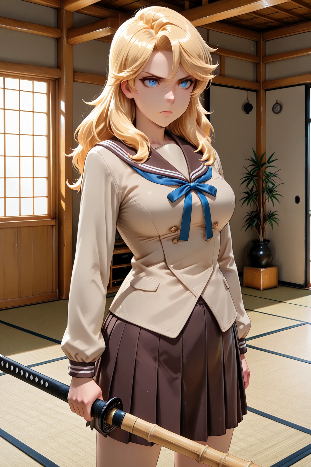 M_Sandy, blonde hair, long hair, swept bangs, blue eyes, school uniform, serafuku, brown shirt, long sleeves, brown sailer collar, blue neck ribbon, brown skirt, pleated skirt