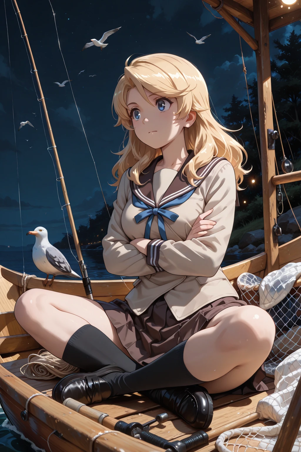 Trigger word: M_Sandy, blonde hair, long hair, swept bangs, blue eyes, school uniform, serafuku, brown shirt, long sleeves, brown sailer collar, blue neck ribbon, brown skirt, pleated skirtAddition: black socks, black loafersDescription