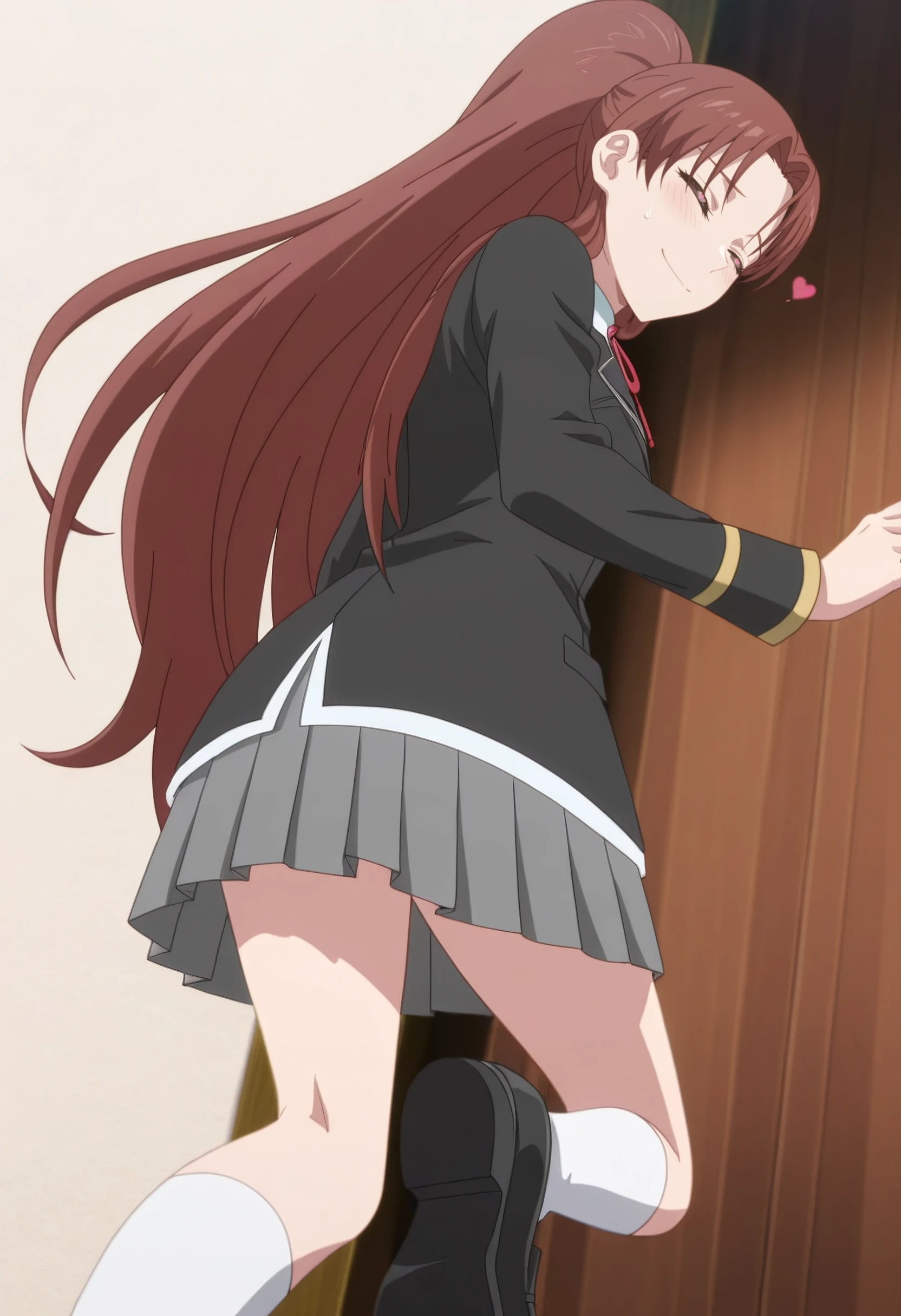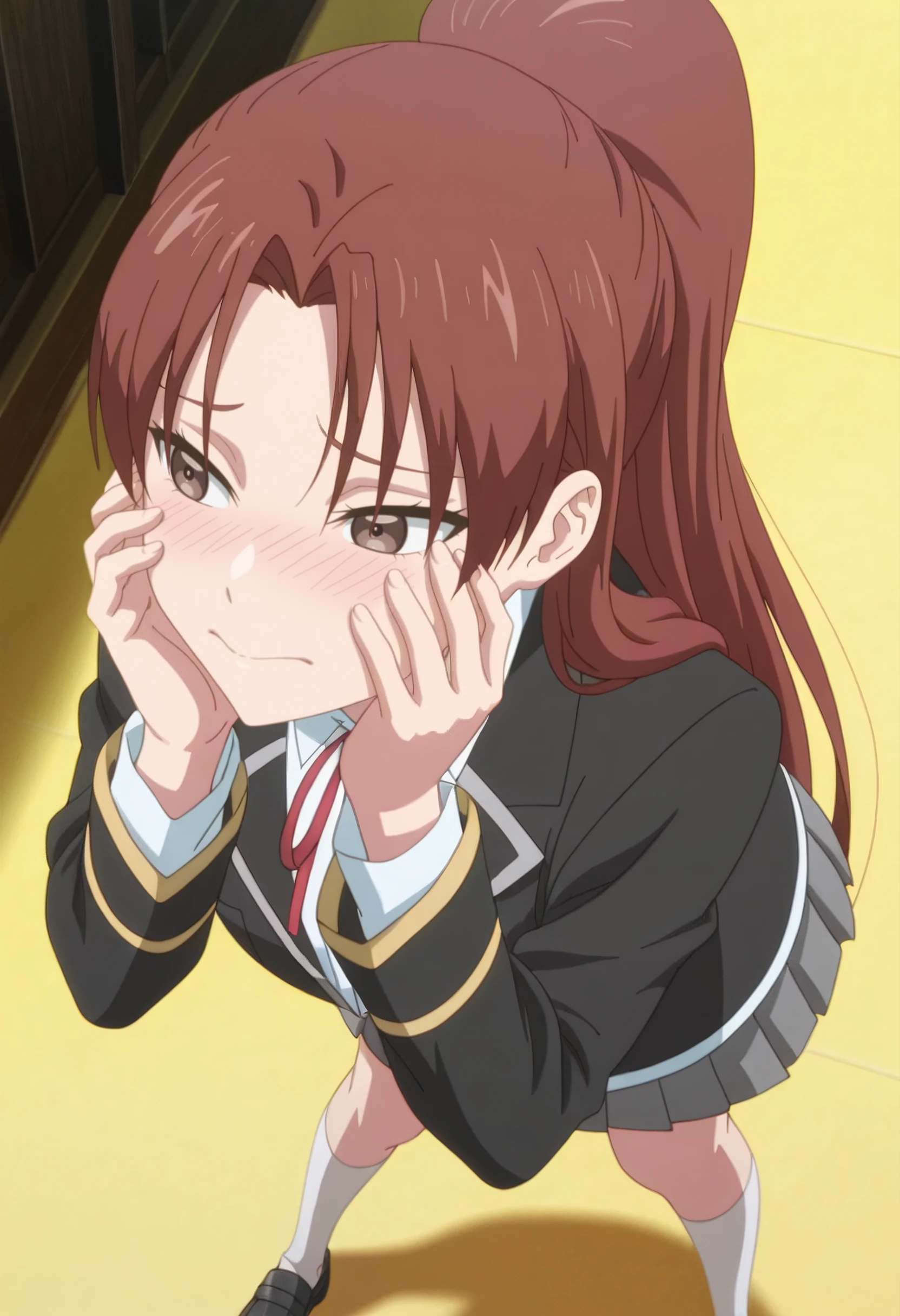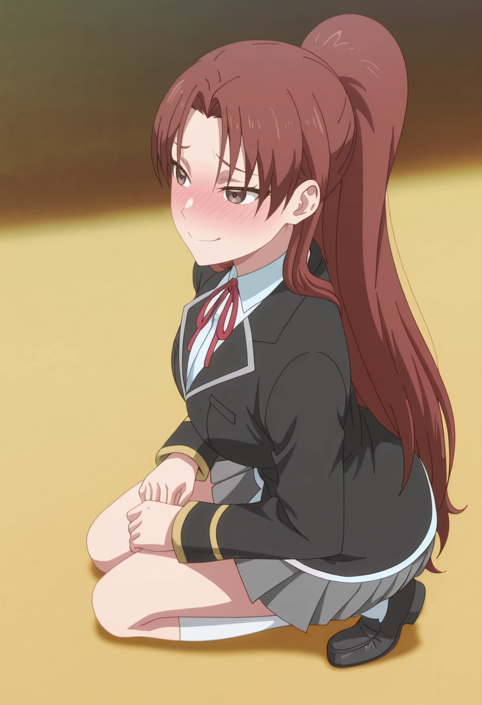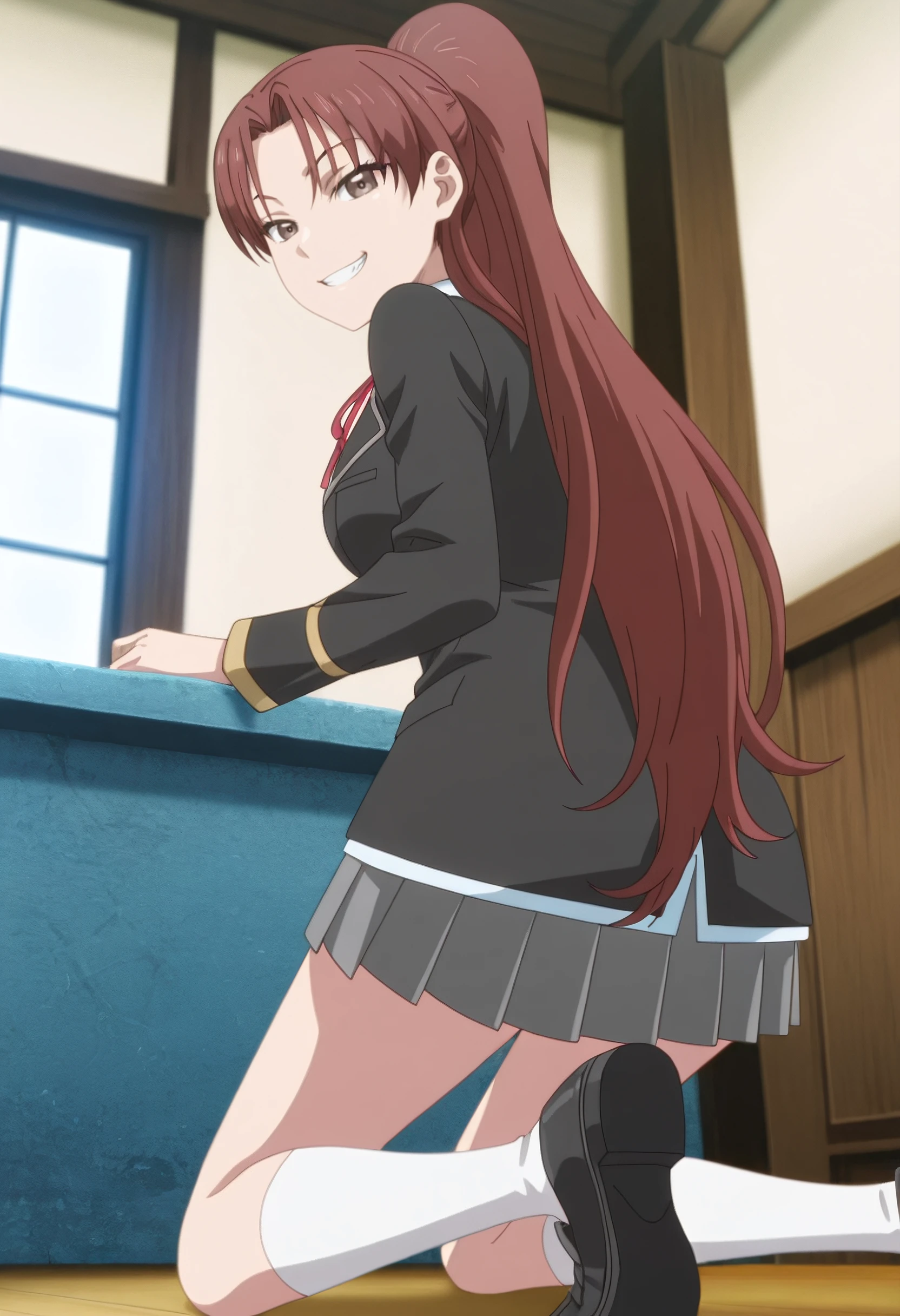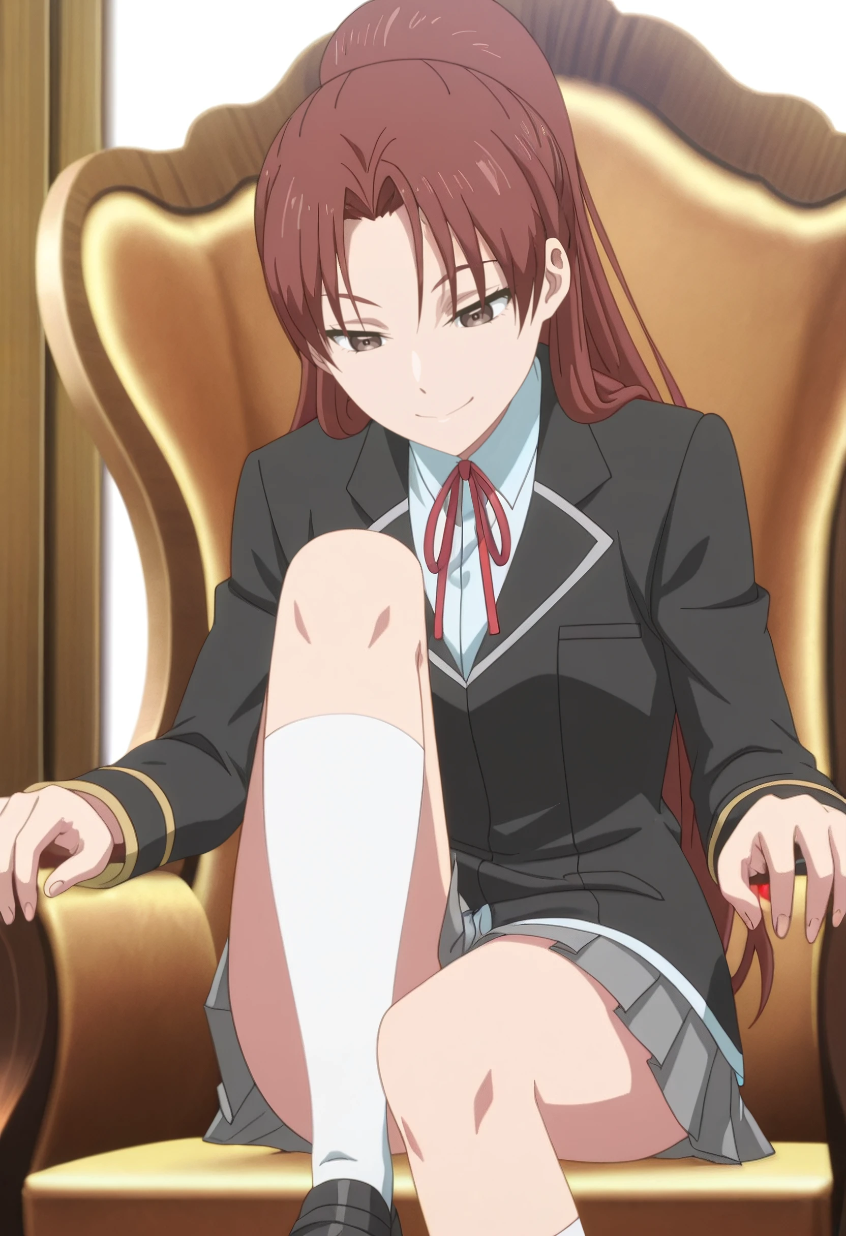 JennaSchool, school uniform, blazer, black jacket, red ribbon, neck ribbon, white shirt, grey skirt, pleated skirt, long sleeves, white socks, collared shirt, kneehighs, shoes, loafers, black footwear, miniskirt,