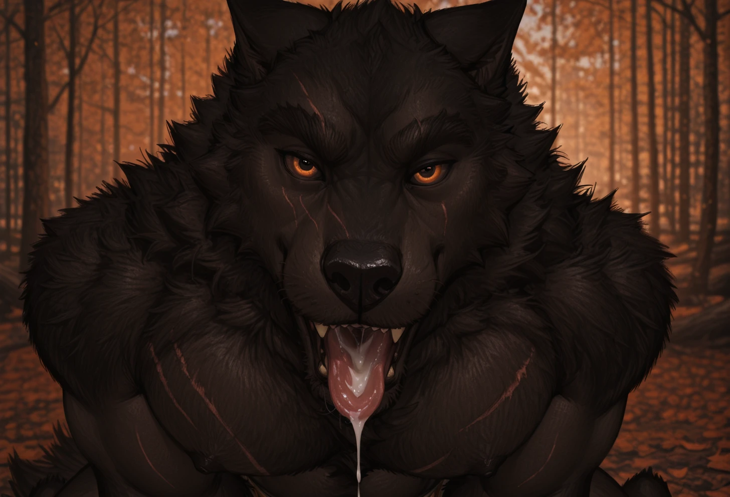 bedroom eyes, detailed eyes, perfect eyes, beautiful eyes, detailed fur, eyes, realistic fur, solo, young, (((handsome, detailed face and eyes))), realistic eyes, furry male, furry, anthro, 1boy, mature male, male, muscular build, anthro, wolf, black fur, animal ears, orange eyes, glowing eyes, bara, pectorals, pecs, scar, scars, loincloth, tribal clothing, noakai, noakai_moontouched, male focus, nipples, muscular male, muscular, body fur, wolf boy, pectorals, colored sclera, coloured sclera, eye shine, detailed face, glowing eyes,