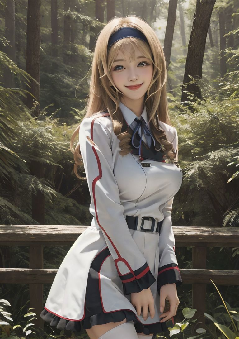 blue leotard, pilot suit, halterneck, bare shoulders, covered navel, white thighhighs