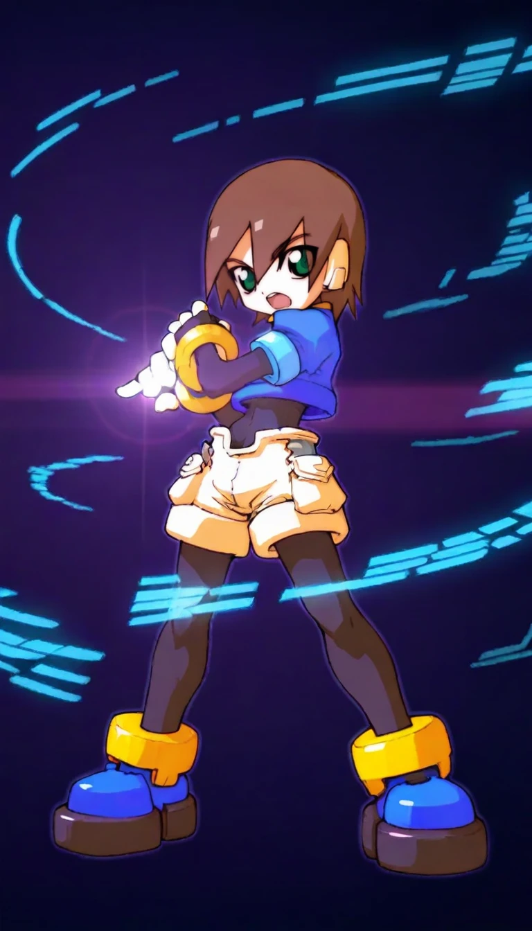 a1le, 1girl, solo, brown hair, short hair, bangs, ear accessory, green eyes, black bodysuit, blue top, yellow bracelet, white shorts, black tights, blue boots,