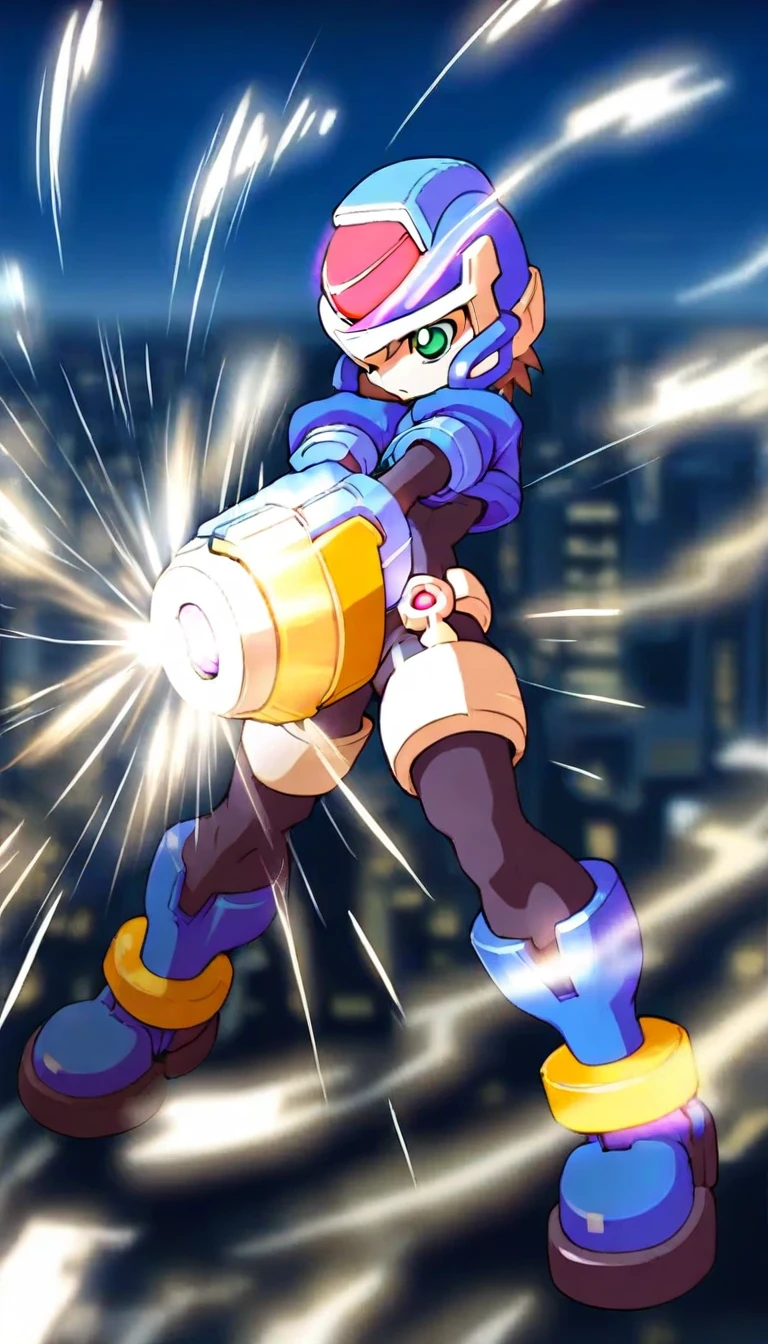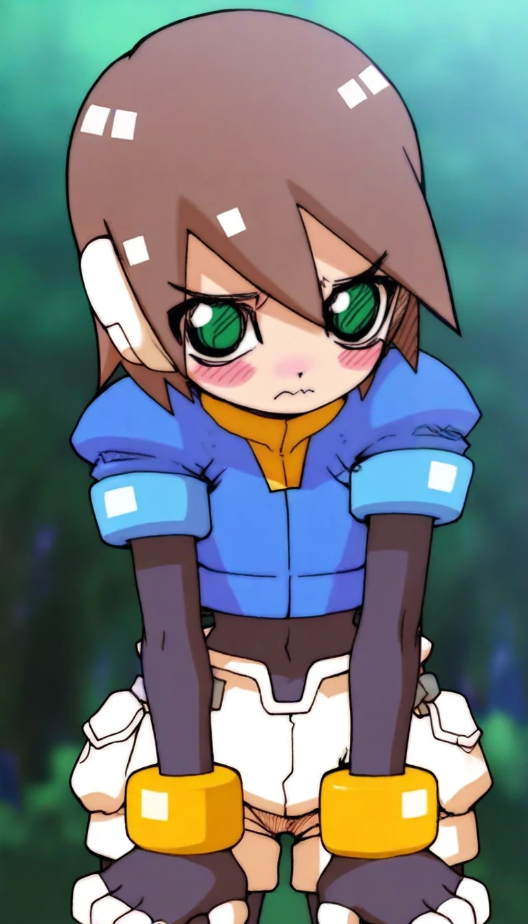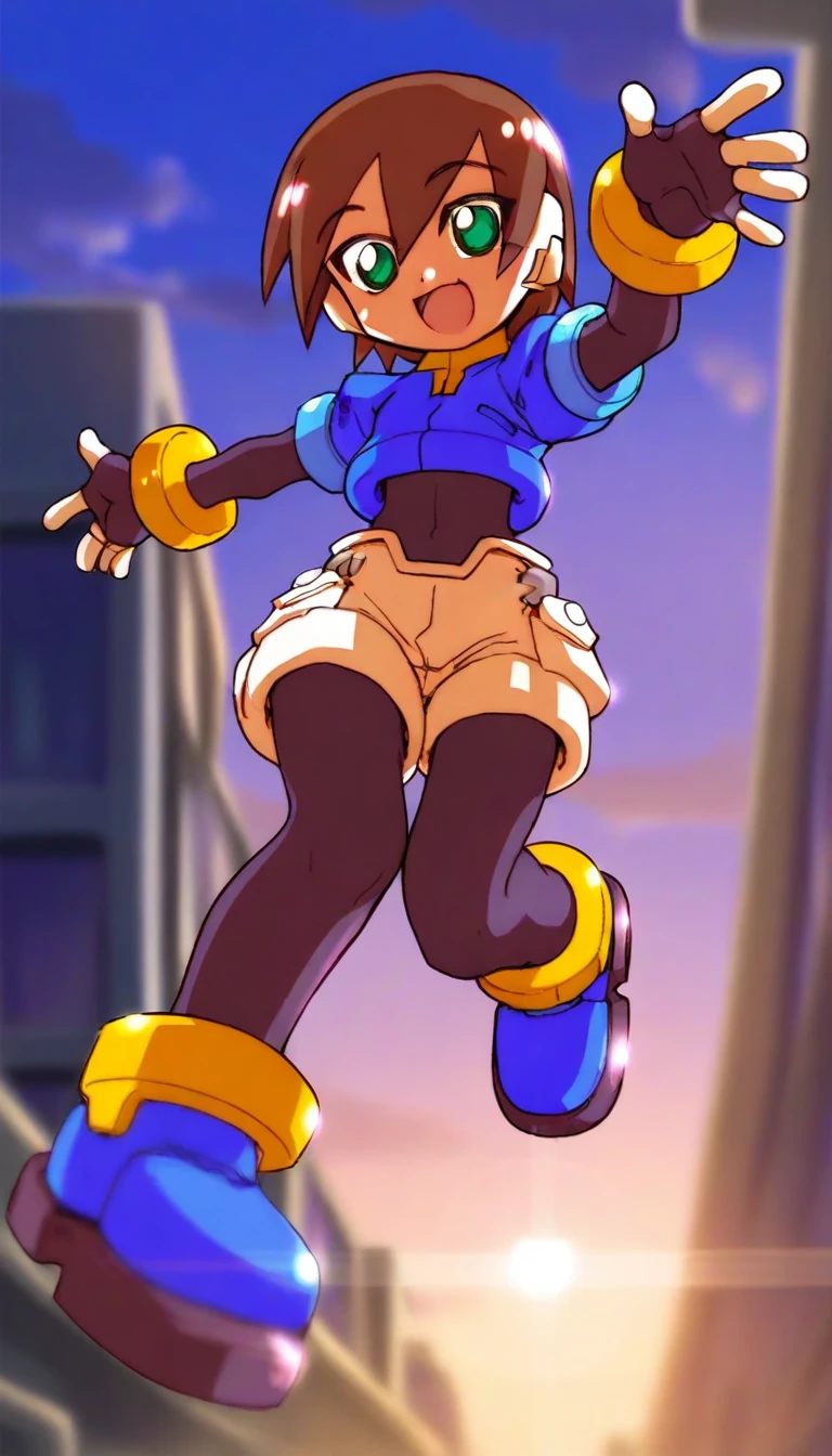 a1le, 1girl, solo, brown hair, blue helmet, green eyes, black bodysuit, blue top, blue hand guard, white shorts with red gems, handcannon, black tights, white leg guards, blue knee boots,