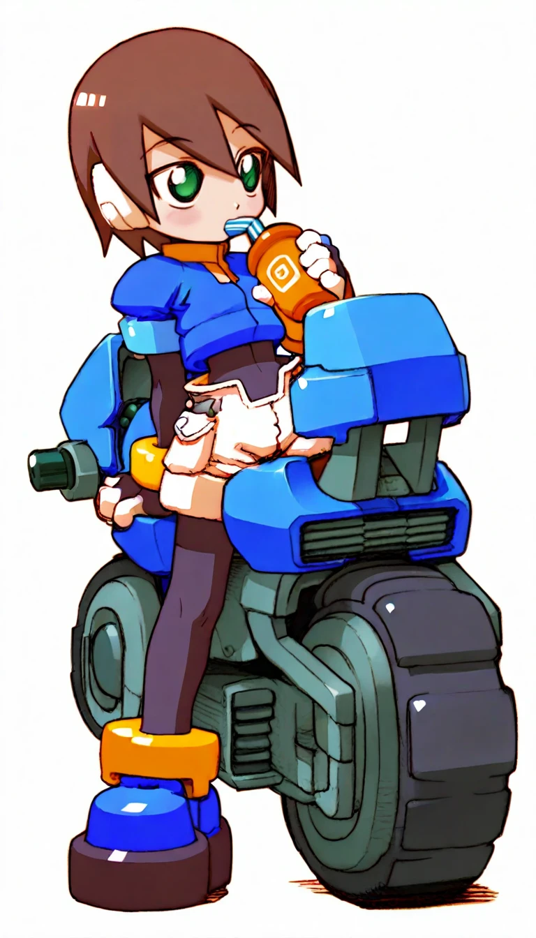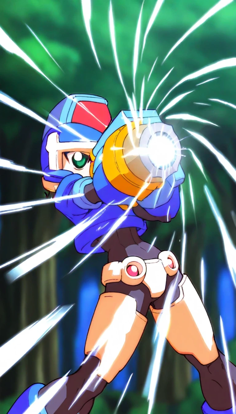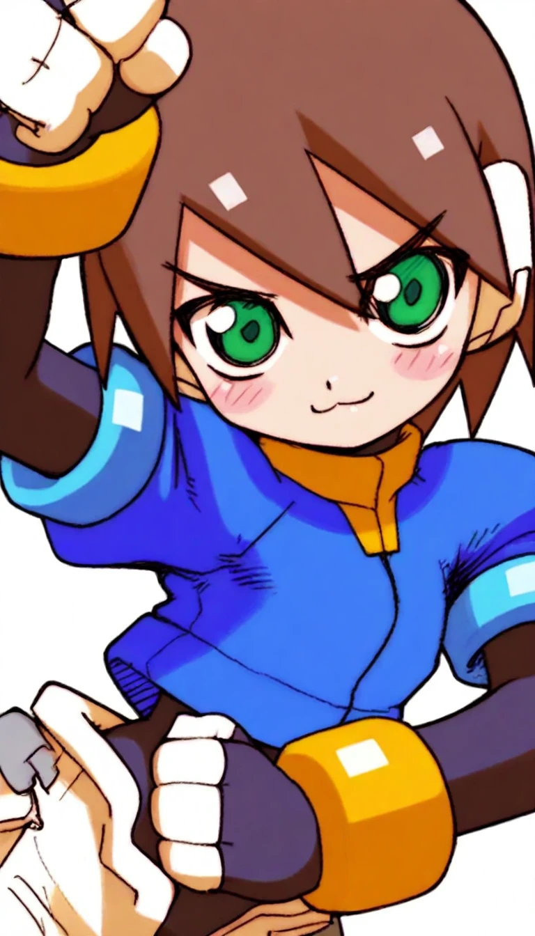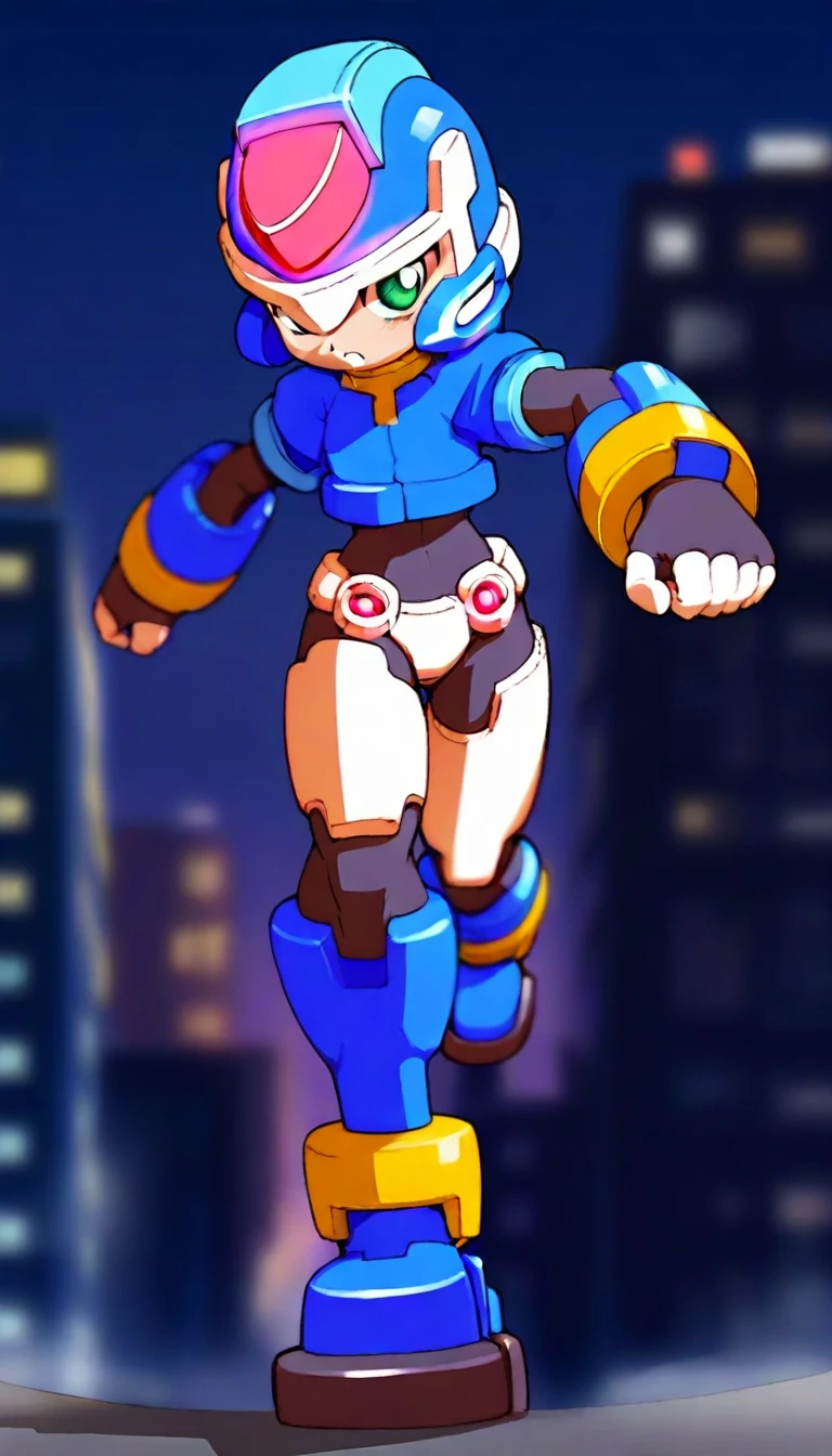 a1le, 1girl, solo, brown hair, blue helmet, green eyes, black bodysuit, blue top, blue hand guard, white shorts with red gems, handcannon, black tights, white leg guards, blue knee boots,