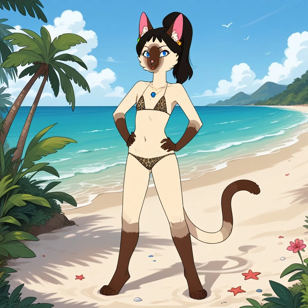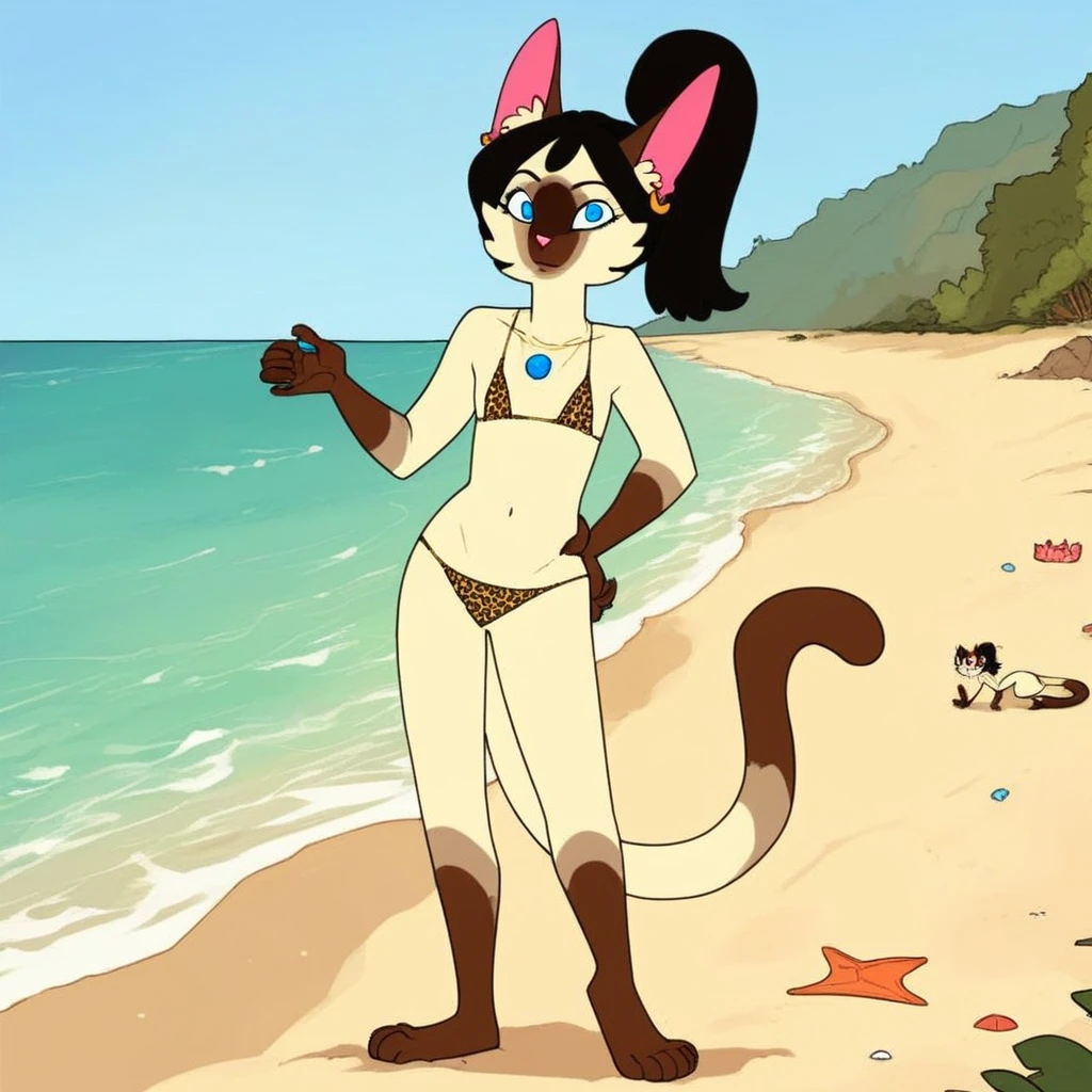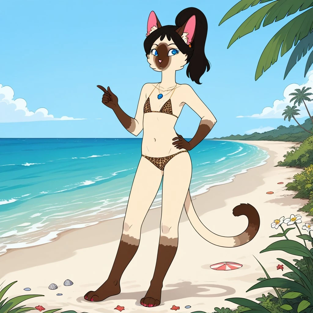 cat, catgirl, siamese cat, tan and brown fur, black hair, ponytail, blue eyes, brown ears, pink nose, cat tail, dipstick tail,