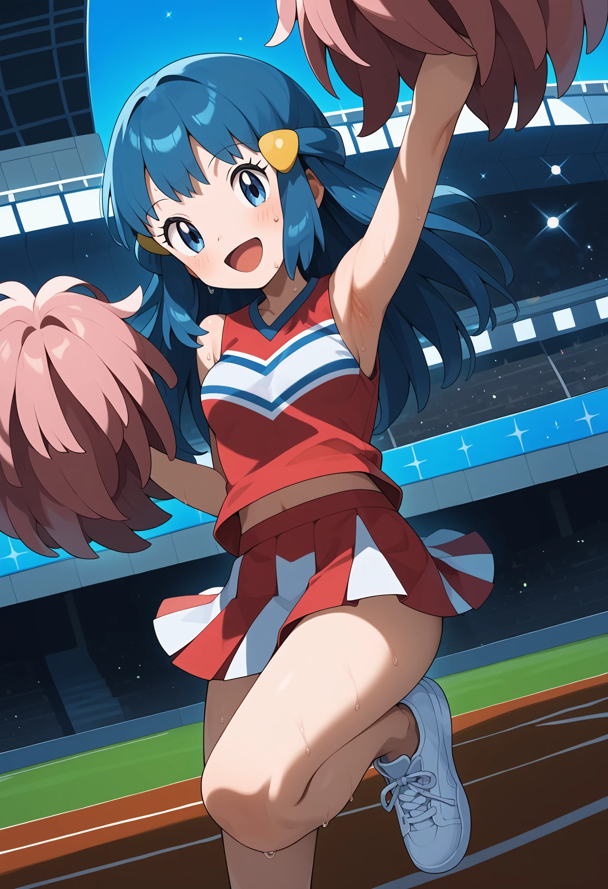 outfit4aadawn, long hair, blue hair, hair ornament, blue eyes, breasts, cheerleader, sleeveless shirt, red shirt, pom pom (cheerleading), multicolored skirt, red skirt