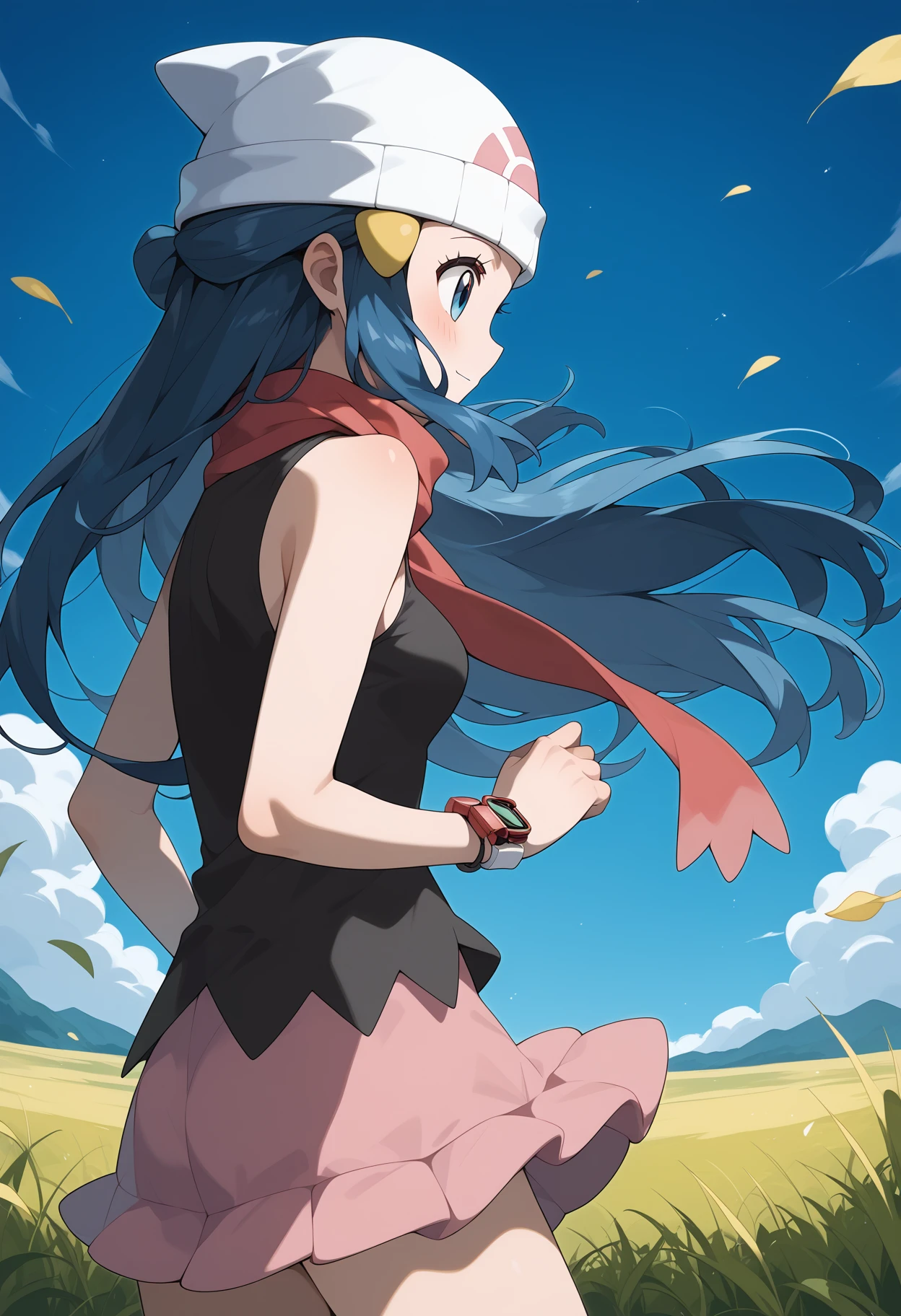 outfit1aadawn, long hair, blue hair, beanie, white headwear, hair ornament, blue eyes, breasts, red scarf, sleeveless shirt, black shirt, wristwatch, bracelet, pink skirt