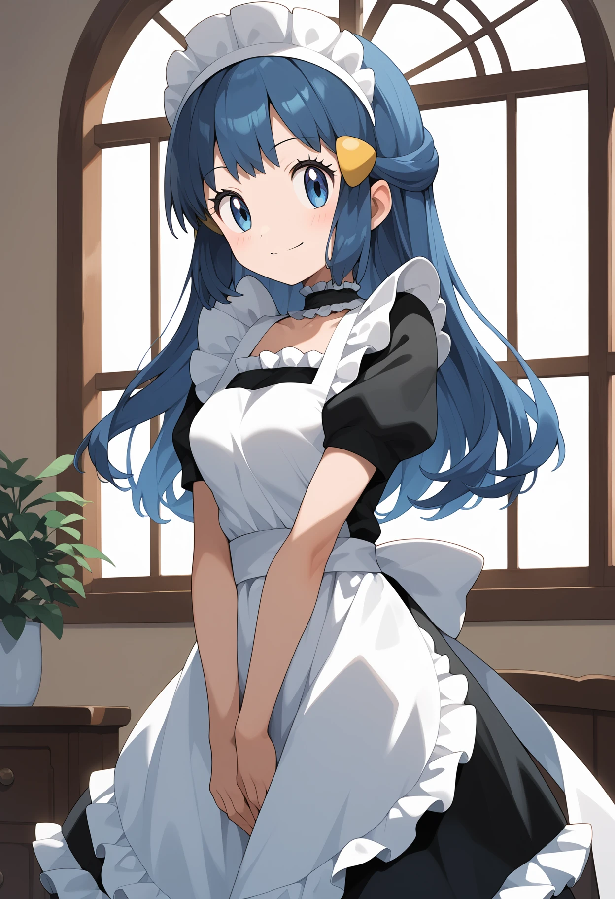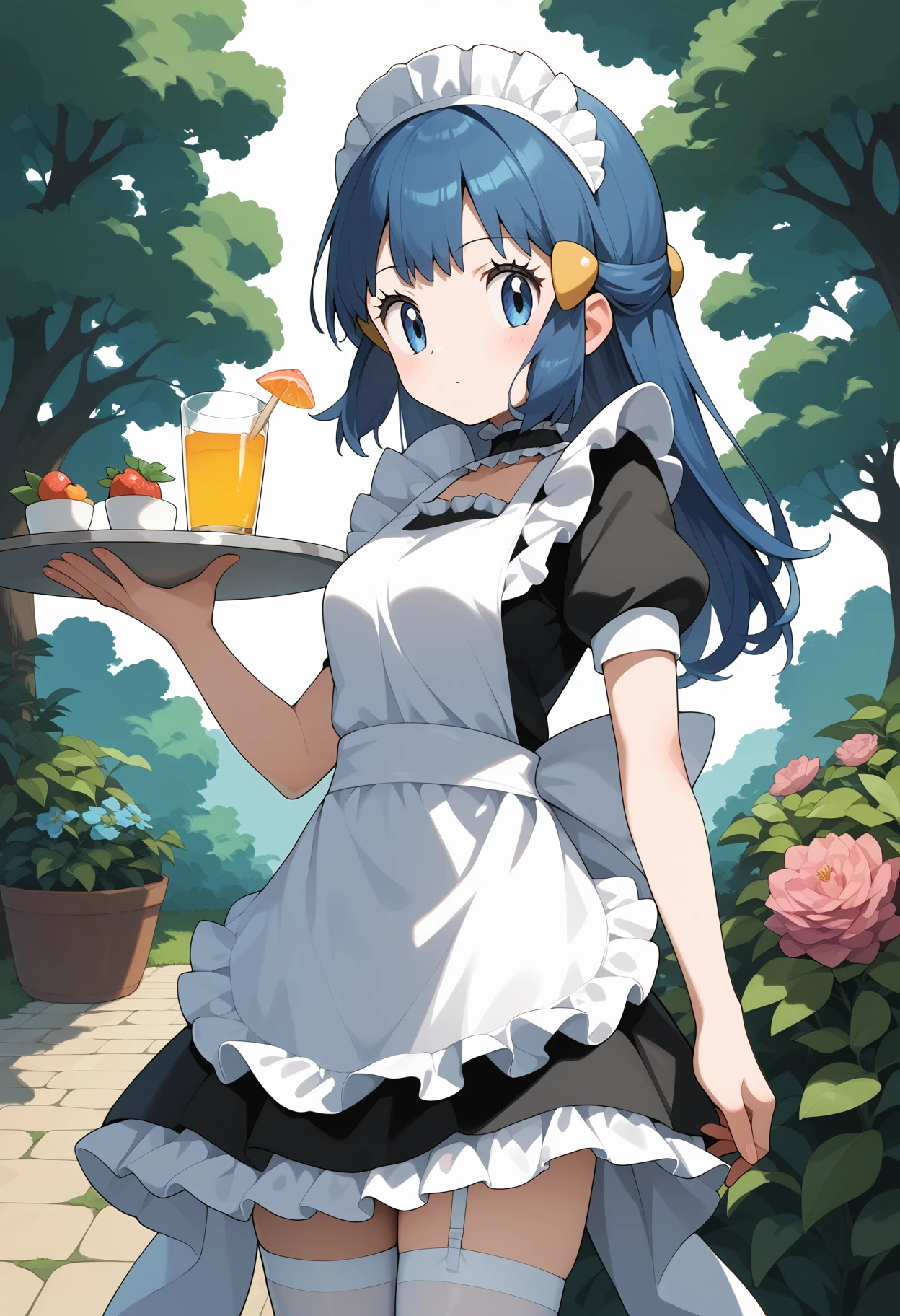 outfit3aadawn, long hair, blue hair, maid headdress, hair ornament, blue eyes, breasts, maid, frills, black dress, short sleeves, white apron, white thighhighs
