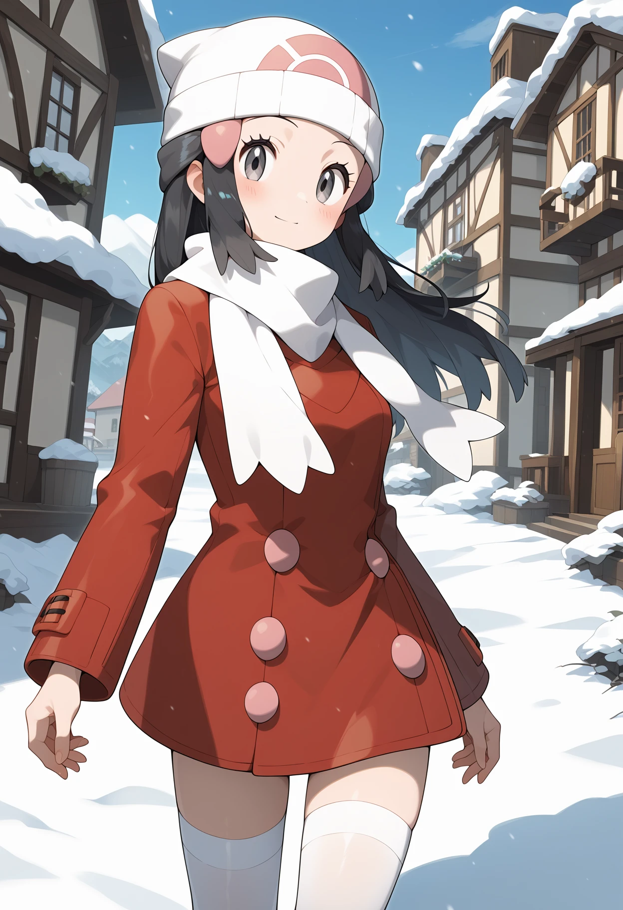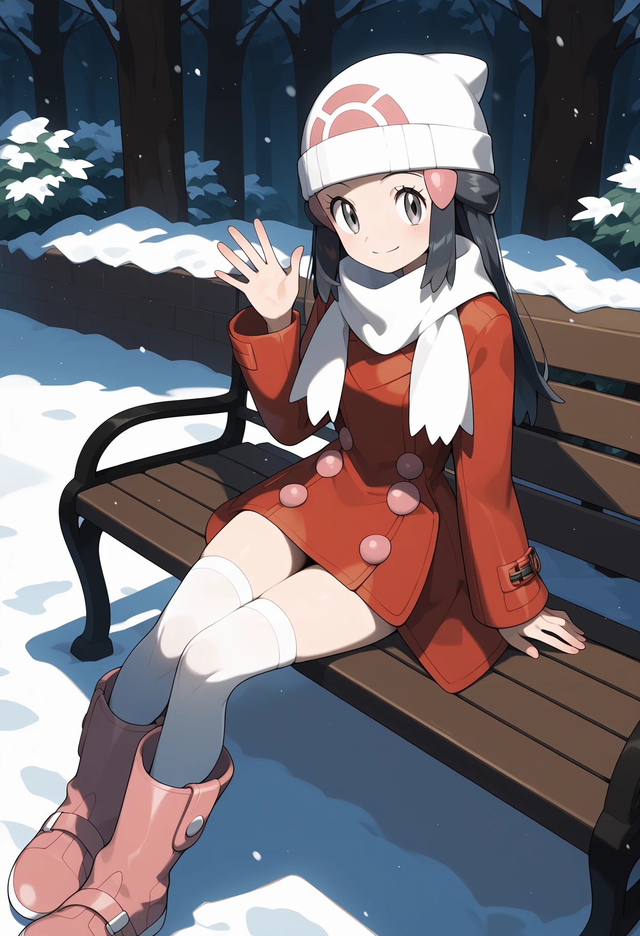outfit2aadawn, long hair, black hair, beanie, white headwear, hair ornament, grey eyes, breasts, white scarf, red coat, long sleeves, white thighhighs